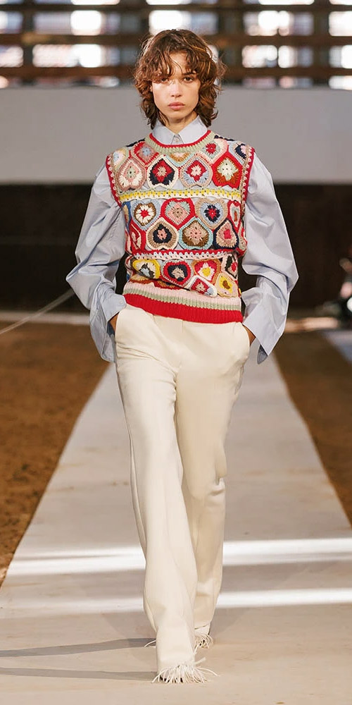 デザイナー自身のストーリーを反映したノスタルジックなコレクションが目立っていた今シーズン。アイテムでは、古い引き出しから見つけたかのような田舎風ニットが印象に残った。素朴なカントリー調の模様やおじいちゃんのジレのようなピースなど、どこか温もりを感じさせる。