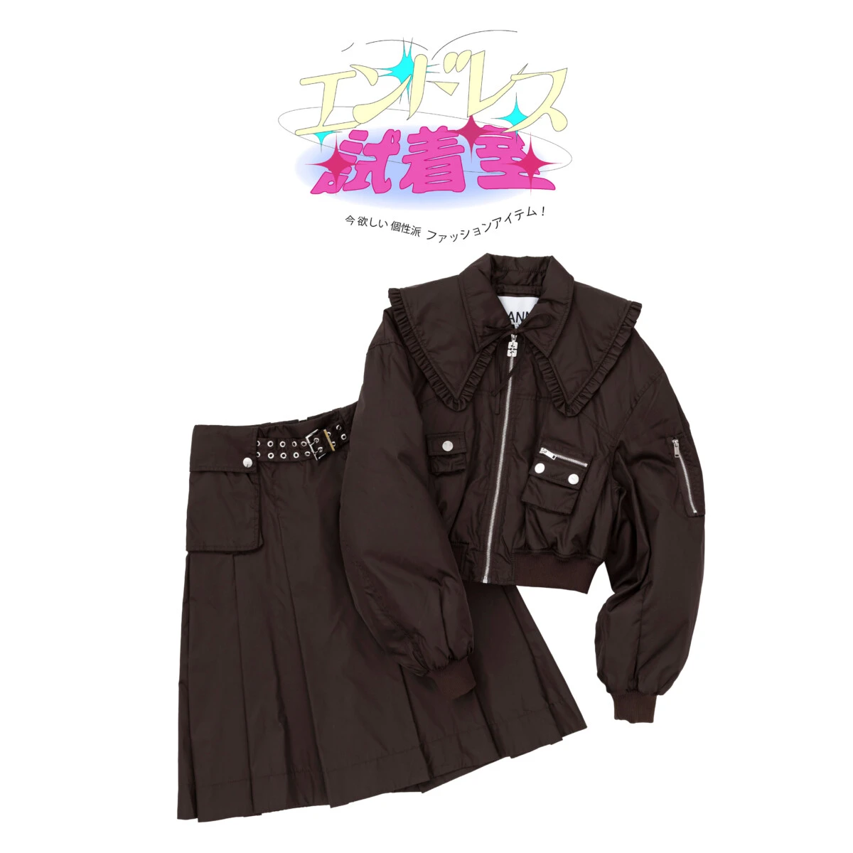 アウトドアのアクティブなイメージが加味された今シーズンは、テントからインスパイアされた機能的なルックが登場。撥水性のテクニカル素材や張りのある軽いコットン、フィッシュネットなどが使われ、ロープのディテールや釘のような留め具も印象的です。