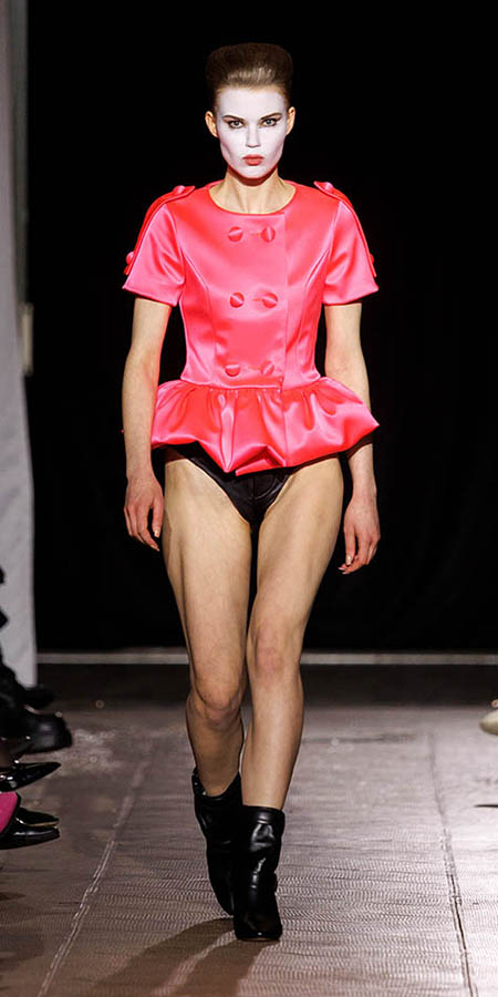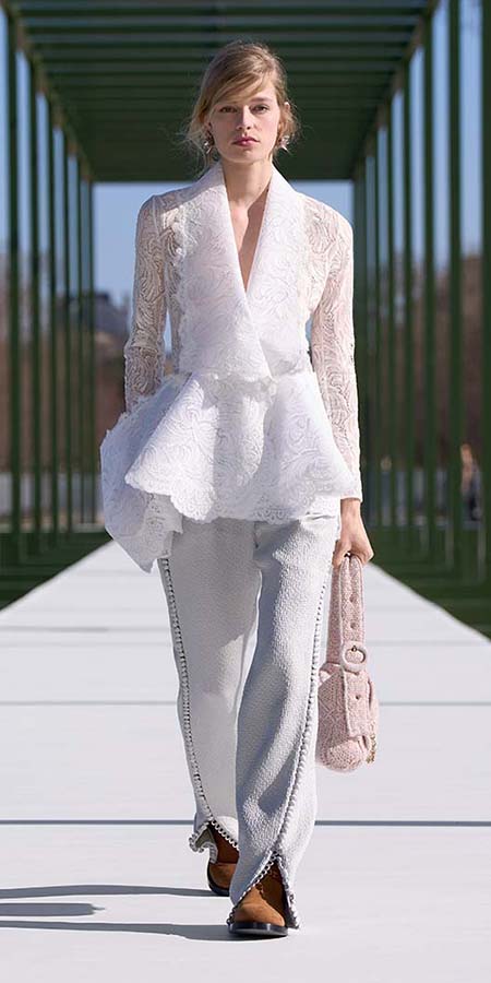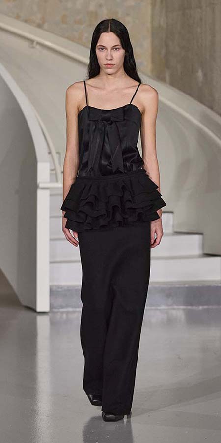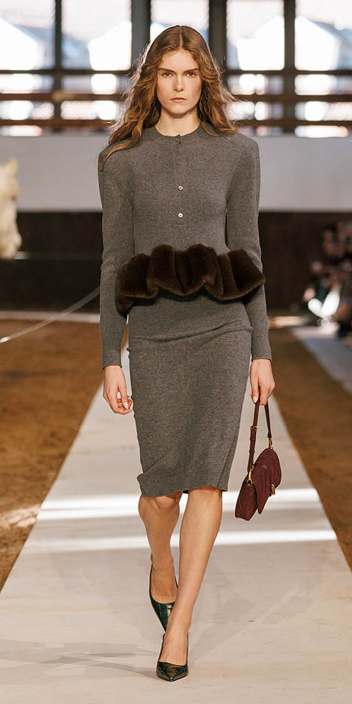 今シーズンを代表するシルエットとして、ペプラムが挙げられる。ウエストから裾へ向かって広がるフェミニンなラインが特徴で、かちっと仕立てた構築的なジャケットや繊細なレースのジャケット、ファーをトリミングしたニットのアンサンブルなど、素材やカッティングにより多彩な表情を見せている。