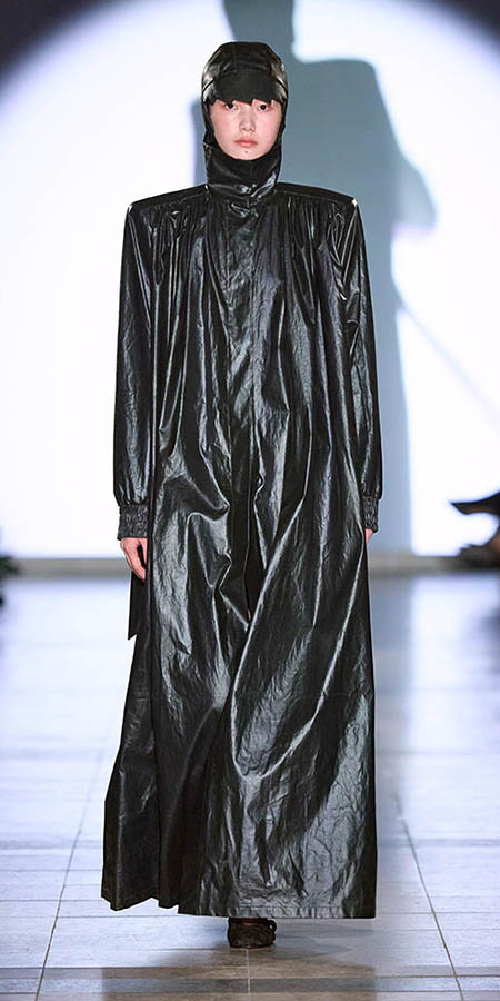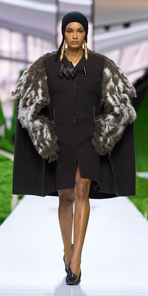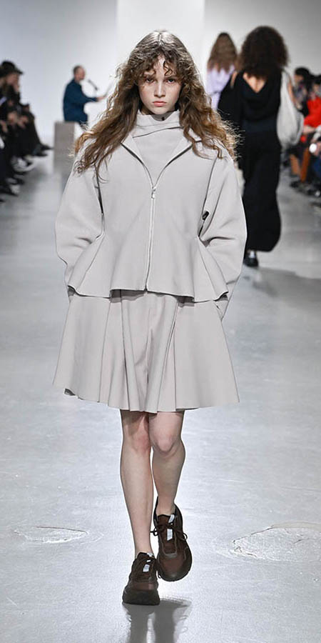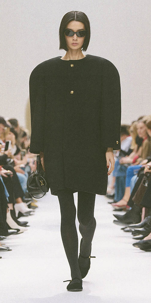 同様に、丸みを帯びたラウンドショルダーも存在感があった。主にコートなどのアウターに見られ、ラグランスリーブ、ドロップドショルダー、キモノスリーブなど、その構造は様々だが、いずれも大きな弧を描くようなフォルムになっている。