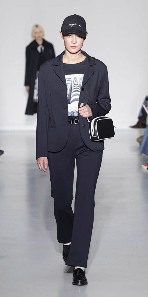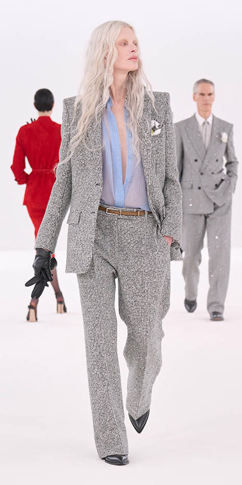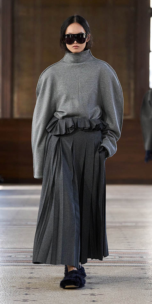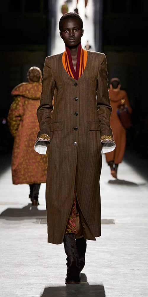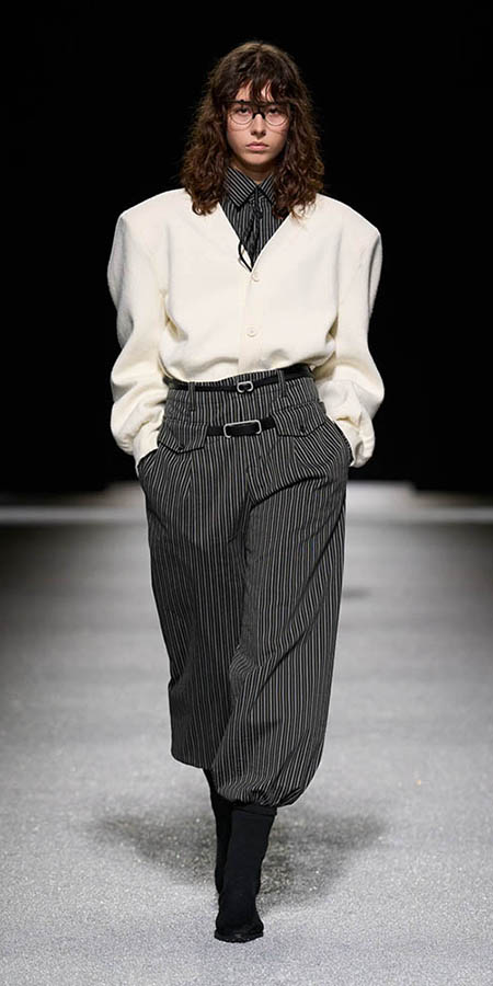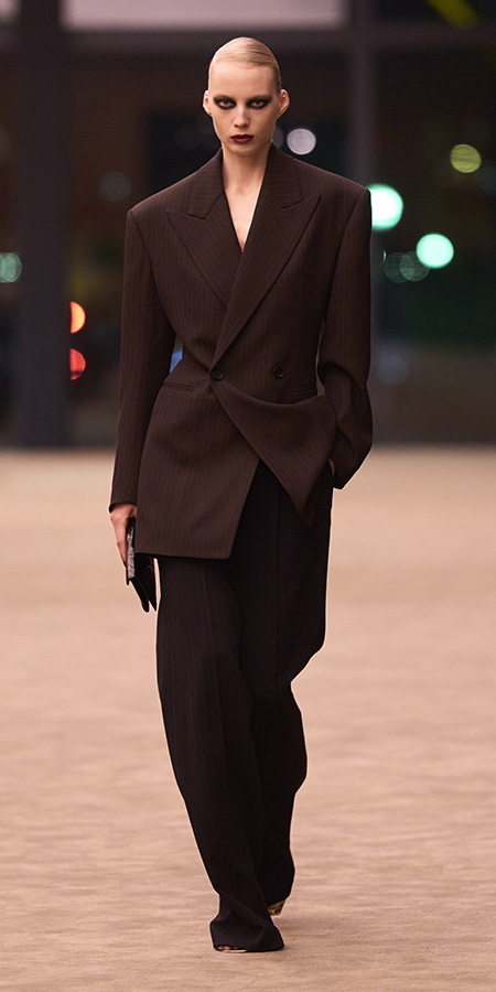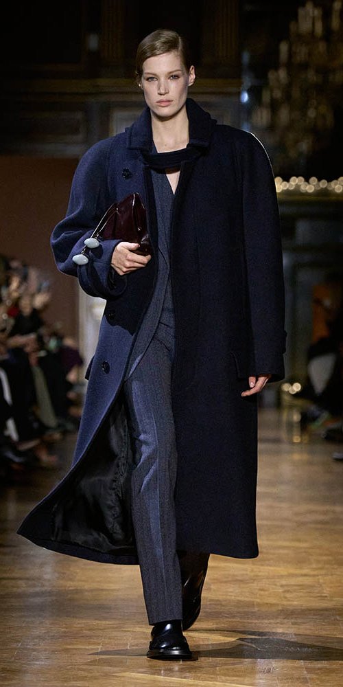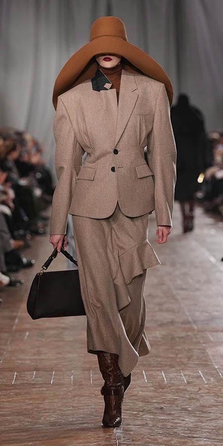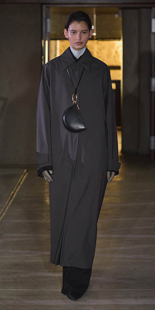 秋冬シーズン特有のボリューミーなアウターが見られた一方で、シルエット全体のスリム化も見逃せない。ワードローブに欠かせないマニッシュなスーツは、スレンダーなラインが印象的で、ボトムにはタック無しの細身のパンツ。ロングコートにおいてもすっきりとしたペンシルラインが、多くのブランドで提案された。