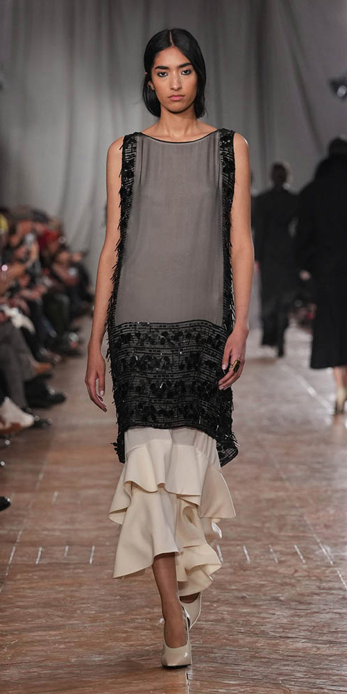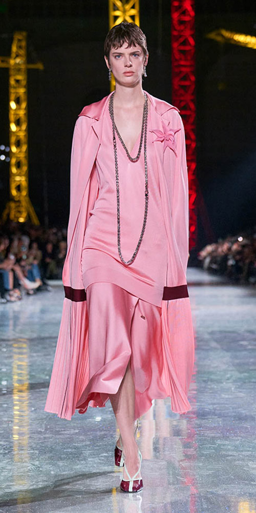 1920年代を思わせるローウエストも目立っていた。代表的なのは、低い位置に重心を据えた直線的なドレス。昨年はアール・デコ100周年にあたり、秋にはパリで大規模な展覧会が開催されるなど関心が高まった。その余波からか、この時代特有のデザインが散見された。