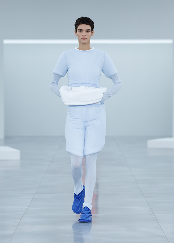 “どんなものでも、身体を通せば衣服になるか”では、ショッピングバッグがトップスになった。“見慣れているものを見慣れていないものに”では、規則的なプリーツ加工、弧を描くハンドプリーツ、ストライプ柄を組み合わせることで、プリーツなのか柄なのか、その境界で視覚的な揺らぎを生み出す。