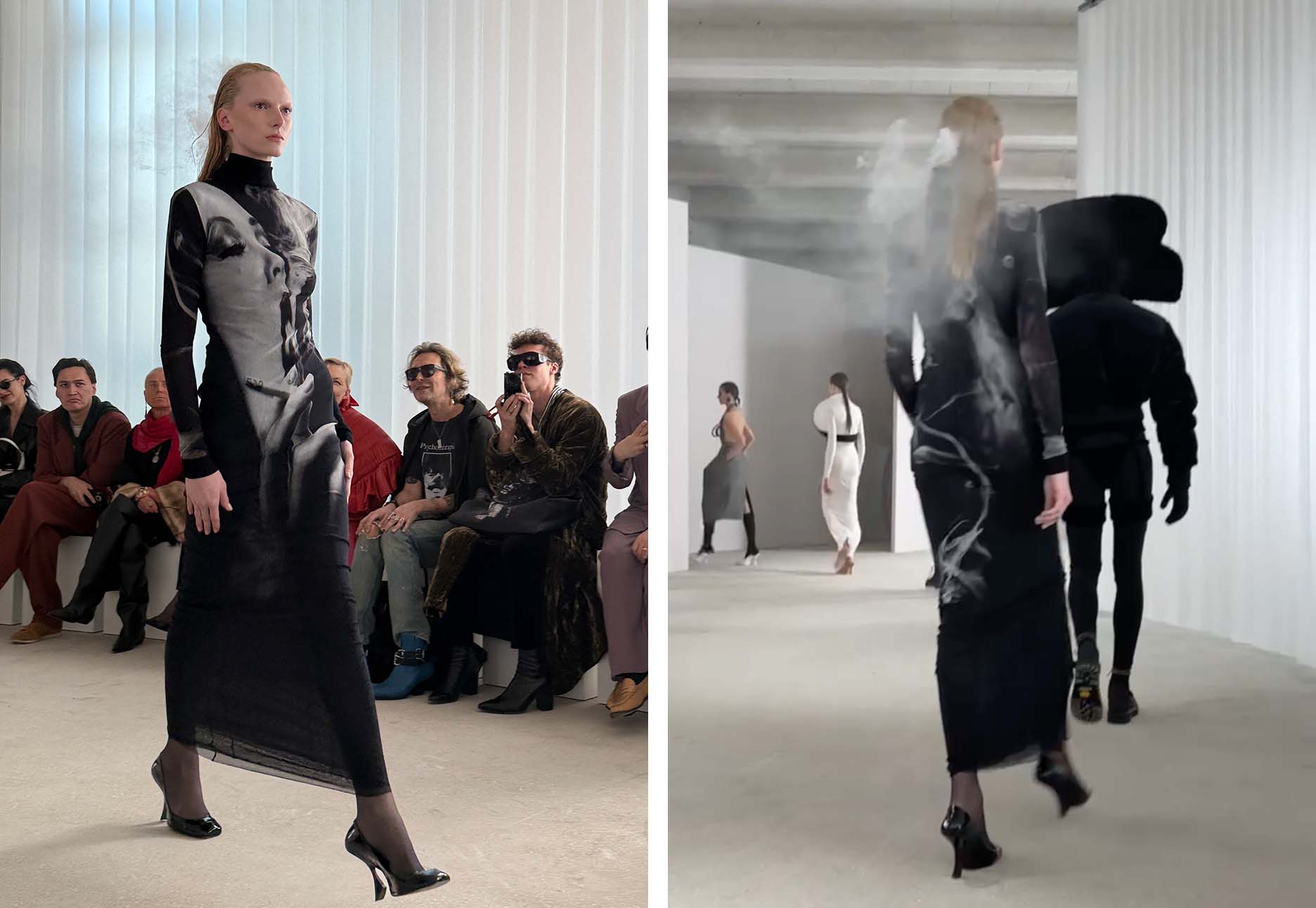 メゾン創立者のユーモアと挑発的な精神を受け継ぎつつ、ランティンク流のファンタジーを見せるコレクションです。タバコを吸うマレーネ・ディートリヒがプリントされたロングドレスには、背中から白いスモークが立ちのぼる仕掛けも。