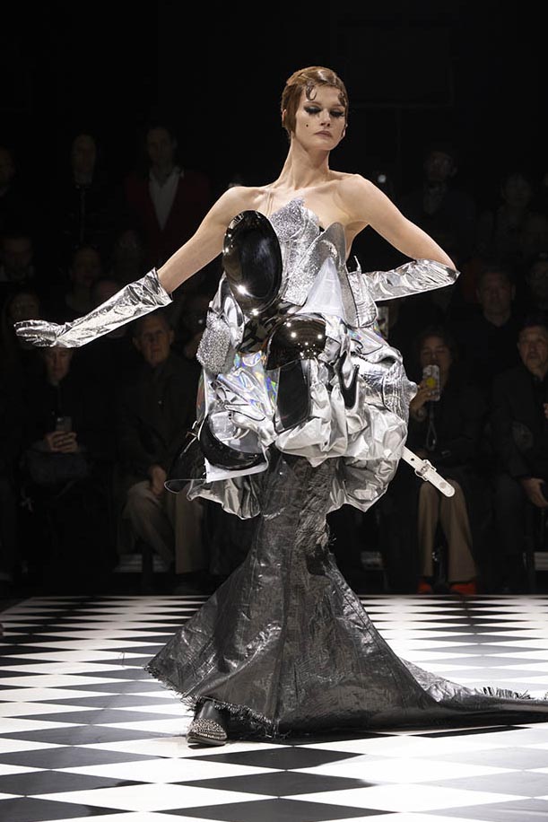 登場したシックなビスチェドレスは複数のグローブで構成。バイク用品の要素も取り入れ、ヘルメットのバイザー、カバーシート、プロテクターなど、工業的なパーツが配置されています。