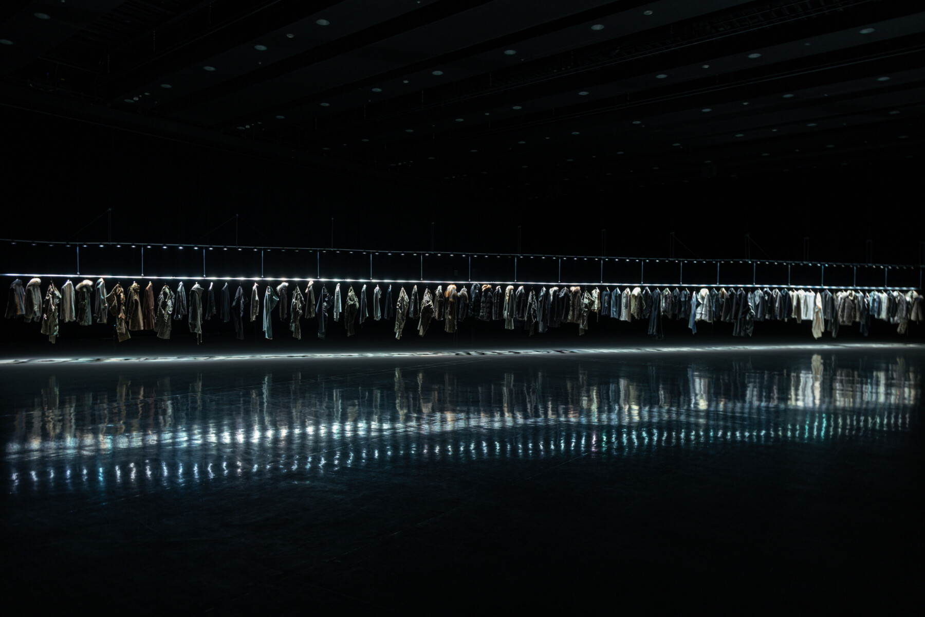 kiminori morishitaが発表したのはランウェイではなく、ブランドの歩みそのものを提示するインスタレーション「80 pieces of history」だった。2003年のデビューから現在に至るまで、約80着のアーカイブピースを一堂に集め、その時間の積層を空間として立ち上げる試みである。