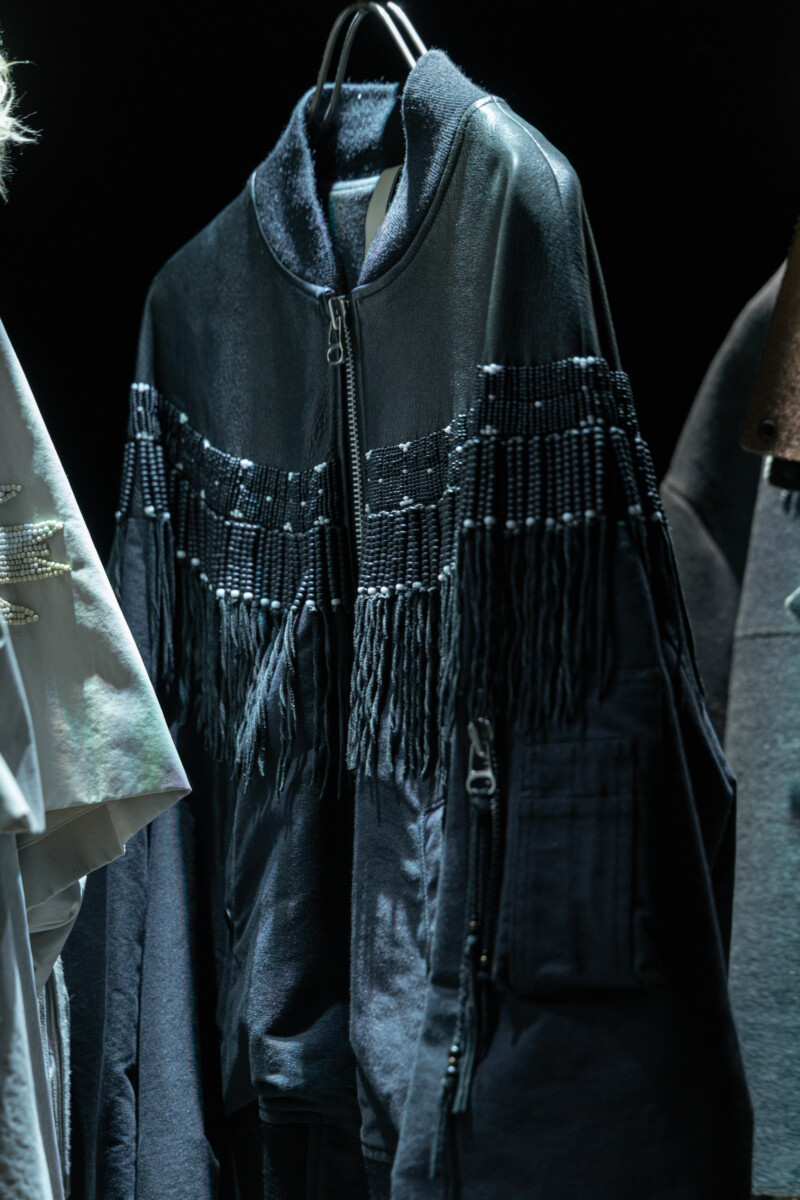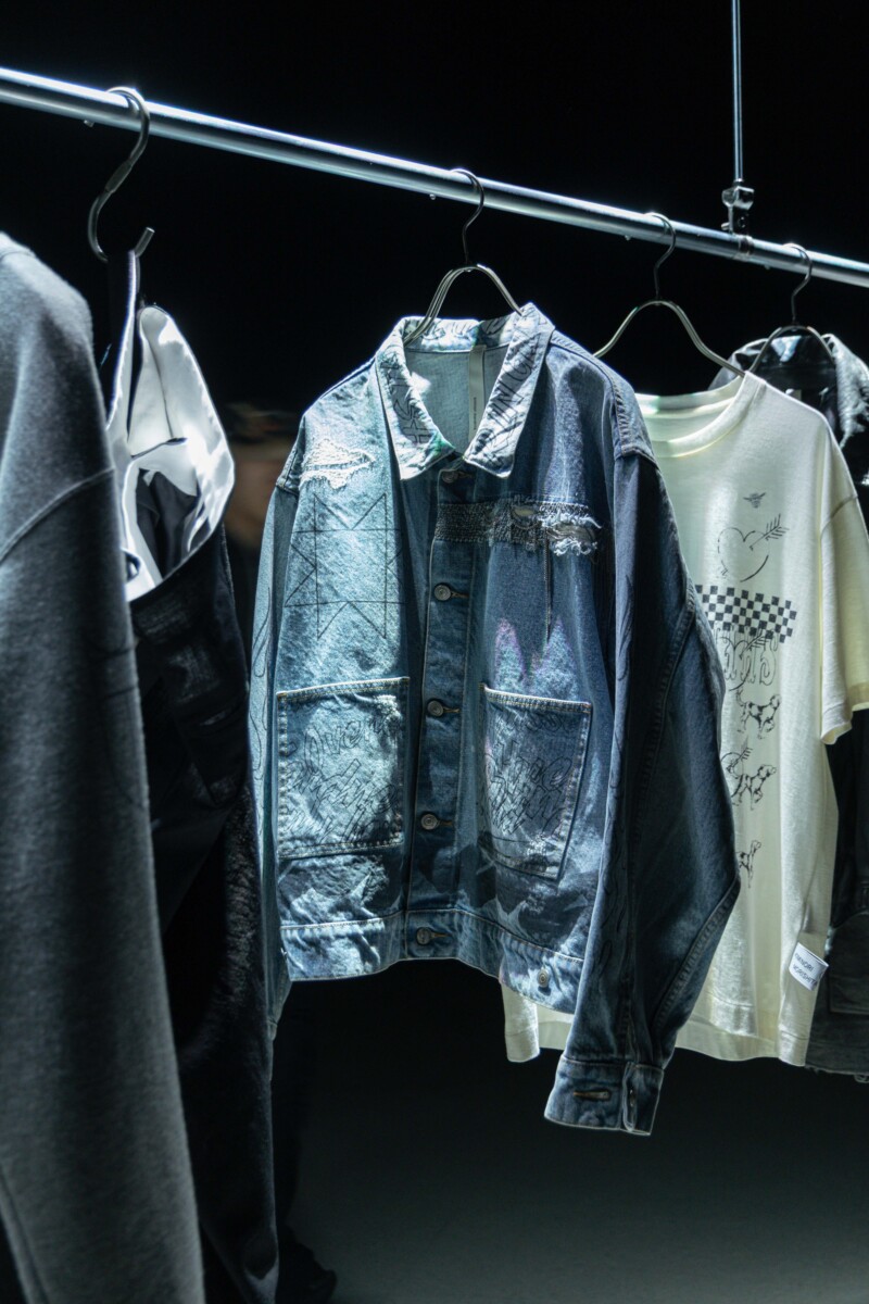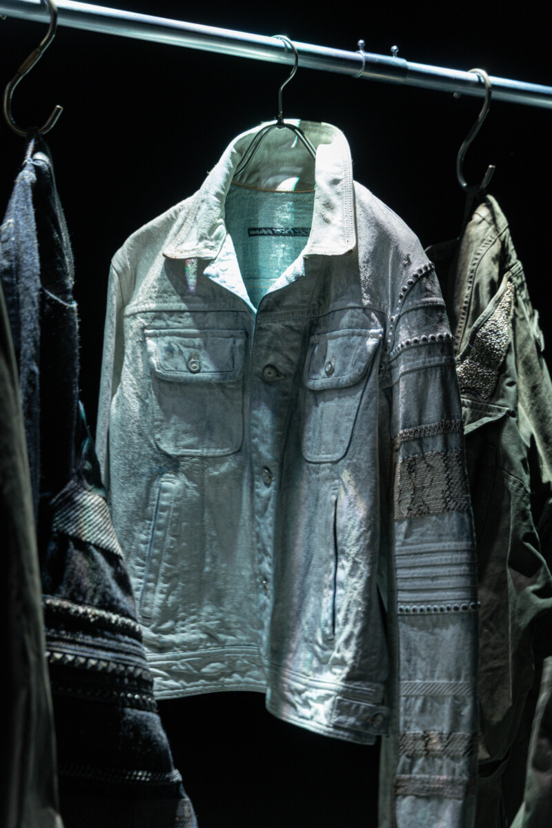 初期の東京時代(2003〜2005年)は、スーツ地とレザーを切り替えたライダースや、削りや焼きの工程を重ねた木製ボタンに象徴されるように、異素材と加工を掛け合わせる実験性が際立つ。その後、発表の場をパリに移すと、その熱量はより洗練された造形へと変化していく。スプレー加工のダウンで陰影を与え、経年の見え方そのものを反転。2016年、6年の休止を経た再始動後は、複数の着方を内包するパイロットジャケットや、濃淡の異なるパーツを接ぎ合わせたデニムなど、構造そのものを再設計する方向へと展開していった。そして現在は、エスニックな刺繍に塩縮加工を施したシャツをはじめ、ミニマルに仕上げながらも細部にこだわりが凝縮したウェアを手掛ける。