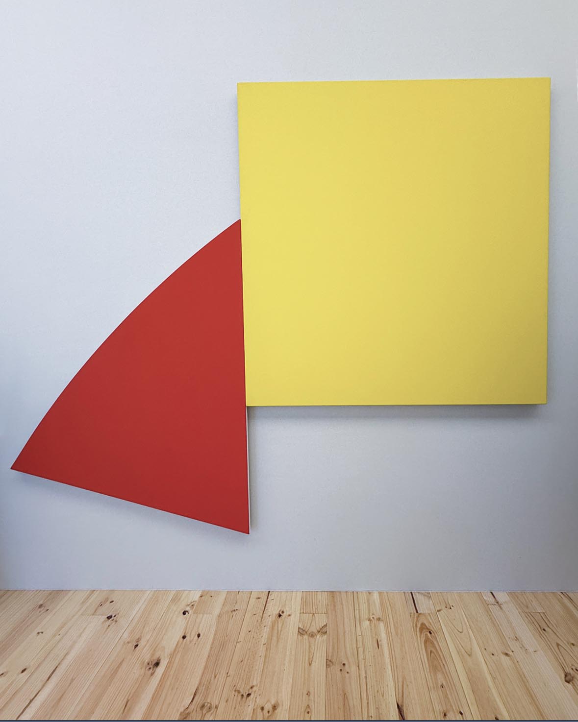 ロエベのショー会場より。右の写真は、エルズワース・ケリーの『Yellow Panel with Red Curve』(1989年)。