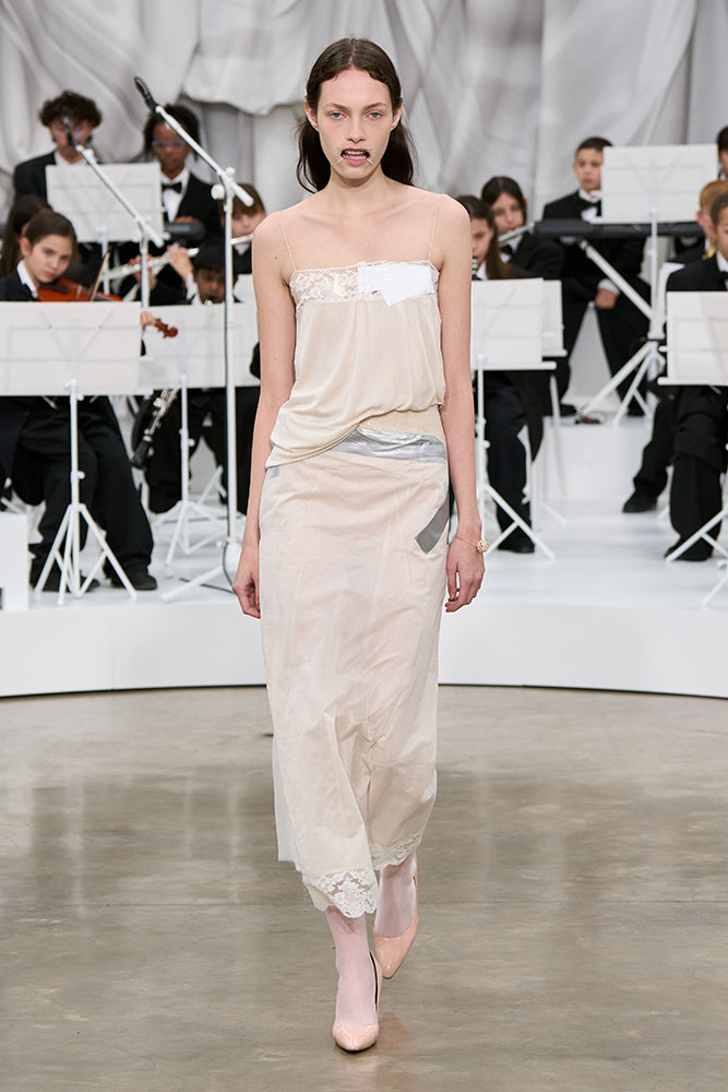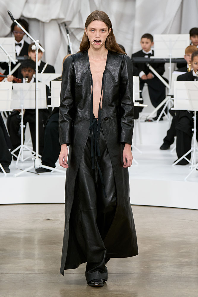 ひときわ目を引いたのは、モデルに装着されたマウスピース。これはメゾンを象徴する“4本の白いステッチ”から発想されたもので、表情に統一感を与え、メゾンの匿名性をさらに追求することになりました。
