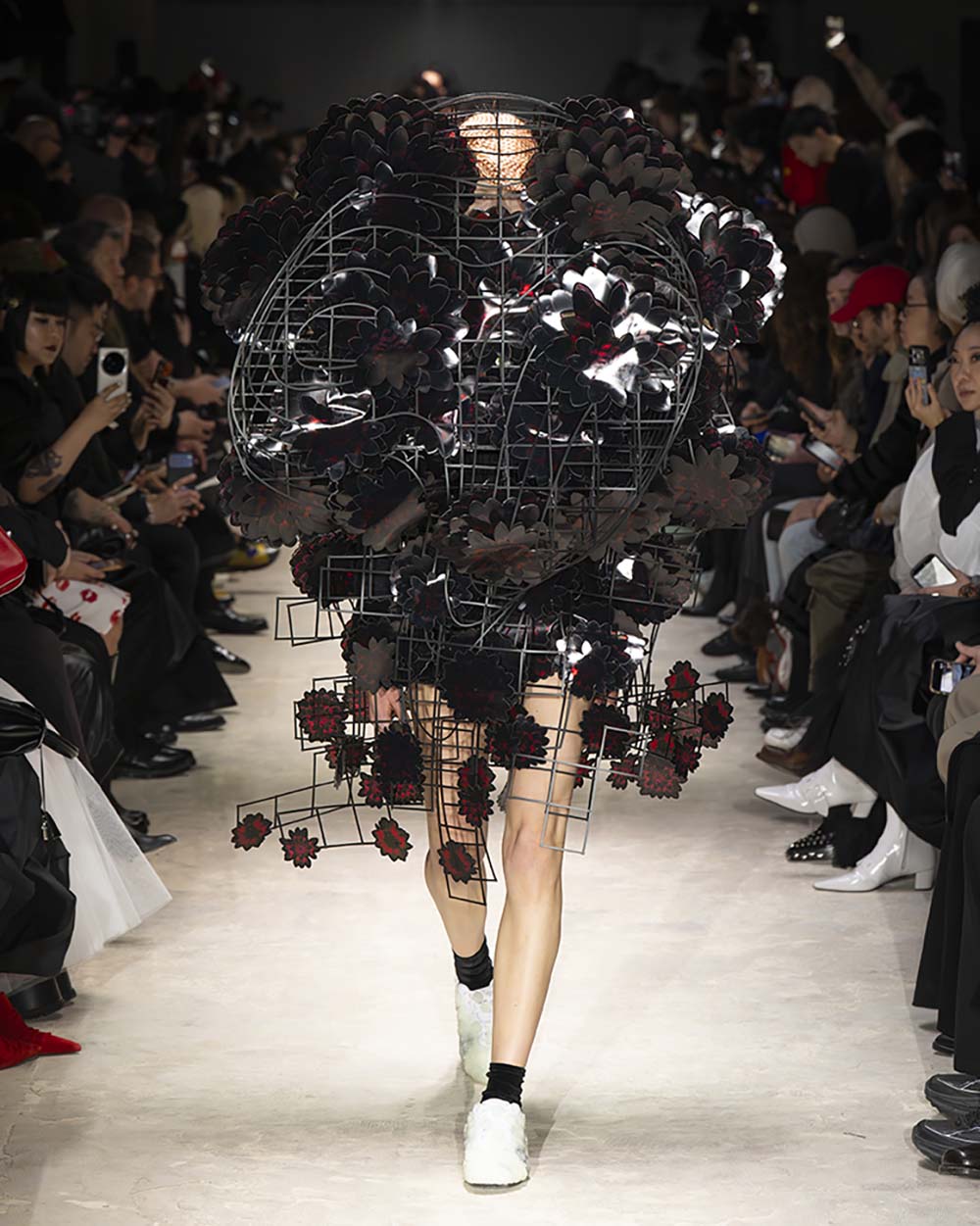ケージに花が群生する彫刻のようなルックは、光沢のある素材が照明を鈍く反射。身体を包み込むフレームの表面をダリア形のプレートが覆い、モデルの動きとともにゆらゆらと揺れていました。まるで空間に浮かぶオブジェのような存在感です。