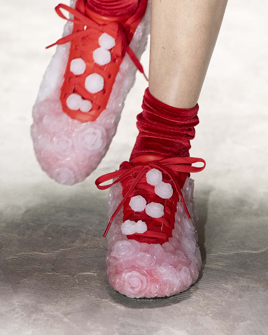 スニーカーはピューマとのコラボレーションによるもので、アッパー全体が小さな薔薇のレリーフで覆われています。メッシュ状に編み込まれたウィッグと動物のヘッドピースを手がけたのは、ヘアメイクアーティストの小西神士さん。