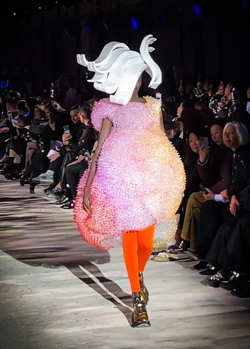 このブランドのシグネチャーである黒(フランス語でノワール)のルックは、シャツと透け感のあるスカートが組み合わされた。レザーやチェーンのピースをプラスし、エッジのあるスタイルに仕上がっている。ボール状のパーツで構築したドレスは毛糸とレジンで作られていて、ふわっとした質感。カラフルなリボンの中にはスポンジが入っていて弾力がある。