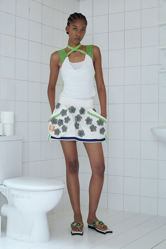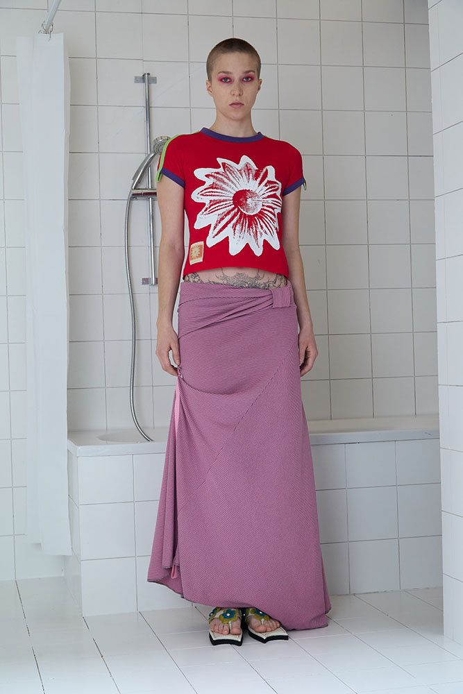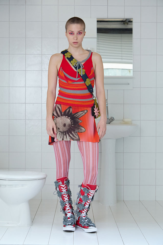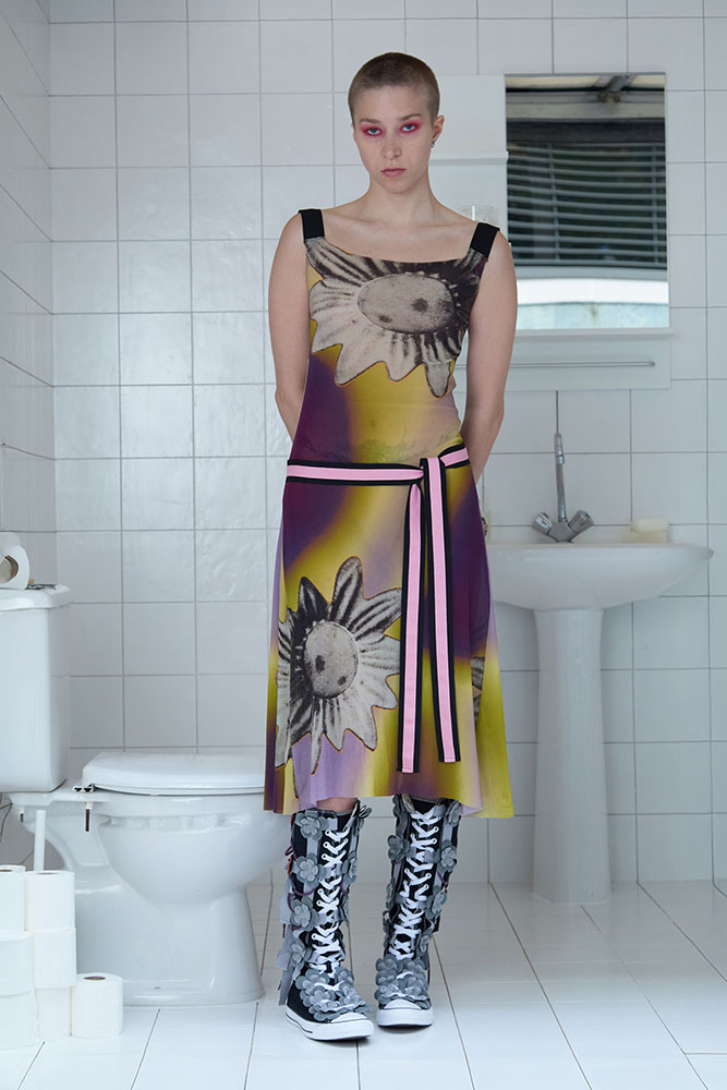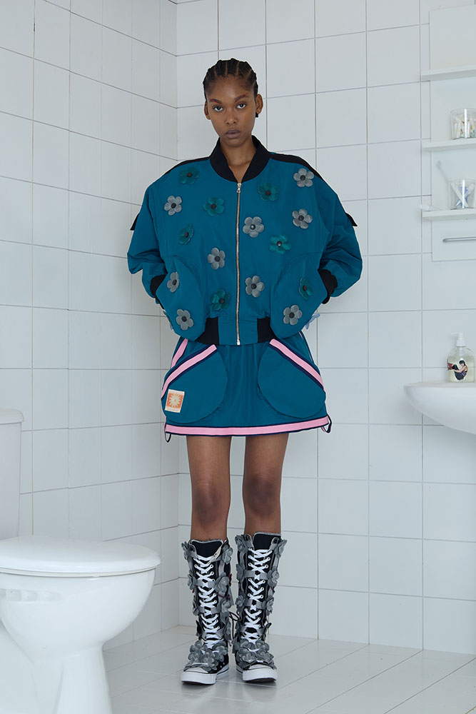 提案されたのは、ジャージを手作業でカットしたポンポン付きセットアップ、歪んだ花柄プリントのワンピース、レーザープリントと刺繍を組み合わせたデニムなど。コンバースとのコラボレーションによるレースアップスニーカーには、3Dフラワーを装飾。ロマンチックテイストが加味されたグラフィックなコレクションです。
