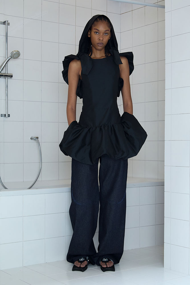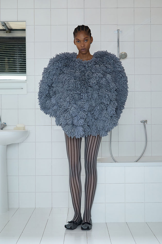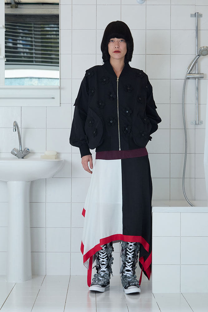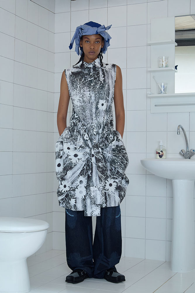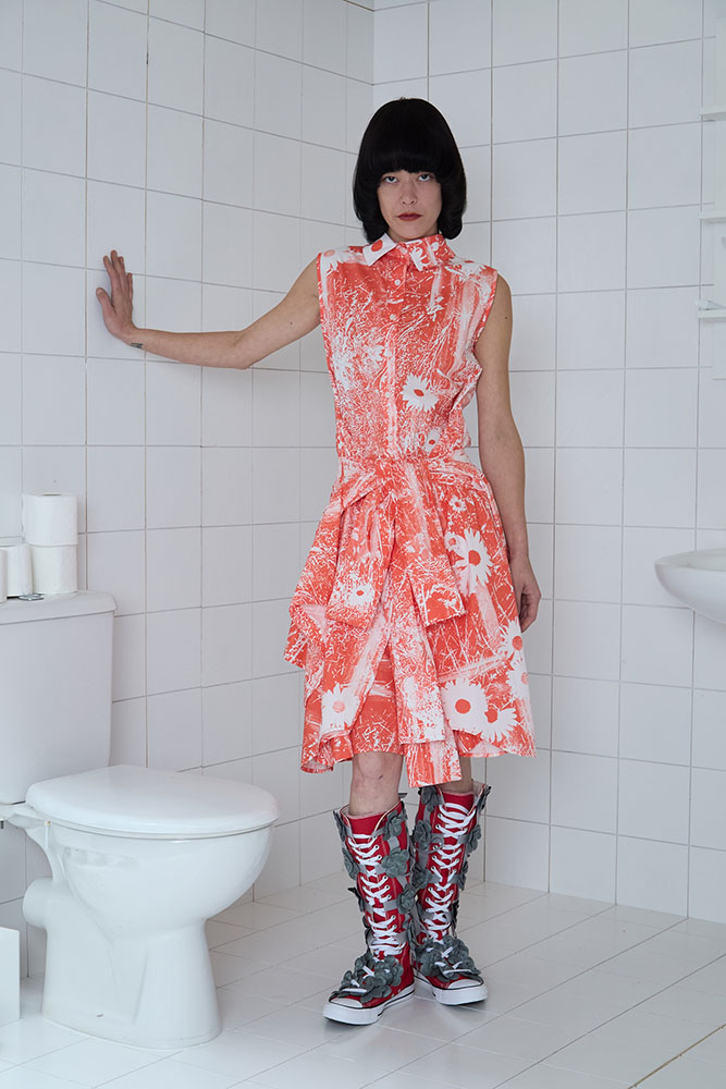 提案されたのは、ジャージを手作業でカットしたポンポン付きセットアップ、歪んだ花柄プリントのワンピース、レーザープリントと刺繍を組み合わせたデニムなど。コンバースとのコラボレーションによるレースアップスニーカーには、3Dフラワーを装飾。ロマンチックテイストが加味されたグラフィックなコレクションです。