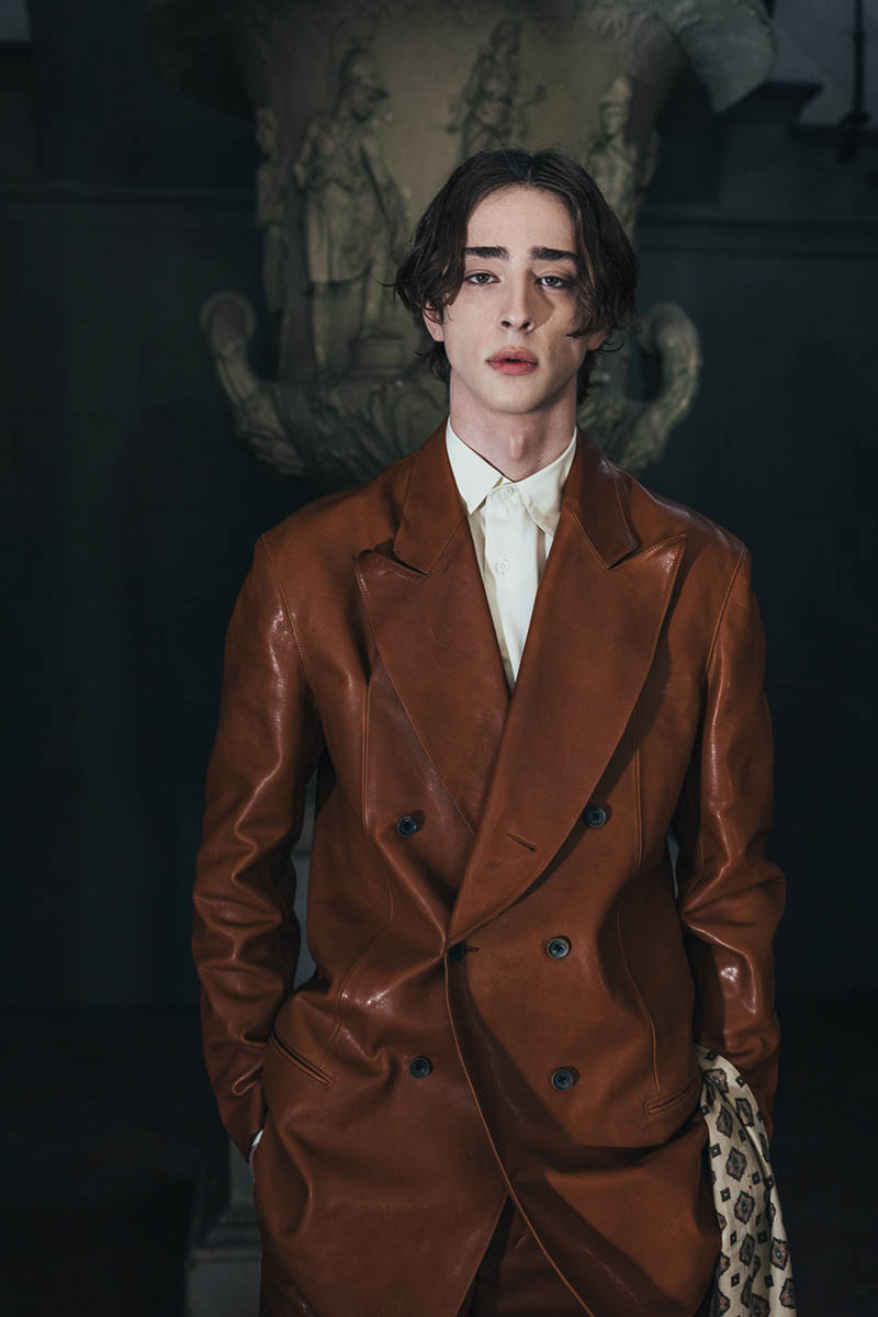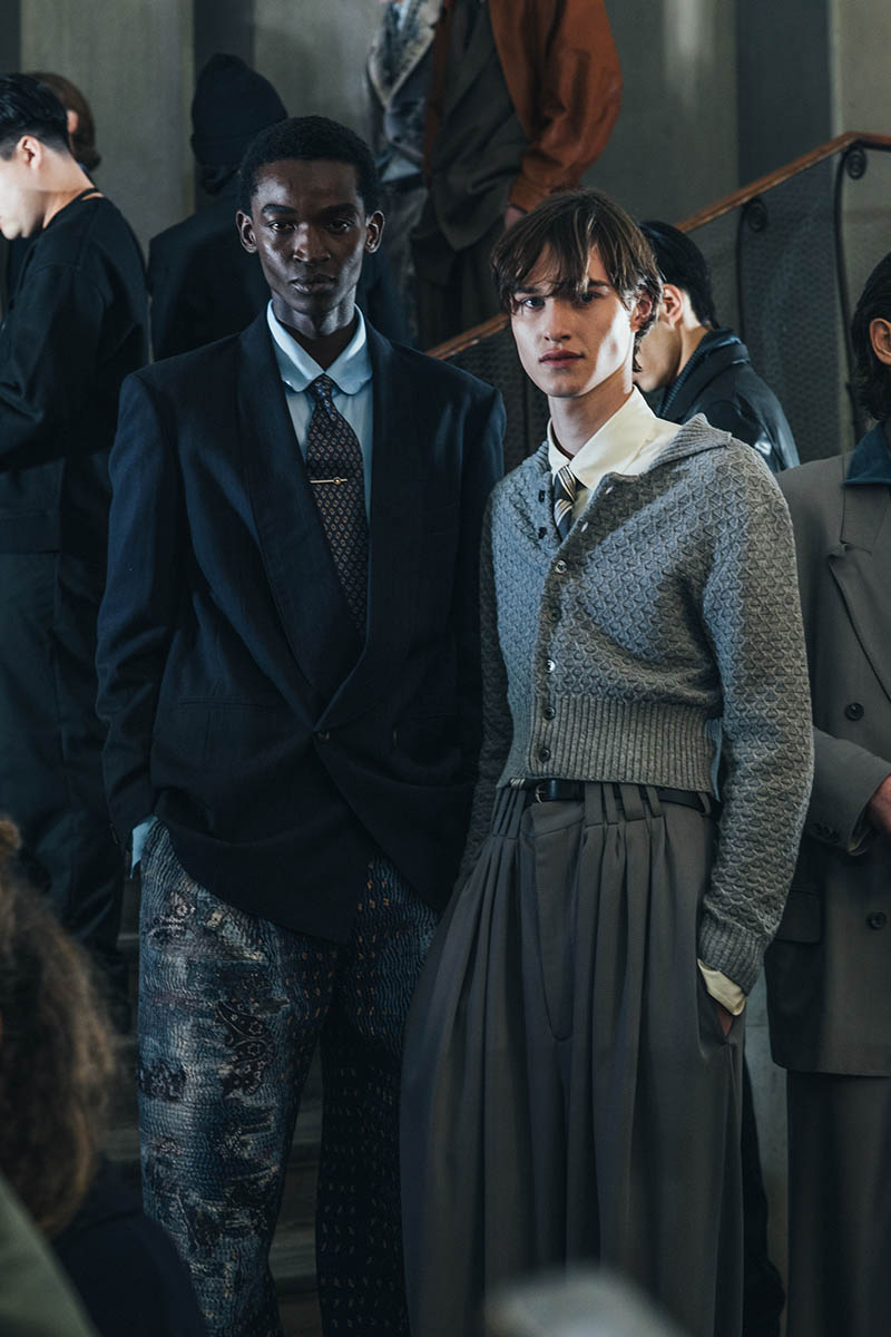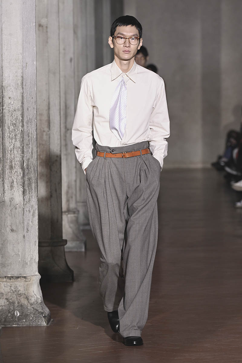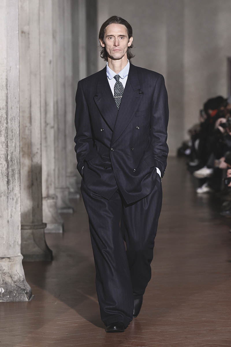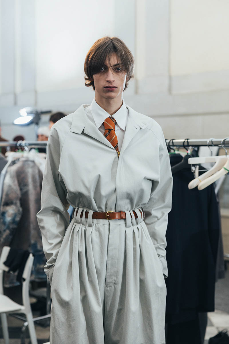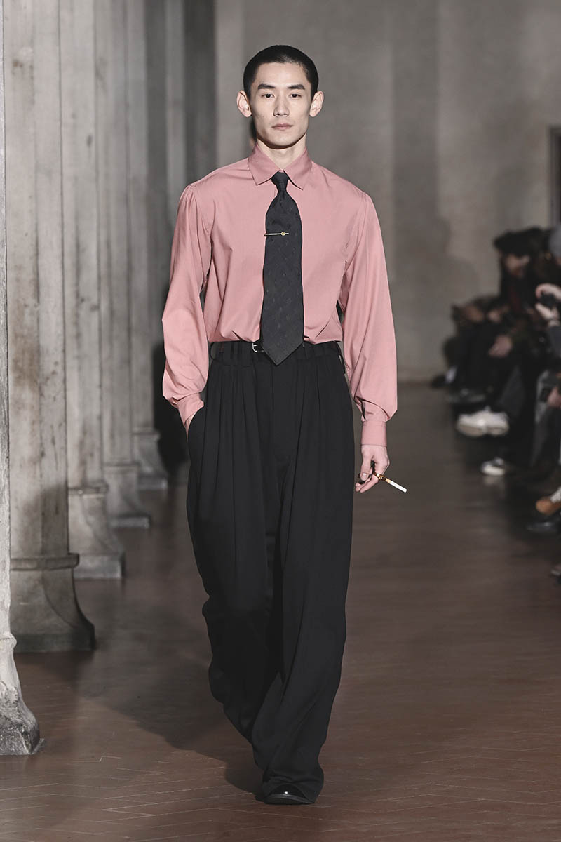 ピークドラペルやシャツの襟先にはパターンとアイロンによる人為的カールを与え、オックスフォードシャツはバイアスカットで仕立てるなど、一見クラシックなメンズのワードローブに新しい解釈を加えています。タックをたっぷり入れたパンツも印象的。