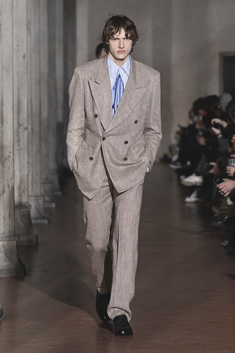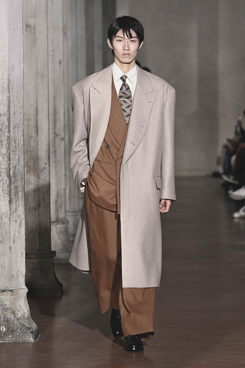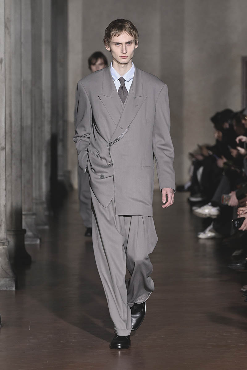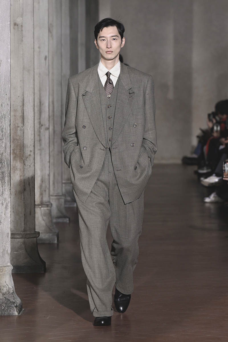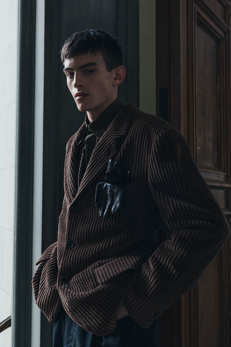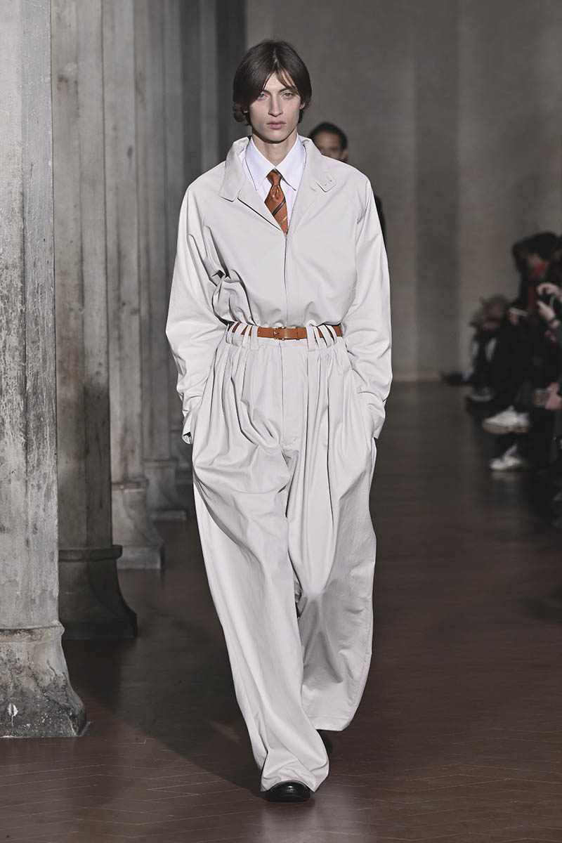 ピークドラペルやシャツの襟先にはパターンとアイロンによる人為的カールを与え、オックスフォードシャツはバイアスカットで仕立てるなど、一見クラシックなメンズのワードローブに新しい解釈を加えています。タックをたっぷり入れたパンツも印象的。