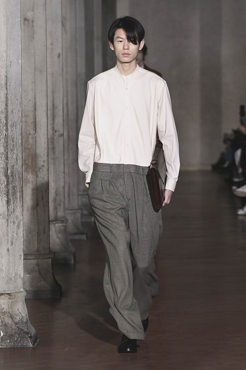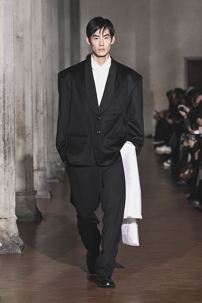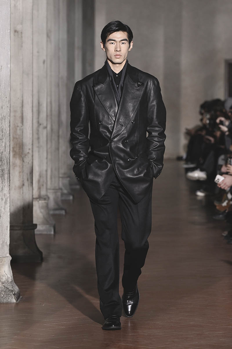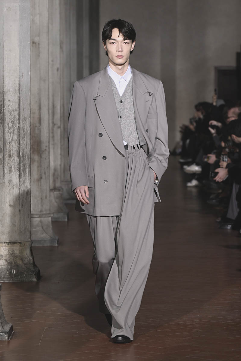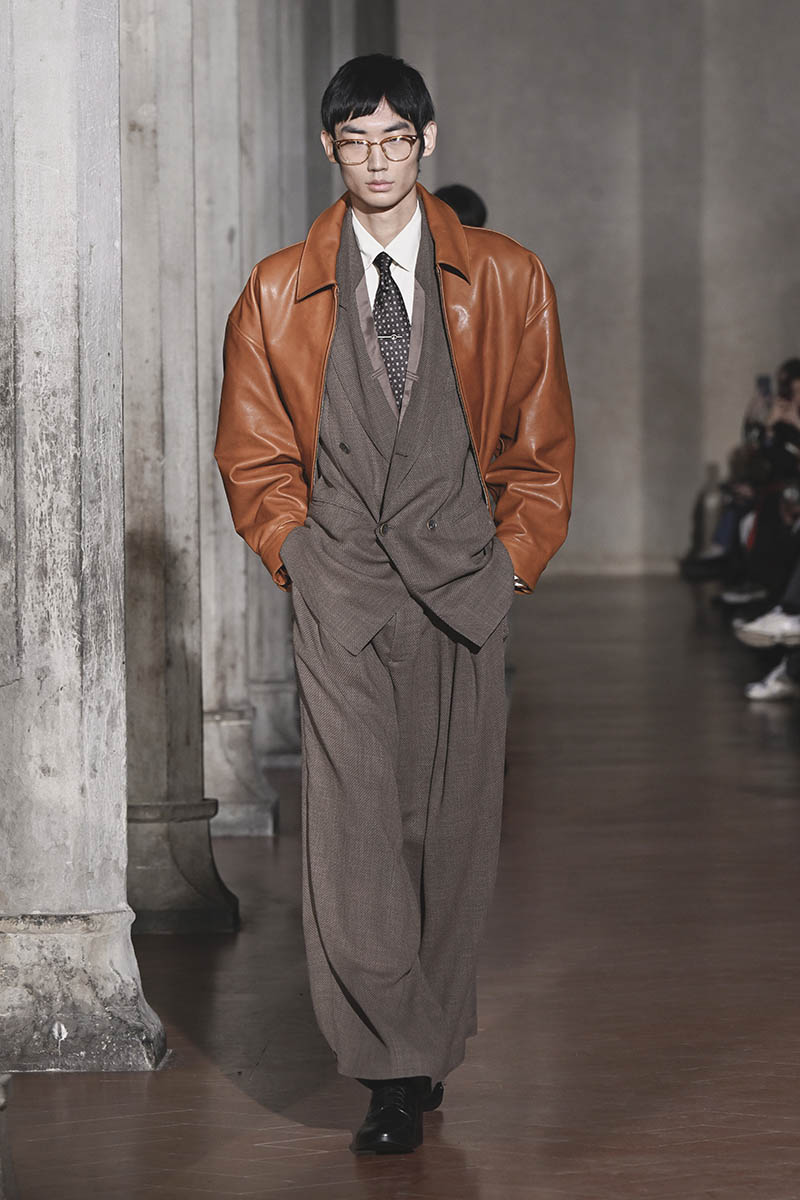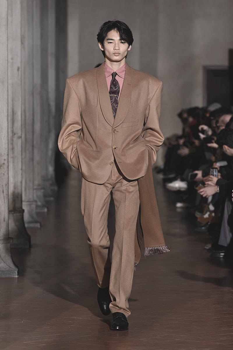 ピークドラペルやシャツの襟先にはパターンとアイロンによる人為的カールを与え、オックスフォードシャツはバイアスカットで仕立てるなど、一見クラシックなメンズのワードローブに新しい解釈を加えています。タックをたっぷり入れたパンツも印象的。