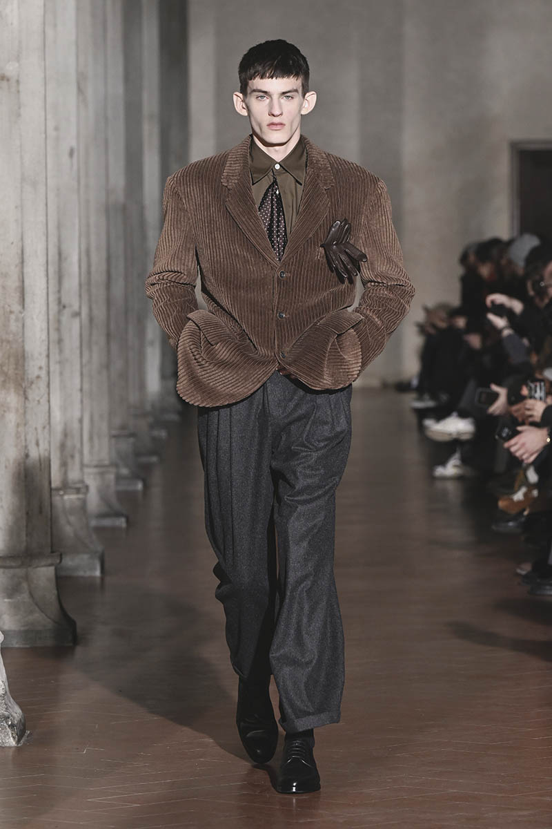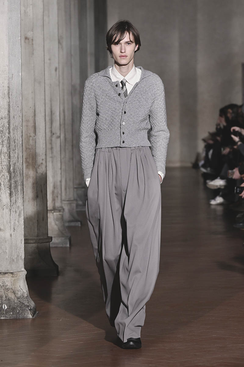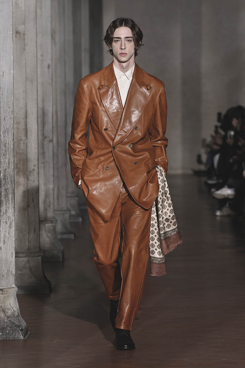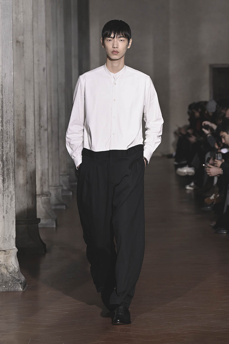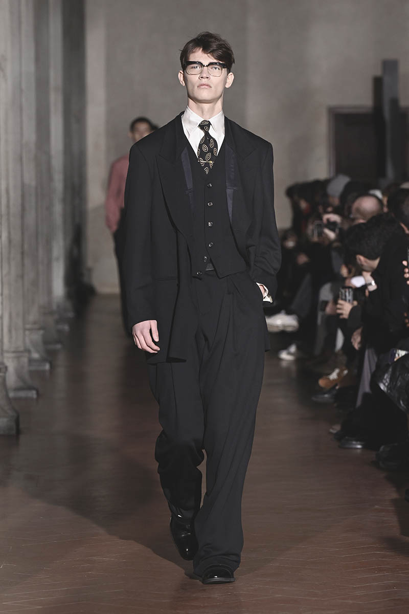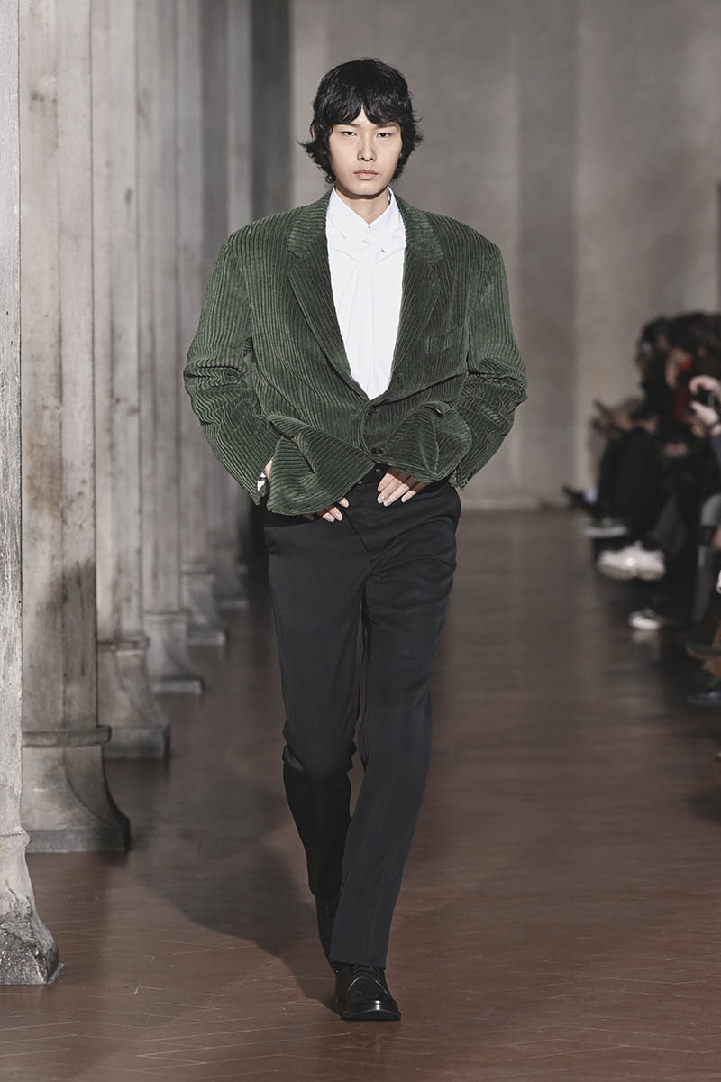 ピークドラペルやシャツの襟先にはパターンとアイロンによる人為的カールを与え、オックスフォードシャツはバイアスカットで仕立てるなど、一見クラシックなメンズのワードローブに新しい解釈を加えています。タックをたっぷり入れたパンツも印象的。
