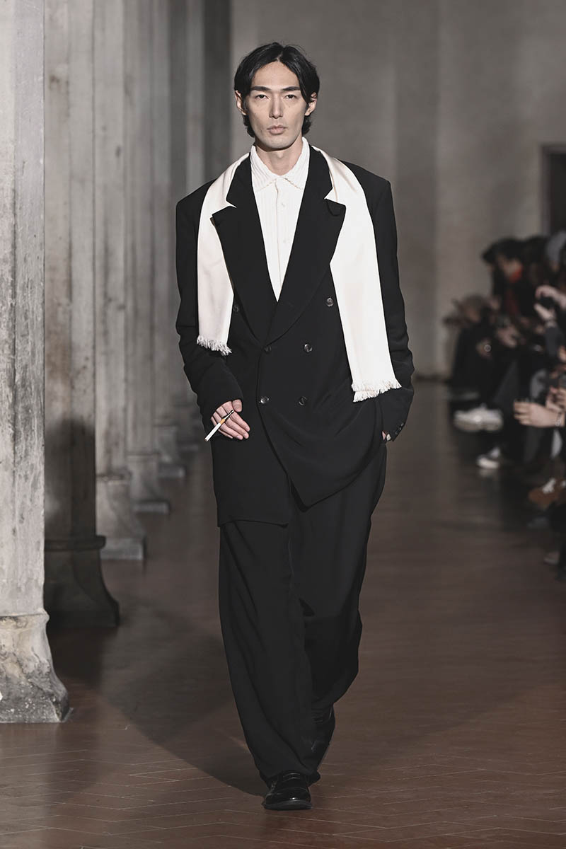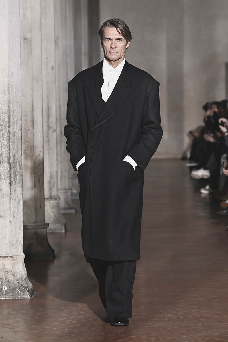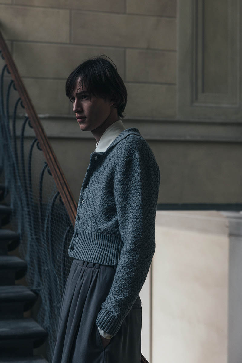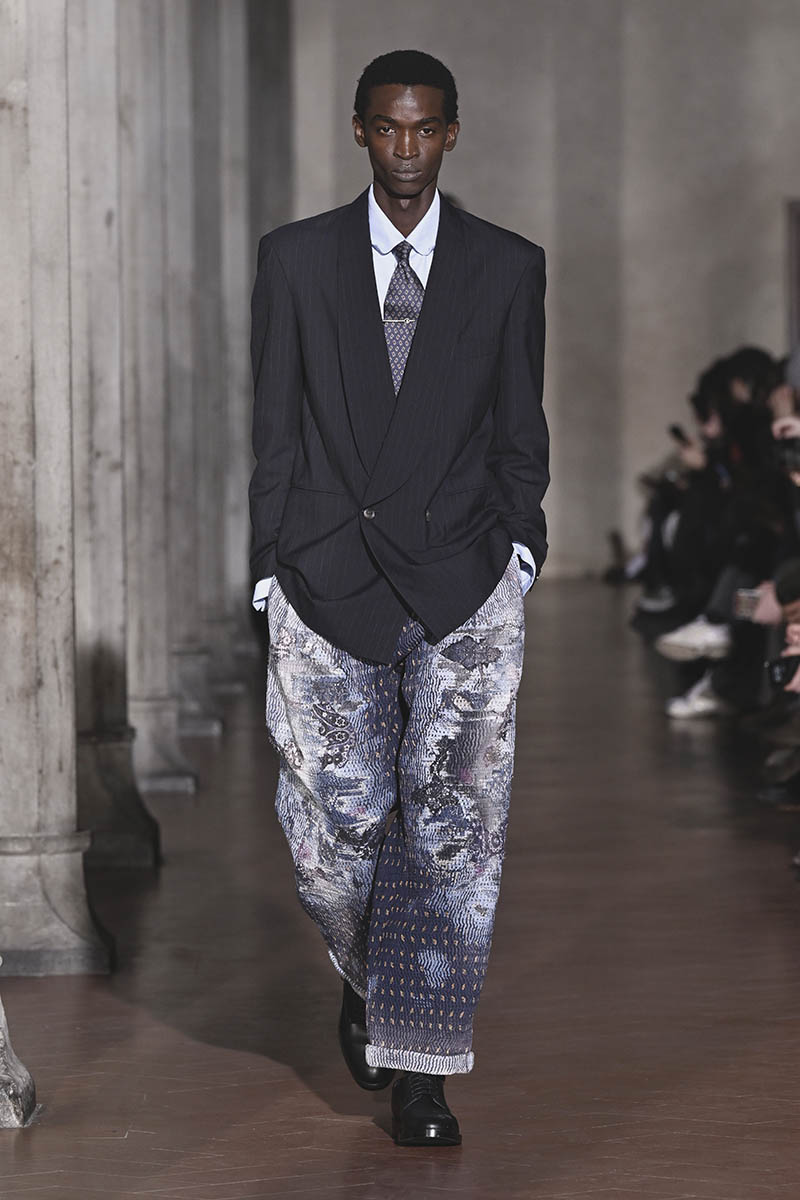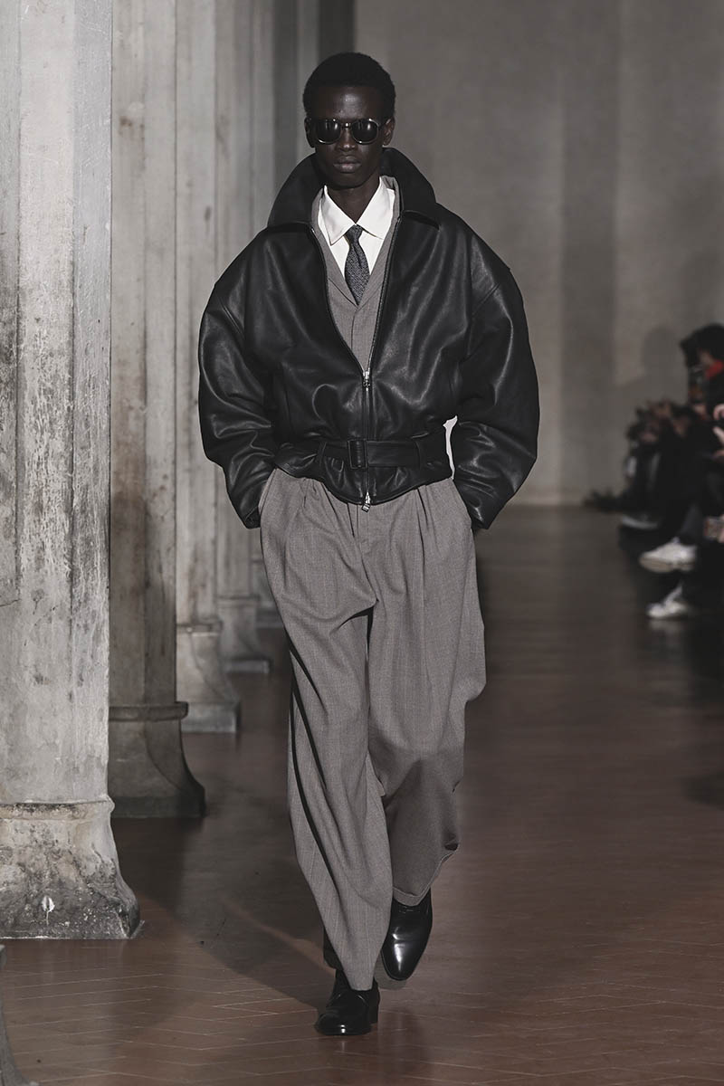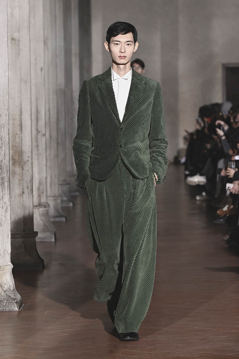 ピークドラペルやシャツの襟先にはパターンとアイロンによる人為的カールを与え、オックスフォードシャツはバイアスカットで仕立てるなど、一見クラシックなメンズのワードローブに新しい解釈を加えています。タックをたっぷり入れたパンツも印象的。