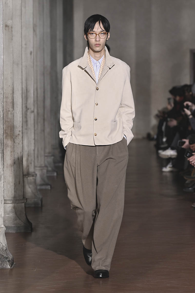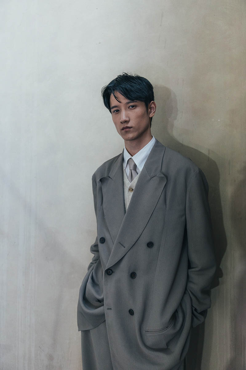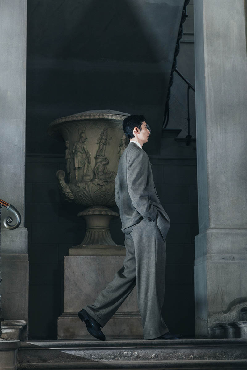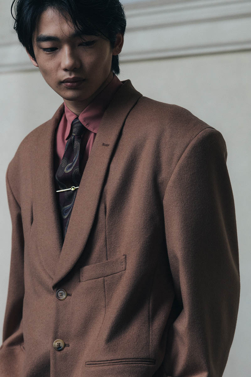 S :これまで私は、1980~90年代の日本のバブル経済期に、メイド・イン・イタリーのスーツが流行していた時代をひとつの重要なインスピレーション源としてきました。今回は、その「日本にイタリアのスーツが流入していた時代」から一歩進めて、日本からイタリアへと視点が反転する、いわば逆輸入のような構図を意識しています。ただしそれは対立ではなく、あくまで共存の感覚です。日本のスーツとイタリアのスーツ、それぞれが持つ美点を掛け合わせることを目指しました。当時の日本で独自に進化し、いわばガラパゴス化していったスーツの文脈からも、大きなインスピレーションを得ています。また、生産の98%は日本で行っています。