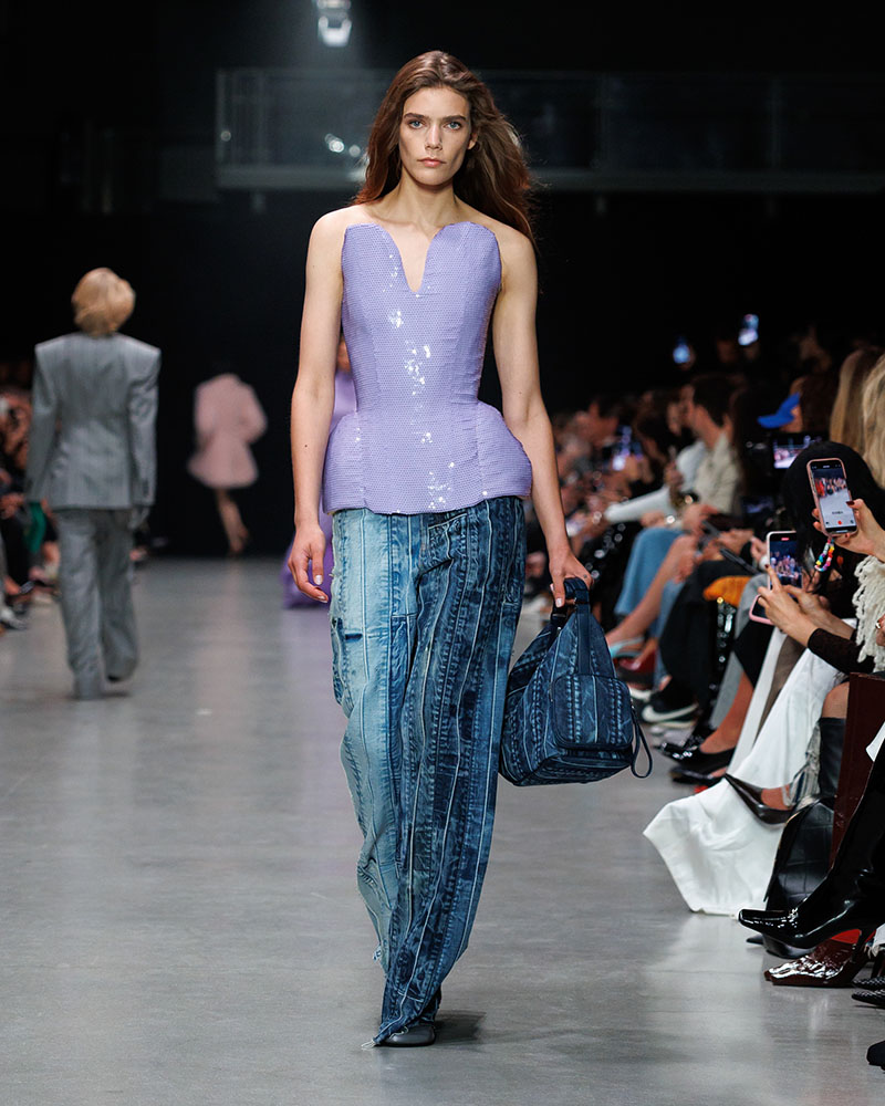 ブランドのこだわりが詰まったアップサイクル・アイテムも充実。ジーンズのウエストベルトを再利用したドレスやパンツ、バッグなどが提案されました。