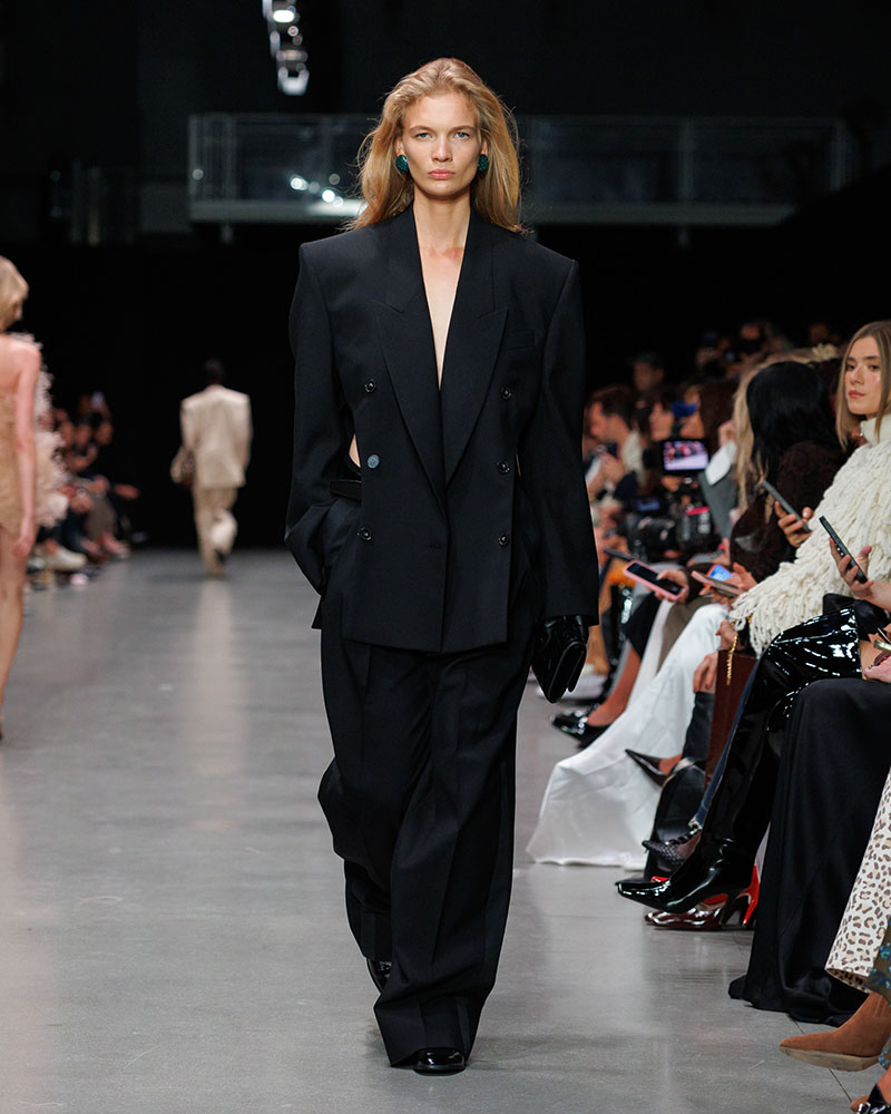 コレクションで描かれたのは、男性的でありながら女性的でもある、二面性を併せ持つステラ・ウーマンです。ブランドを象徴するテーラリングでは、ダブルブレストジャケットにサイドカットを施した新たなシルエットが登場しました。