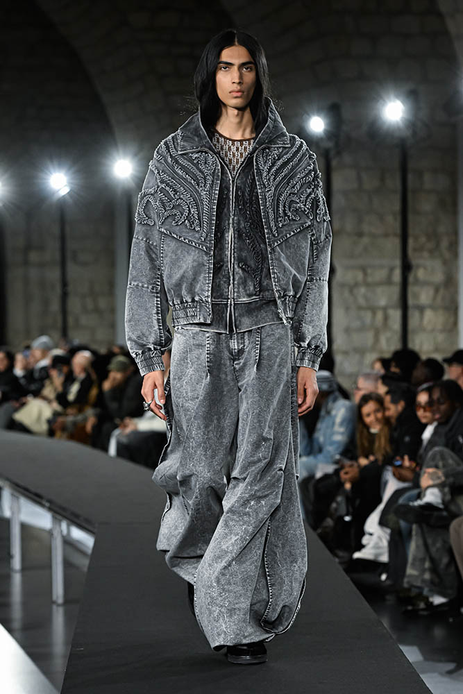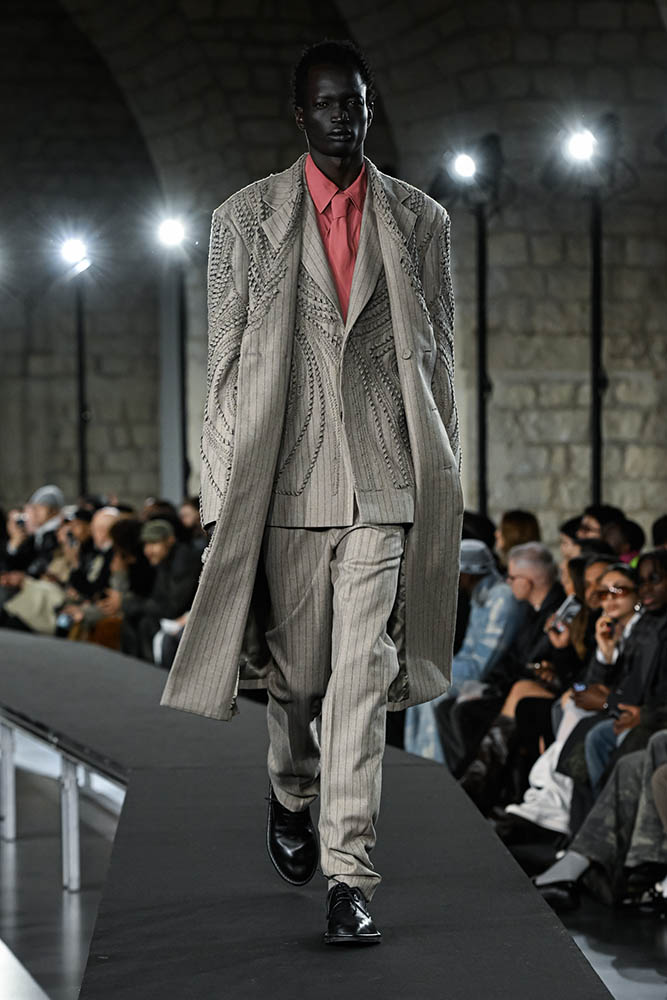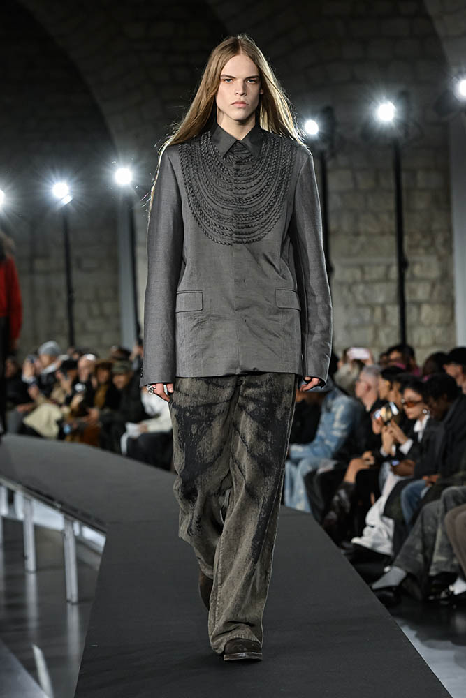 土器に刻まれた模様のような刺繍、左右非対称のグラデーションのピースなど、作り込まれたディテールやファブリックは迫力さえ感じさせました。