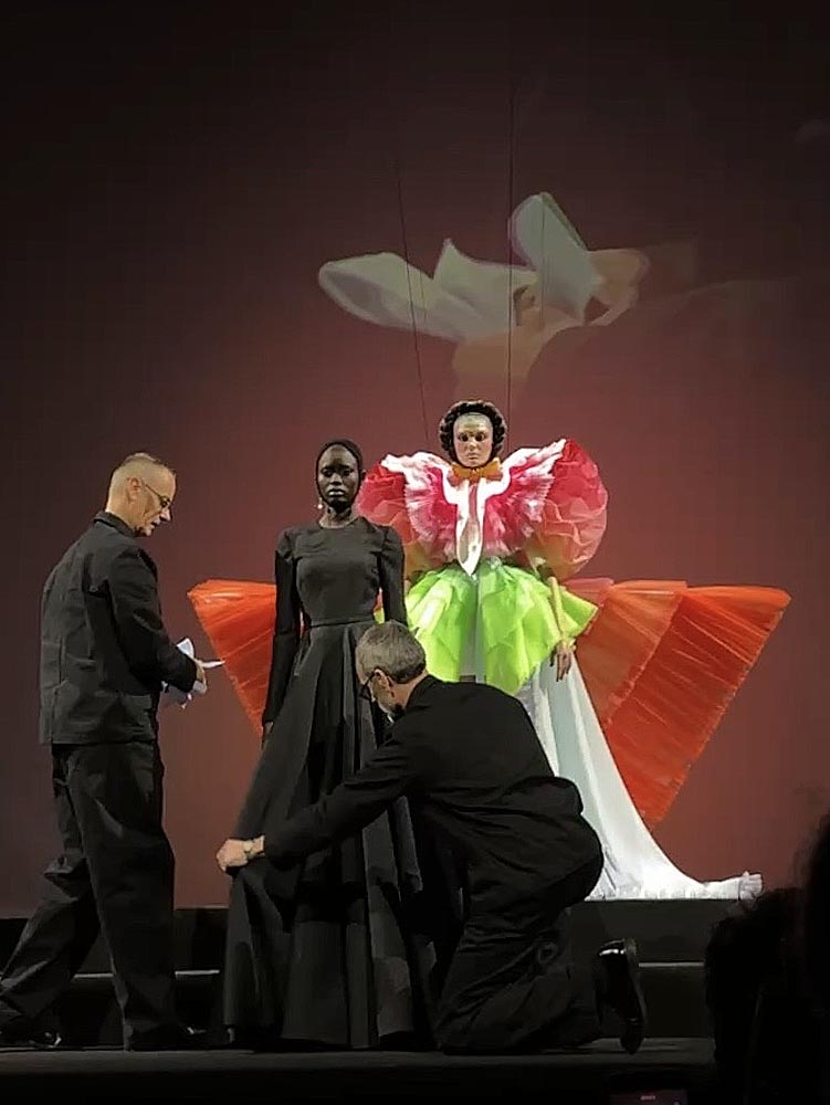 各ルックは、重厚な黒のシルエットと軽やかなカラーチュールの対比を見せ、一瞬で変化する二面性も表現されています。遊び心と実験性を備えたショーのラストには、“凧”のルックが完成し、空に浮かび上がる驚きの演出でフィナーレを迎えました。