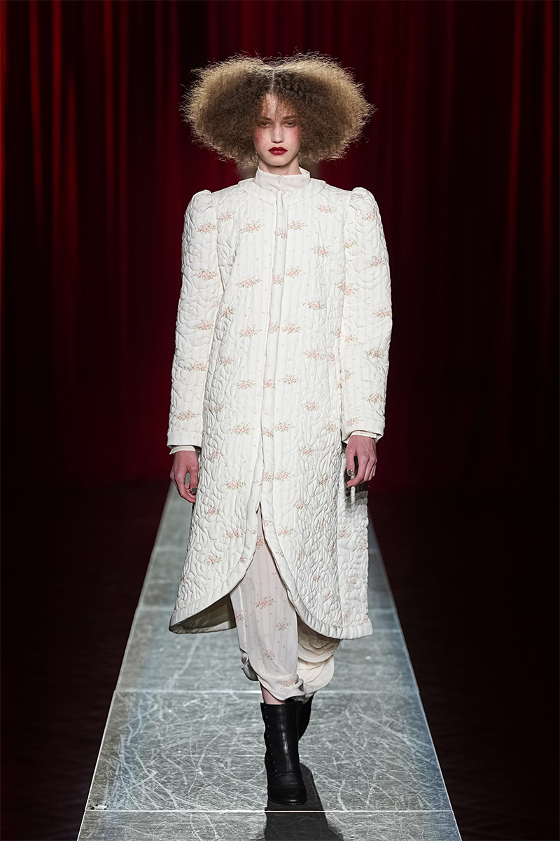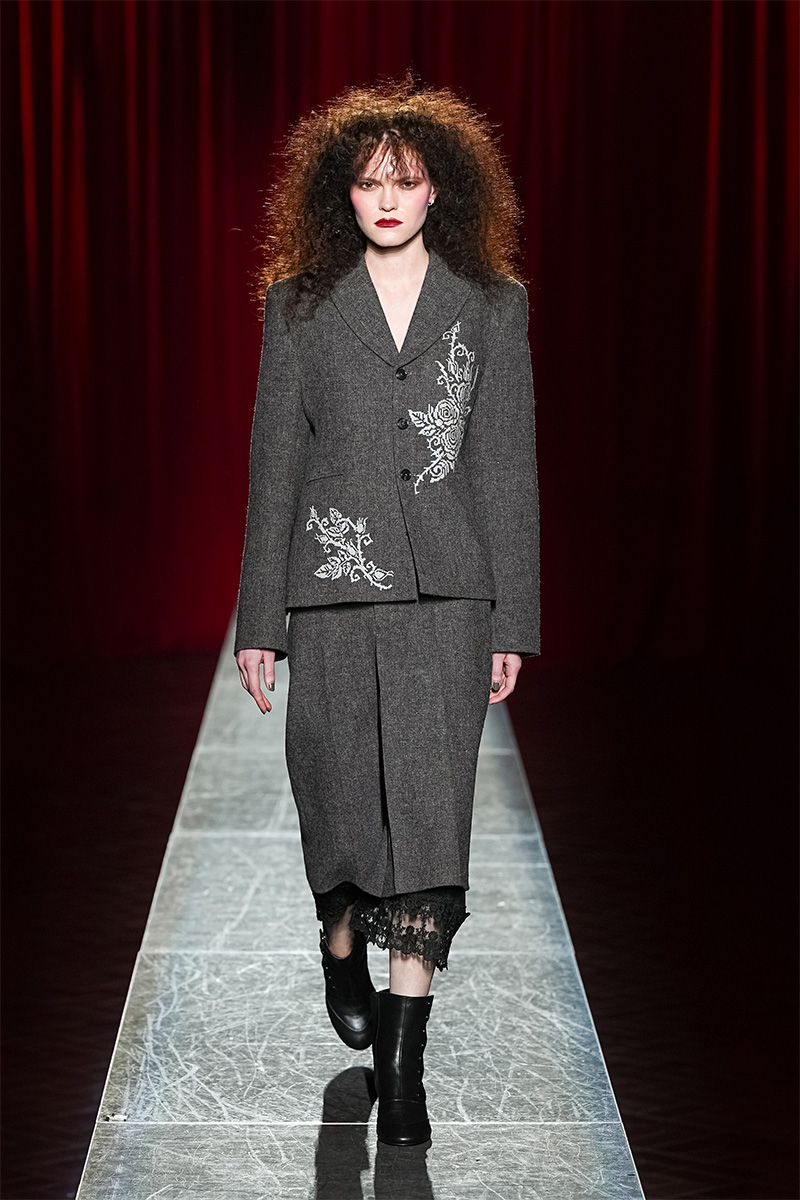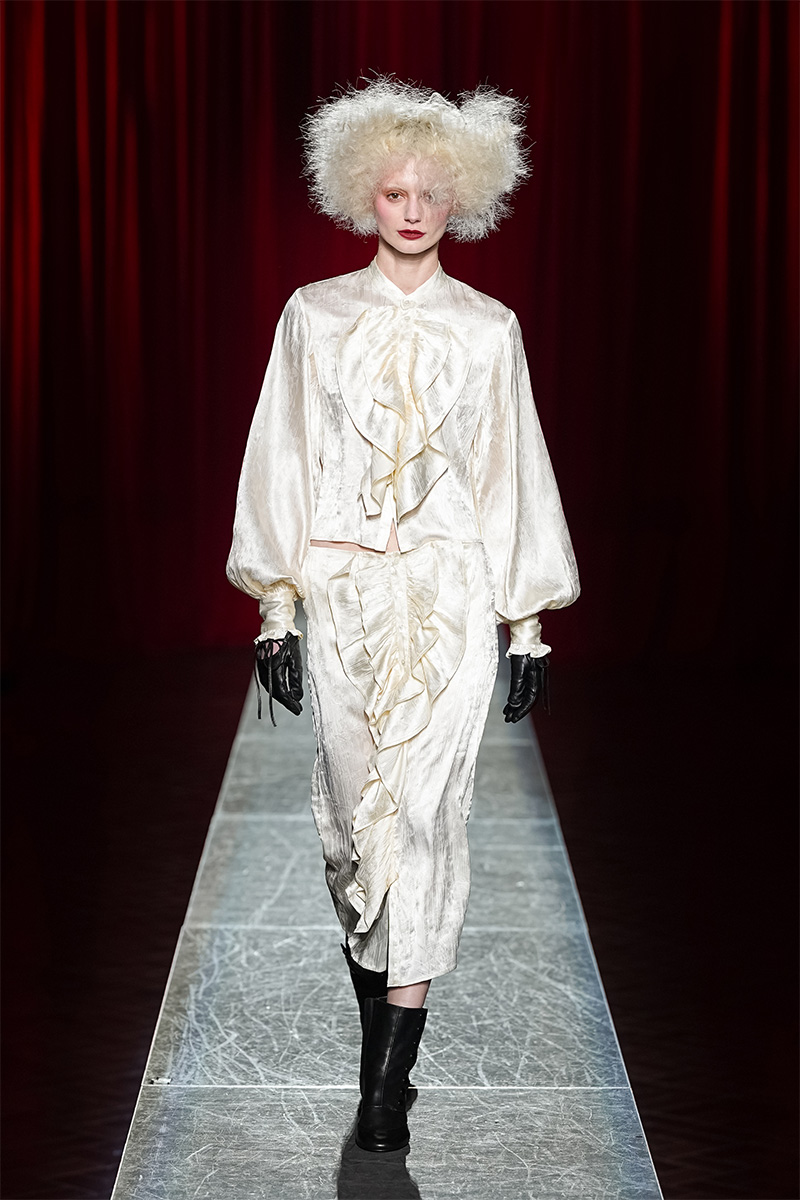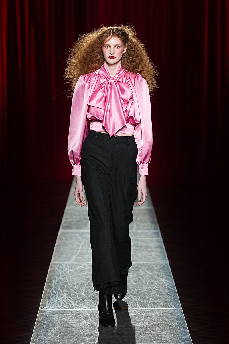 東京・新宿区の「ウェスレアン・ホーリネス教団 淀橋教会」の内部を真っ赤に染め上げるライティング。観客の視線が一本のランウェイに注がれる中で現れたファーストルックは、白のマトンスリーブが目を引くレースブラウスと、黒のレースつきボトムだった。一見するとマニッシュなショーツに見えるそのボトムは、実はボックスプリーツのスカートであり、緻密なパターンの試行錯誤によって生まれたものだという。流動性を持ったそのアイテムが、今季の方向性を示唆する。