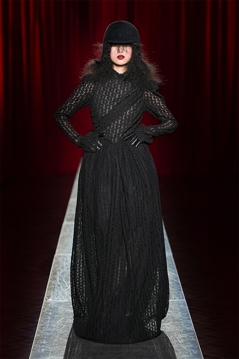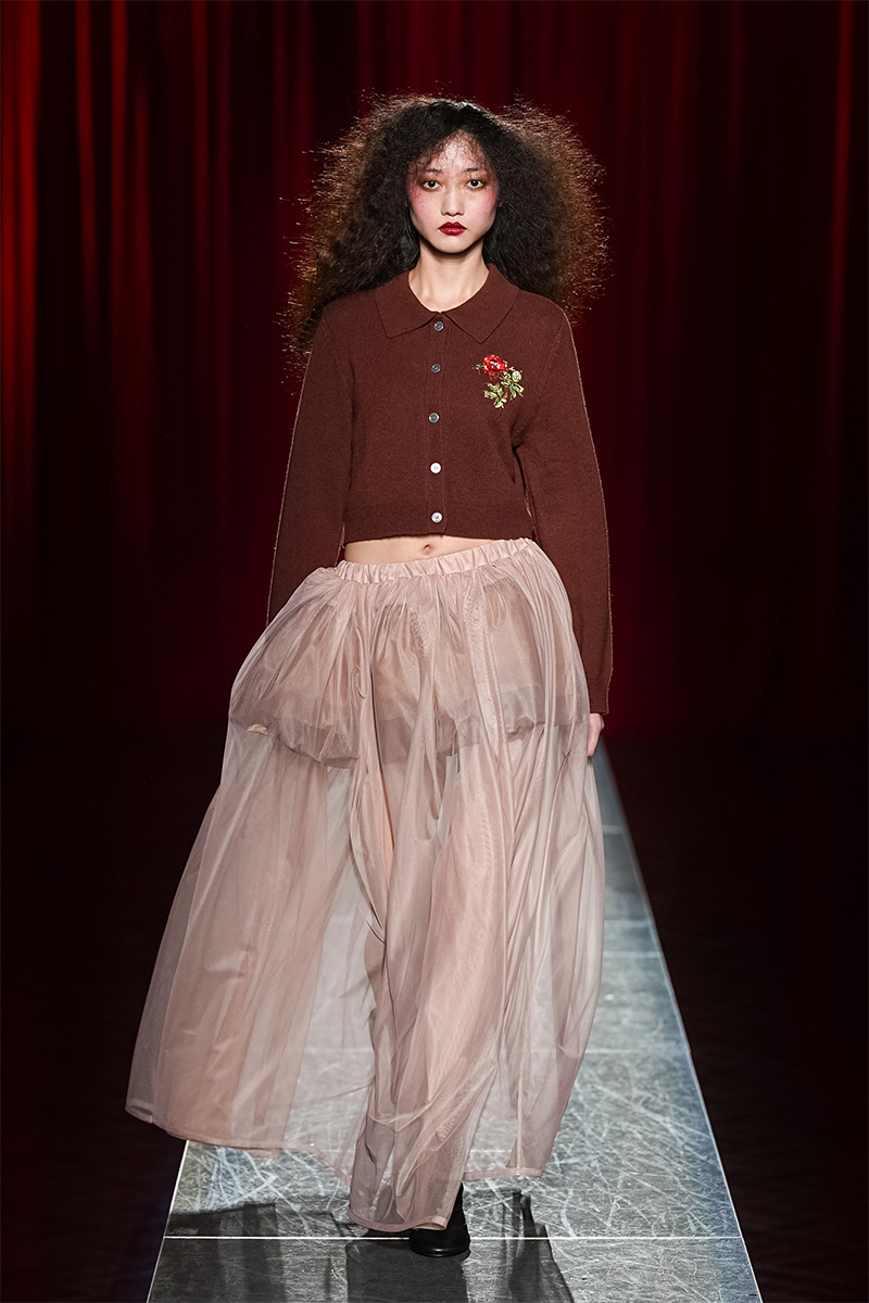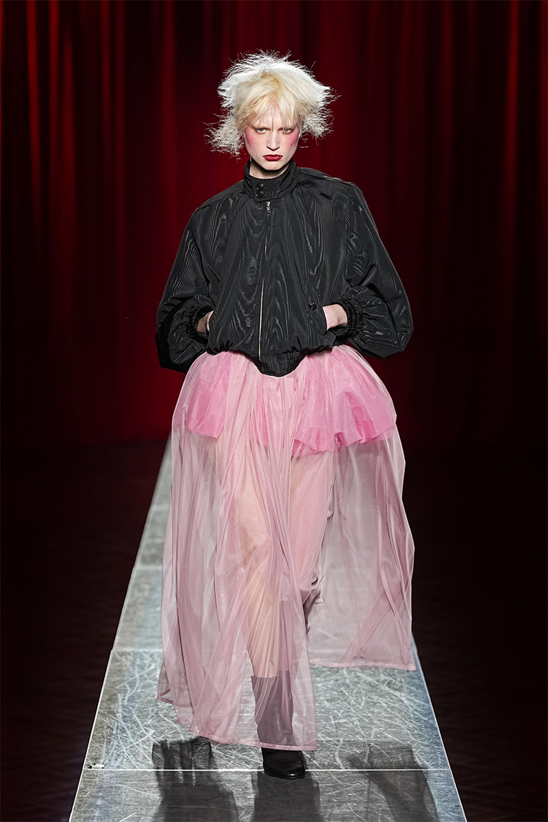 さらに新鮮だったのは豊かに広がる腰のラインで、ギャザーをたっぷり寄せたソフトチュールのロングスカートの中に、チュールとオーガンジーのバルーンミニスカートを仕込んだボトムや、同じ手法で、細いウエストと対をなすように腰を膨らませたレースやスパンコールのマキシドレスなどが登場。KIJIMA TAKAYUKIとの協業で生まれた、ヘアウィッグを思わせるハットも、チャーミングなアクセントとなっていた。