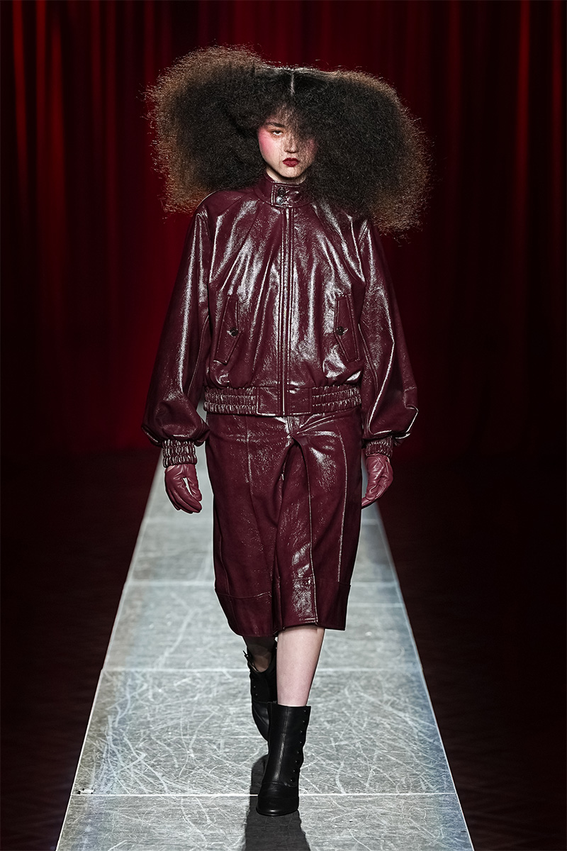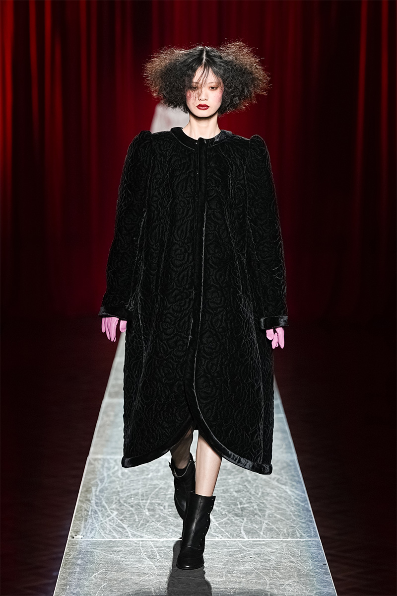 ブランドの代名詞であったチュールの使用は限定的となり、ウール、ベルベット、レース、エコファー、合成皮革といった多彩な素材がコレクションを彩った。近年のヴィヴィアーノが力を注ぐテキスタイルの探求も、今シーズンは更に深化。特に美しく際立っていたのは、イタリアの織機を用い、1980年代の高品質な生地を現代の糸で再現したウールだ。