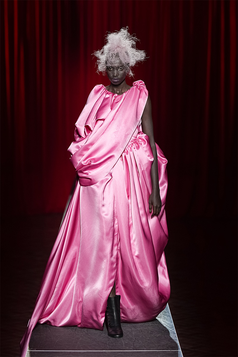 フィナーレを彩ったのは、シルクサテンのアシンメトリードレス。計算し尽くしたパターンから服を構築するというこれまでの手法を一度手放し、ドレーピング(立体裁断)によって形作られたこのドレスは、目の覚めるようなショッキングピンクの色香とともに、大胆不敵かつ自由な女性像を描き出した。コントロールしきれない布の動きを肯定するドレーピングから生まれた、スカートやブラウスの不定形な美しさも、着る人の精神を軽やかに解放することだろう。ヴィヴィアーノが提示するデイリー・クチュールは、定型を持たない自由と、その先に広がる無限の可能性を鮮烈に体現していた。
