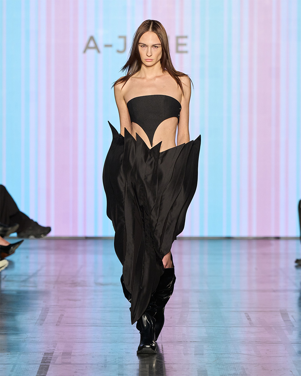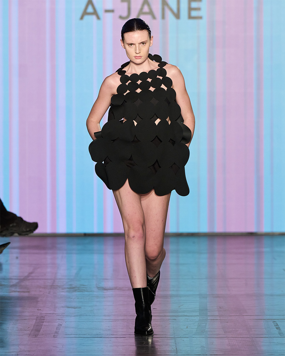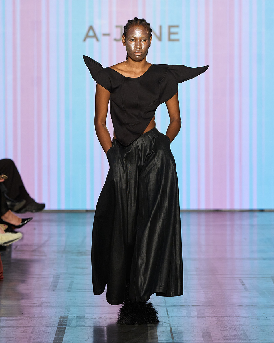 アリス=ジェーン・チャンによるA-JANEは、現代の実験的な音楽を着想源にしたコレクションを発表するファッションレーベル。今季は、ドイツの作曲家、ヘルムート・ラッヘンマンによるチェロ独奏曲「Pression」にインスピレーションを得て、「音の輪郭」を具現化した。音のイメージをシャープなテーラリングと彫刻的なシルエットで表現する、クールでフューチャリスティックなムードが魅力的。また、コレクションはサステナブル素材とゼロウェイストの技術で制作されているといい、エッジーなデザインに持続可能な付加価値を与えている。