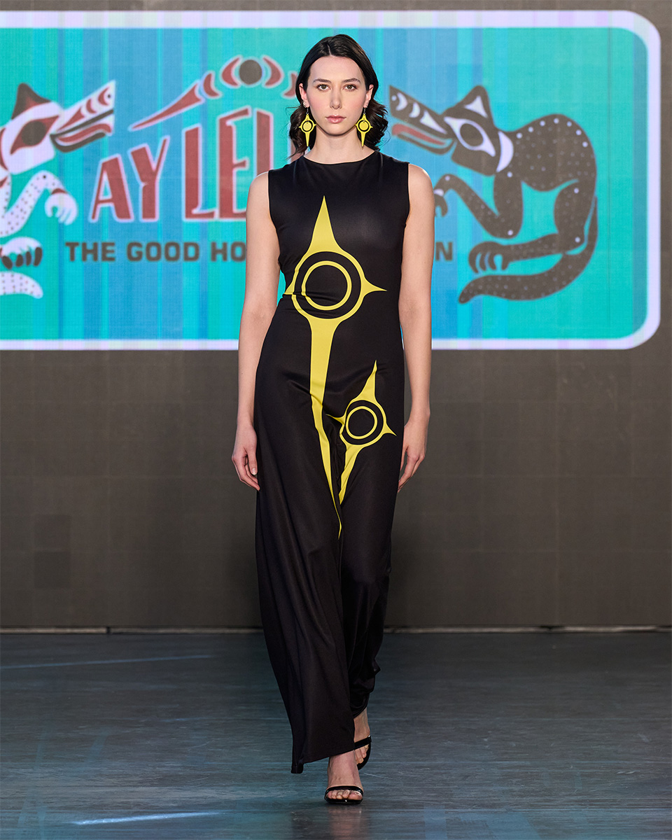 アイ レルムは、カナダのブリティッシュ・コロンビア州に位置する先住民族、スナネイムク・ファースト・ネーションの首長家系に生まれた姉妹によるブランド。今季は、姉妹の父と兄による伝統的なアートワークを大胆に用いたクチュールコレクションを展開した。地元の職人たちとアトリエで制作したという、持続可能で包摂的なものづくりの姿勢も現代的。服を通して文化の継承を行なうアティチュードに、ファッションの美しい未来が示唆されているよう。