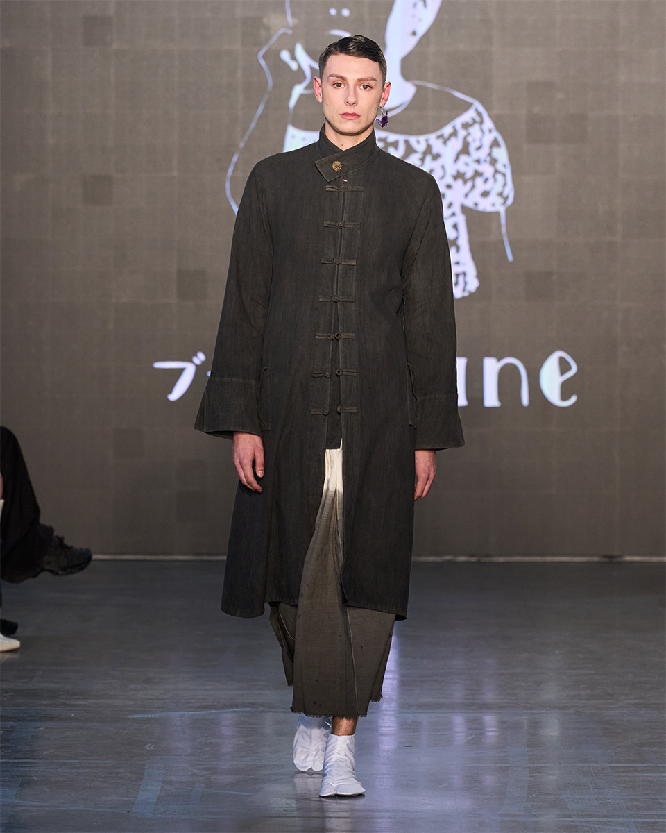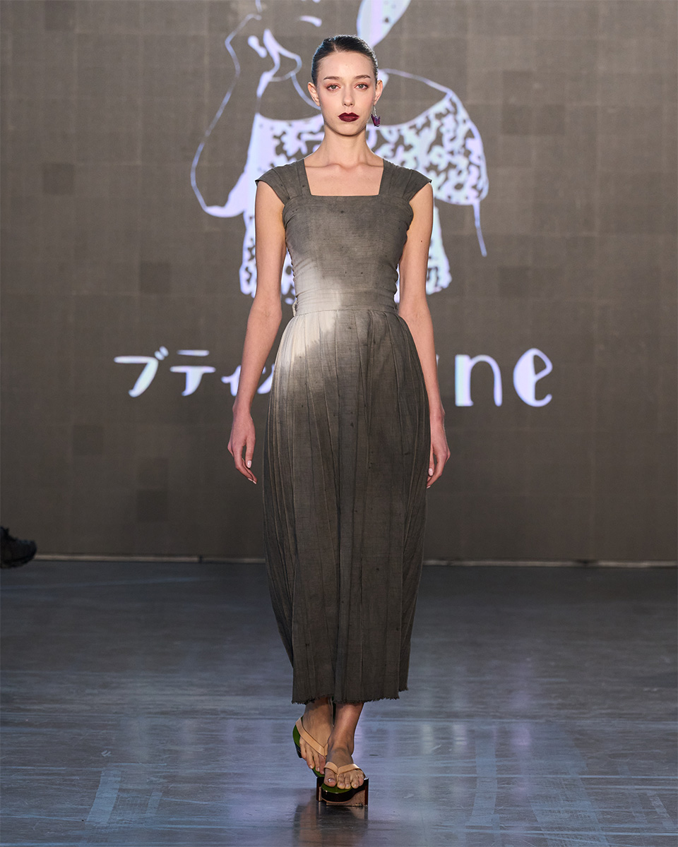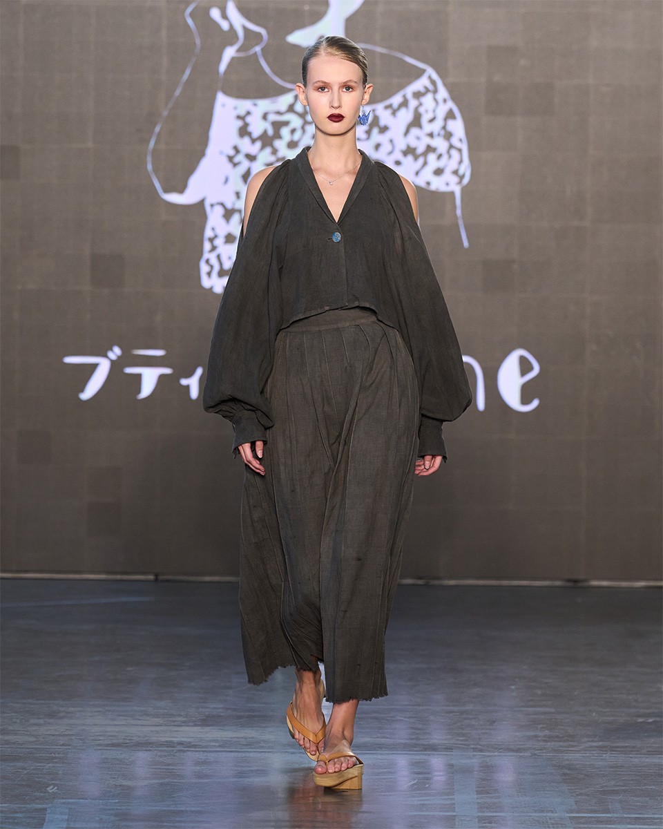 香川県の伝統工芸品である「保多織(ぼたおり)」を多く用いてコレクション制作を行うブティックジューンは、「Light and Shadow(光と影)」をテーマにコレクションを発表。生地表面の凹凸を通して、光が織りなす詩的な表現を探求した。さらに生地は日本の伝統的な墨で染め上げられ、漆塗りボタンも使用。日本の職人技を讃えるそのクリエイションには、タイムレスな優雅さが宿る。気品と儚さが同居するデザインは、会場を静謐な空気で満たしていた。