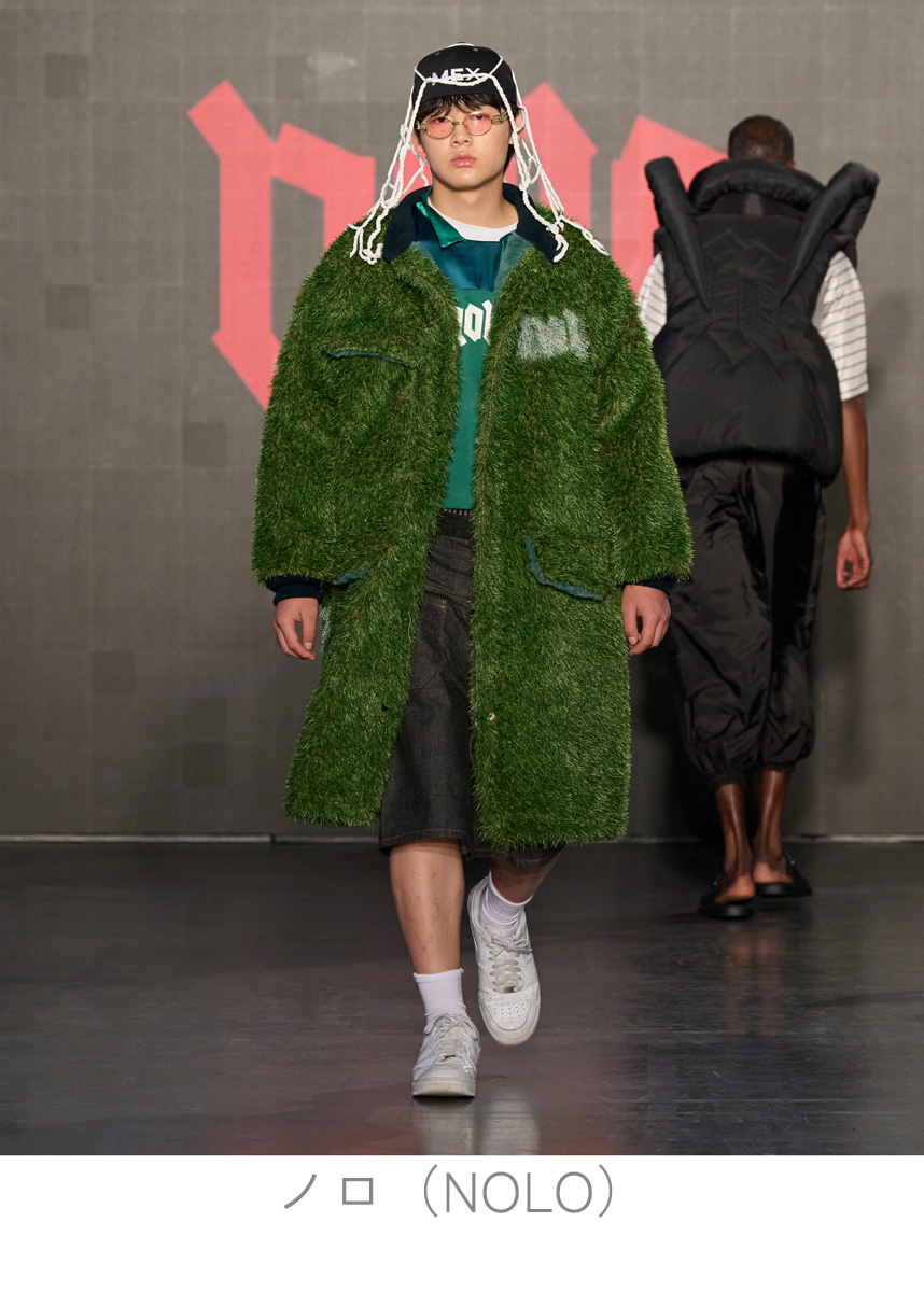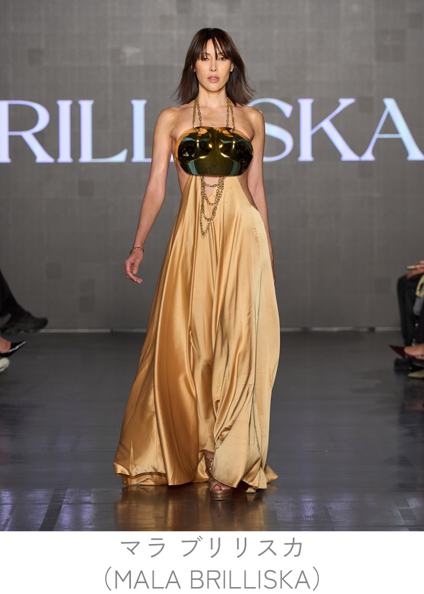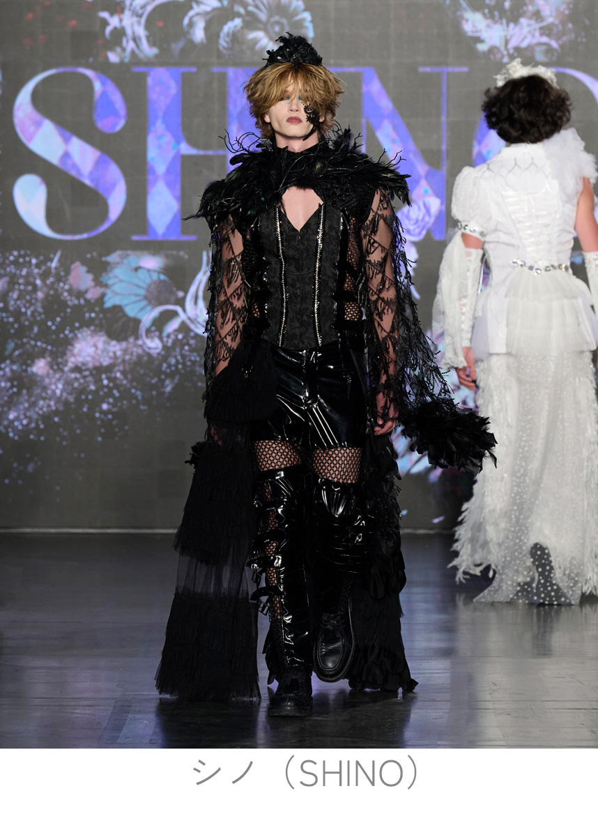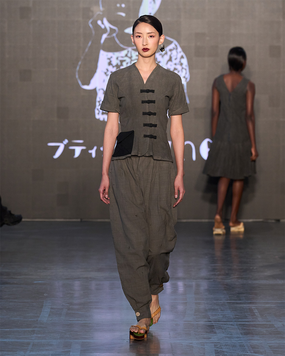 香川県の伝統工芸品である「保多織(ぼたおり)」を多く用いてコレクション制作を行うブティックジューンは、「Light and Shadow(光と影)」をテーマにコレクションを発表。生地表面の凹凸を通して、光が織りなす詩的な表現を探求した。さらに生地は日本の伝統的な墨で染め上げられ、漆塗りボタンも使用。日本の職人技を讃えるそのクリエイションには、タイムレスな優雅さが宿る。気品と儚さが同居するデザインは、会場を静謐な空気で満たしていた。