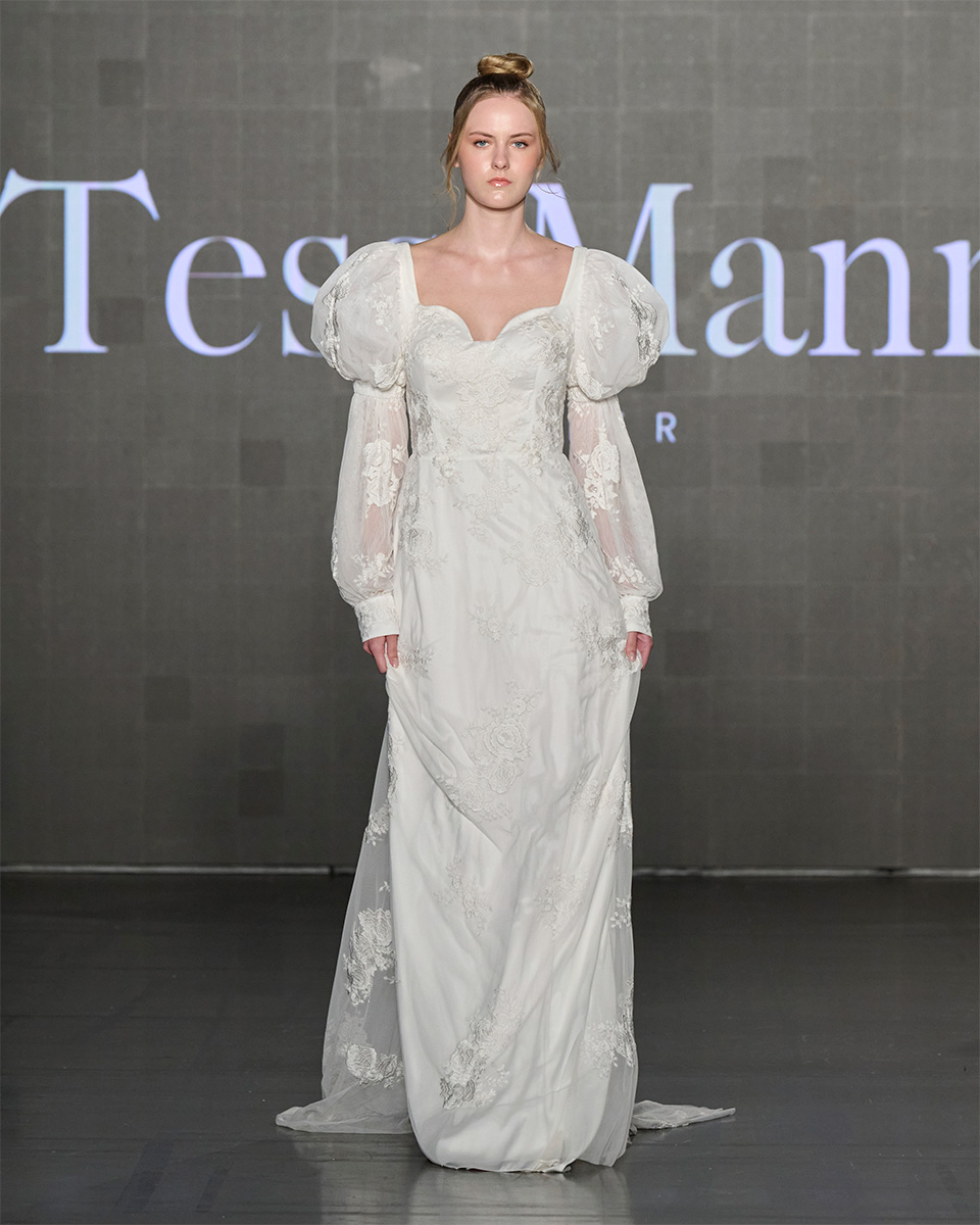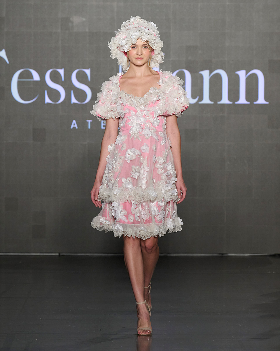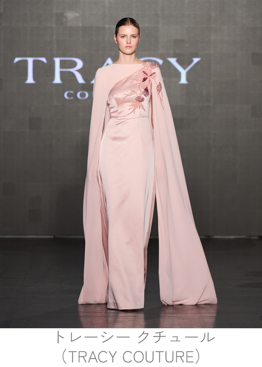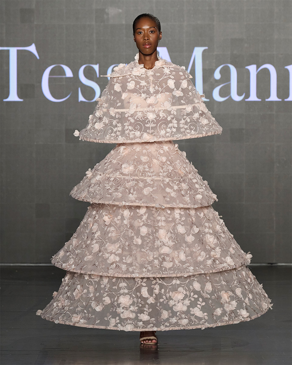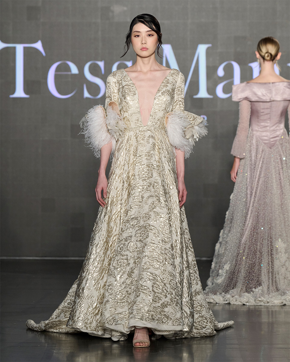 元FBI捜査官という異色の経歴を持つデザイナー、テス・マンによるブランド。今季は「Le Jardin(ル・ジャルダン)」をテーマに、ベルサイユ宮殿からインスピレーションを得たロマンティックなクチュールコレクションを展開した。シルクオーガンジーのブロケードや花の手刺繍、オーストリッチの羽根、立体カフス、金のラメ地などを用い、緻密な職人技によって作り上げられたドレスの数々は、まさに「着る芸術」。しかしそこには大人しいエレガンスがあるのみでなく、女性のパワーを引き出すモダニティも同居していた。