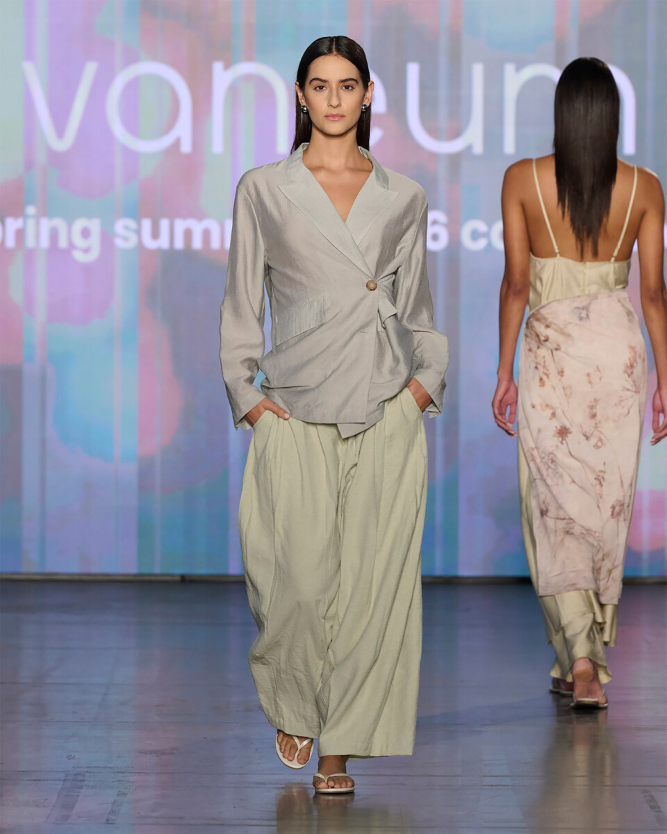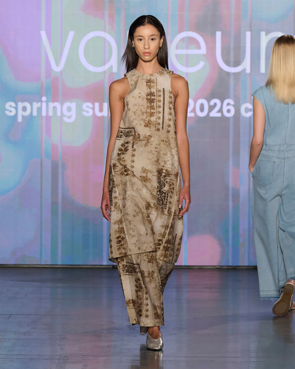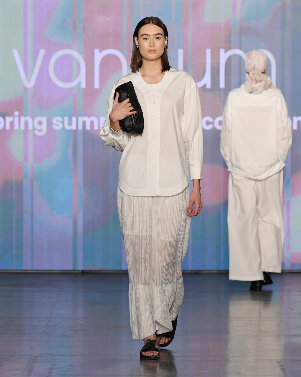 「長く寄り添う、上質な日常着」をコンセプトとするブランド、バニュームは「Impressions of Margin/余白の印象」と題したコレクションで、静けさの中にある高揚と、抑制の中の静かな強さを提示した。日常に溶け込みながらも強い印象を残すアイテム群は、シアー素材とリネンを多用した、実用性と美しさの均衡がとれたもの。ベージュやホワイトを基調に、柔らかなグリーン、ピンク、ブラウン、ブラックを差し色にした落ち着きのあるカラーパレットで、控えめで誠実ながら、深い存在感を残した。