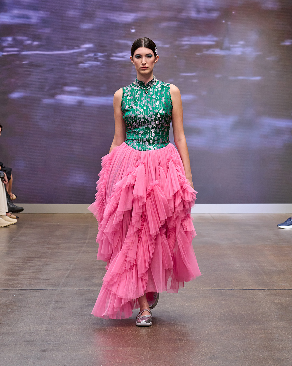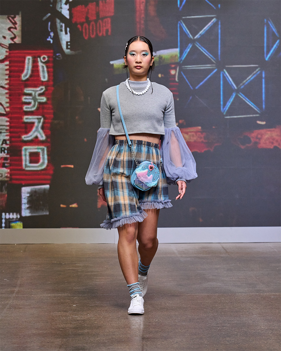 「毎日を夢見る人のための現代的な婦人服」をテーマに、チェックや水玉模様を多用した鮮やかな色彩のガーリーなアイテムを展開するアレックス・S・ユー。2026年春夏コレクション「Mezzo Melancholies」では、岩井俊二監督による映画『リリイ・シュシュのすべて』や2000年代諸島の東アジアのユースカルチャーを着想源に、幻想的なチュールやフリルに実用的なナイロンやフランネルなどを組み合わせたアイテムを展開し、思春期と大人の間でゆれる曖昧さを表現した。夢のような郷愁と優しい反抗心を伴うラインナップは、ブランドならではのフェミニンな世界観を存分に映し出している。