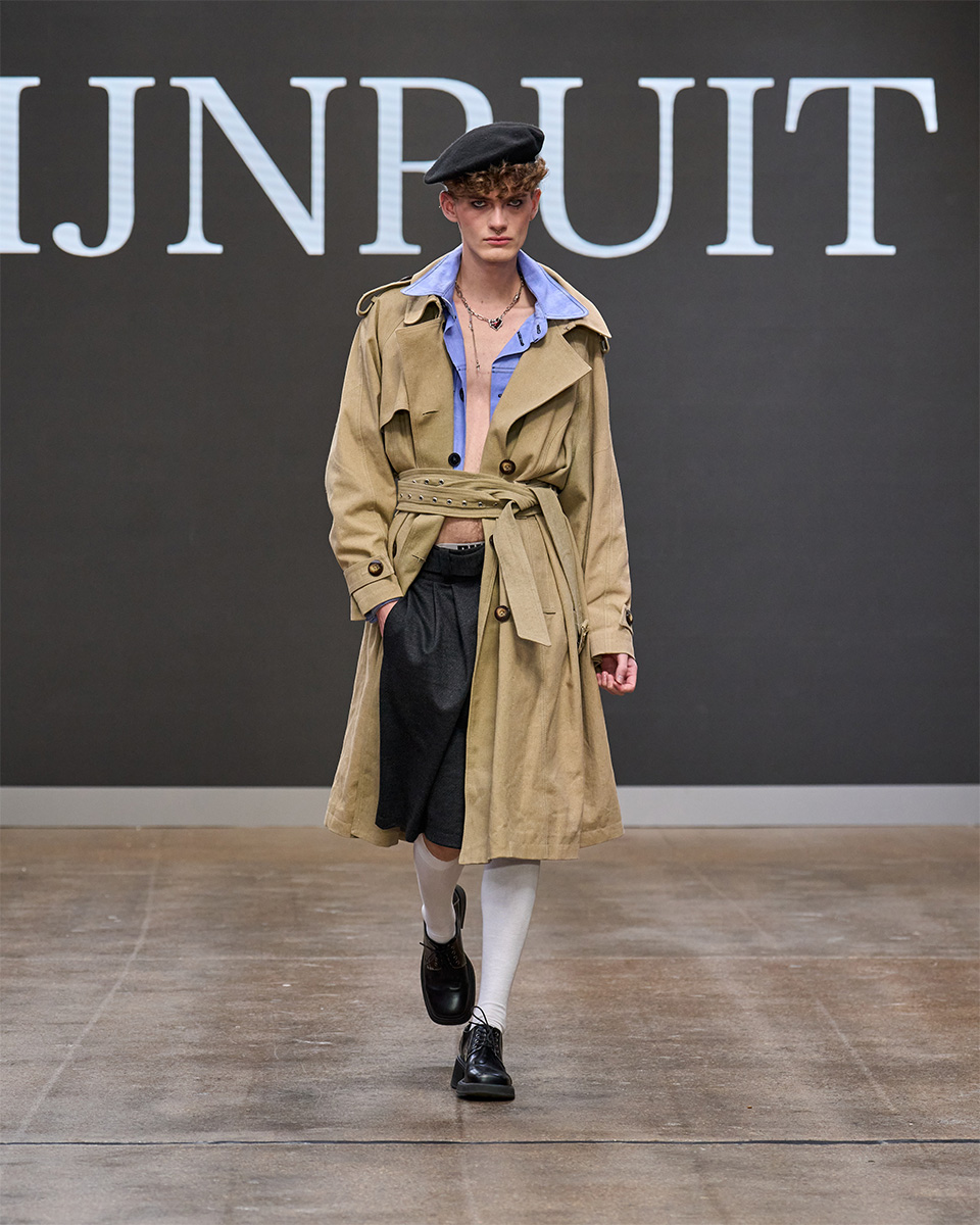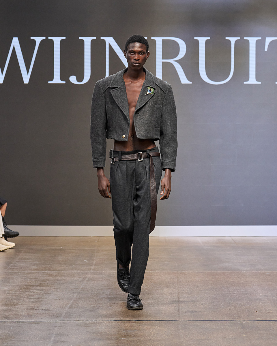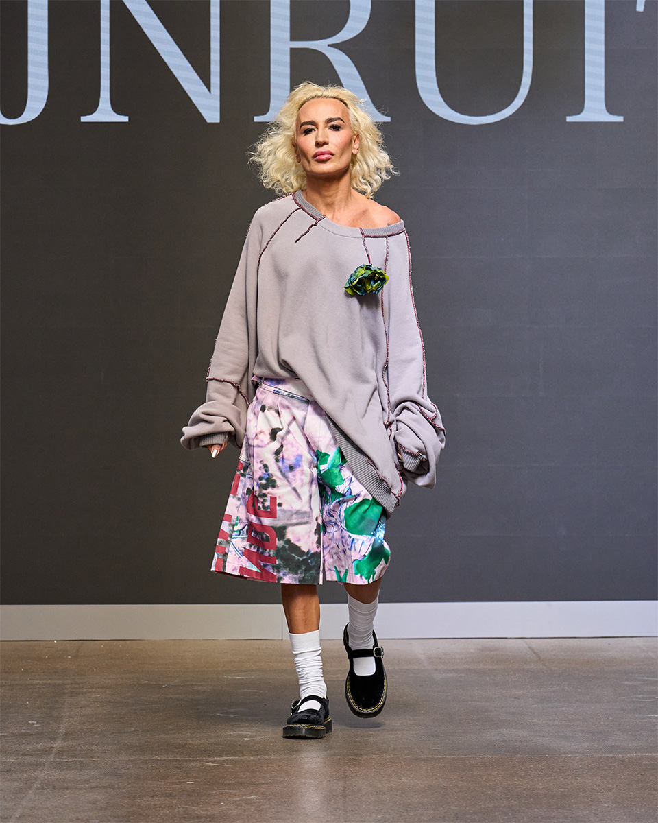 アートやファッションなど様々な分野で活動するクリエイターのジュエル・ケイが手がけるロンドン発ブランド、ヘンルーダ。2026年春夏シーズンでは「OP:1」をテーマに、無骨なバイカースタイルとガーリーなスクールガール風スカート、シャープなテーラリングに繊細なサテン地のアイテムなど、異なる要素を融合させたコレクションで破壊から生成へと至る力強い変容の物語を表現した。本コレクションはルーマニアで開催されたフェーリック・ファッションウィークで高い評価を得た後、ロンドンを舞台にさらなる飛躍を遂げた。