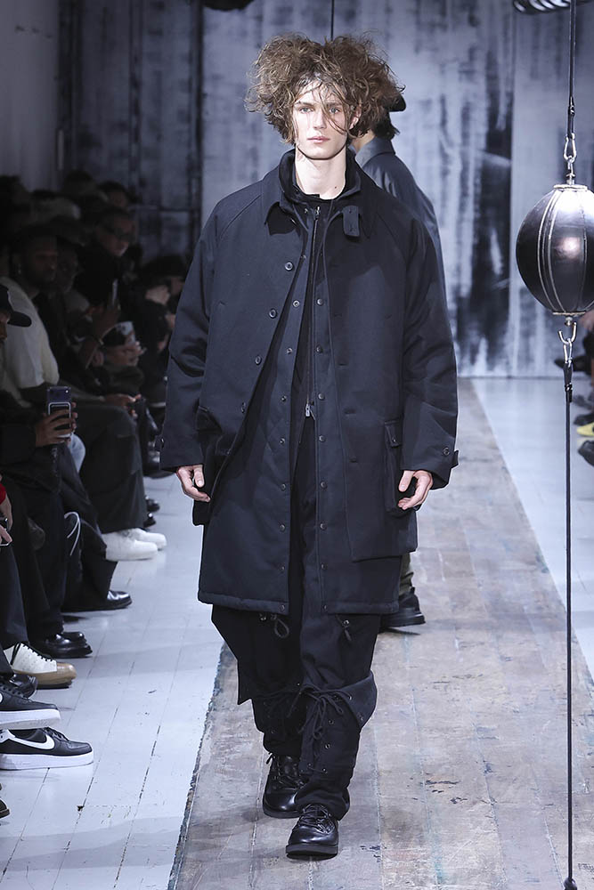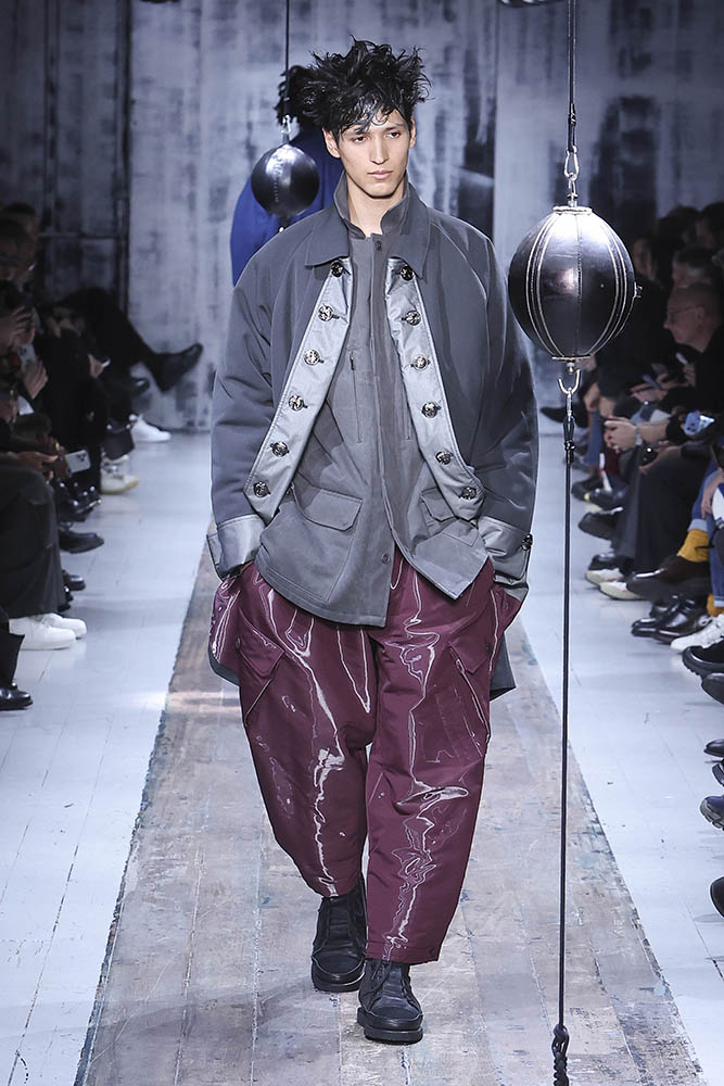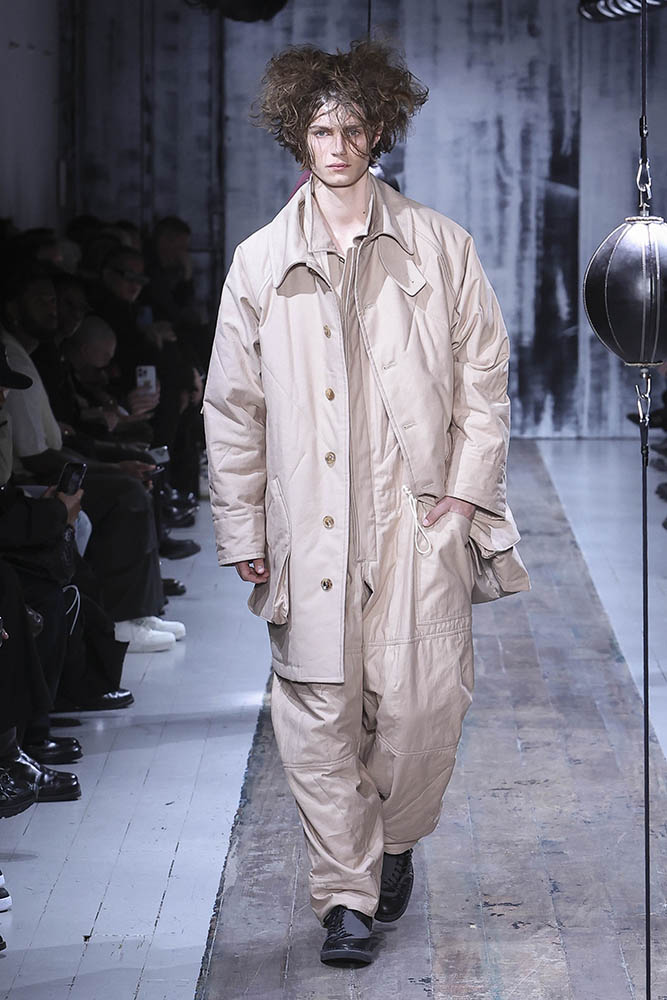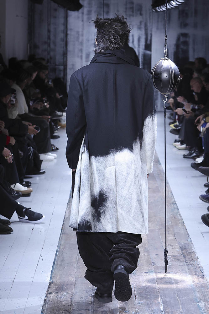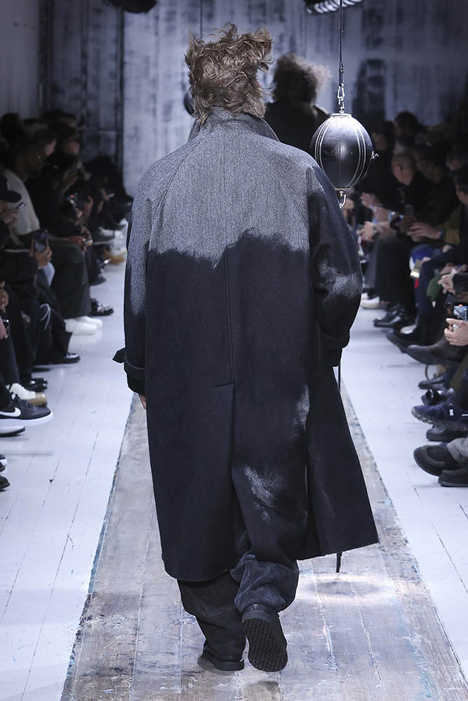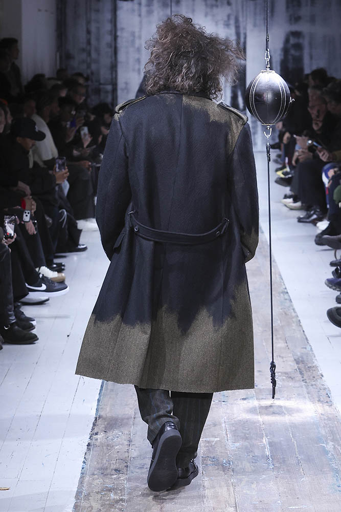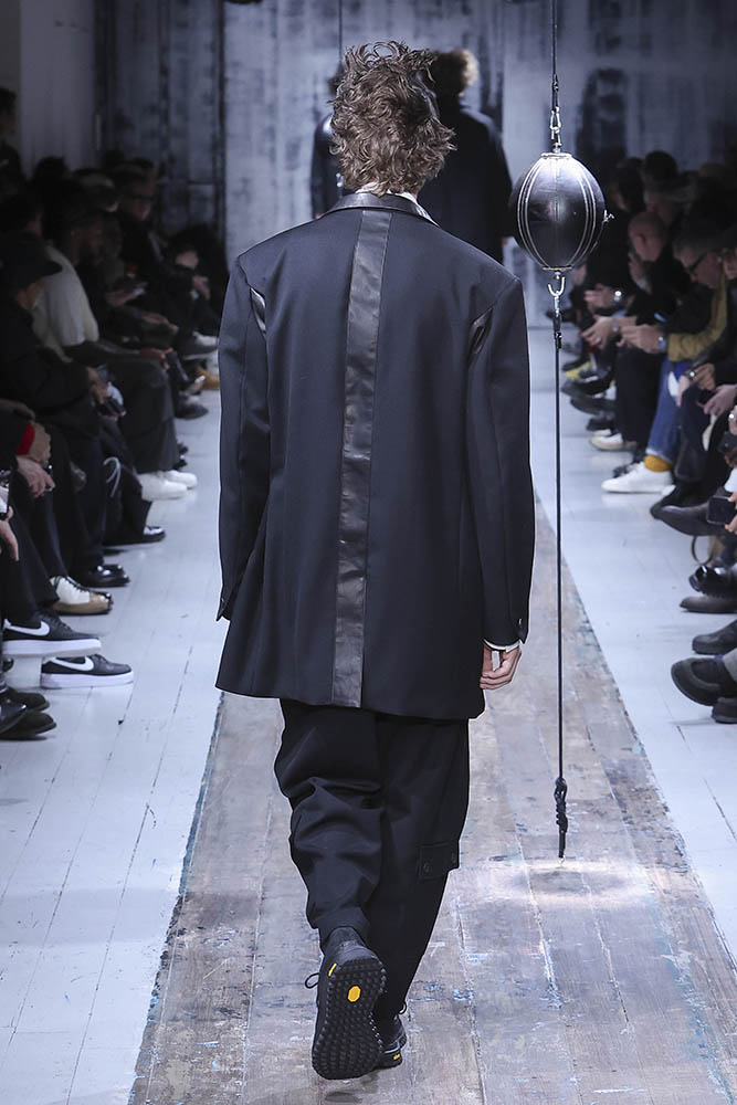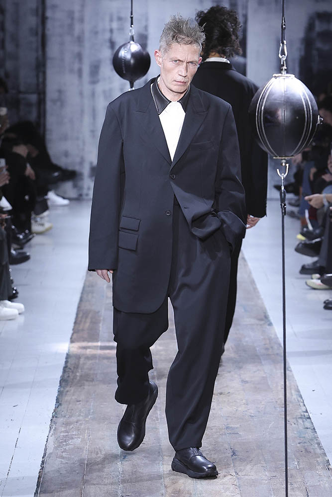 ヨウジヤマモト プールオム(YOHJI YAMAMOTO POUR HOMME)は、ランウェイにボクシング用トレーニングバッグを設置。”戦う男”のイメージを印象づけました。