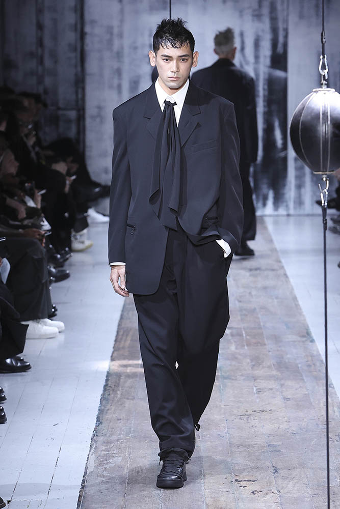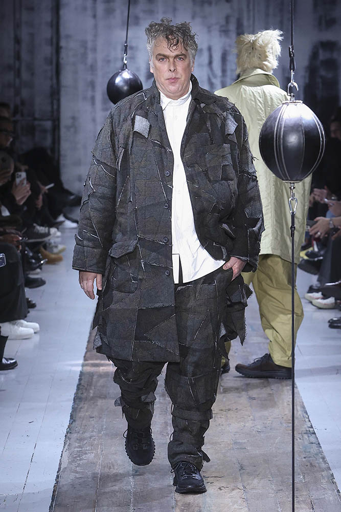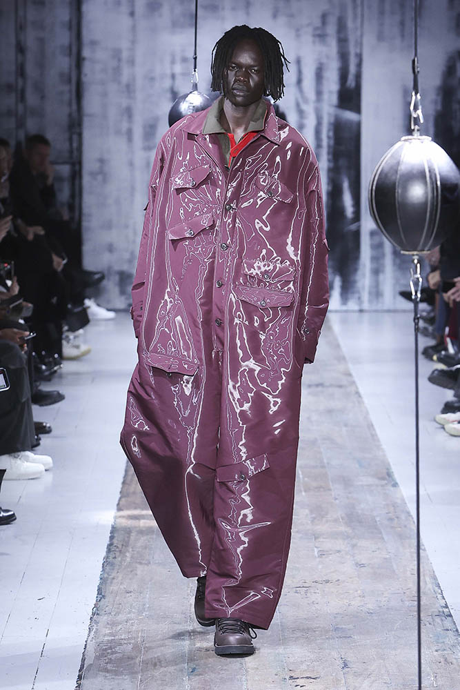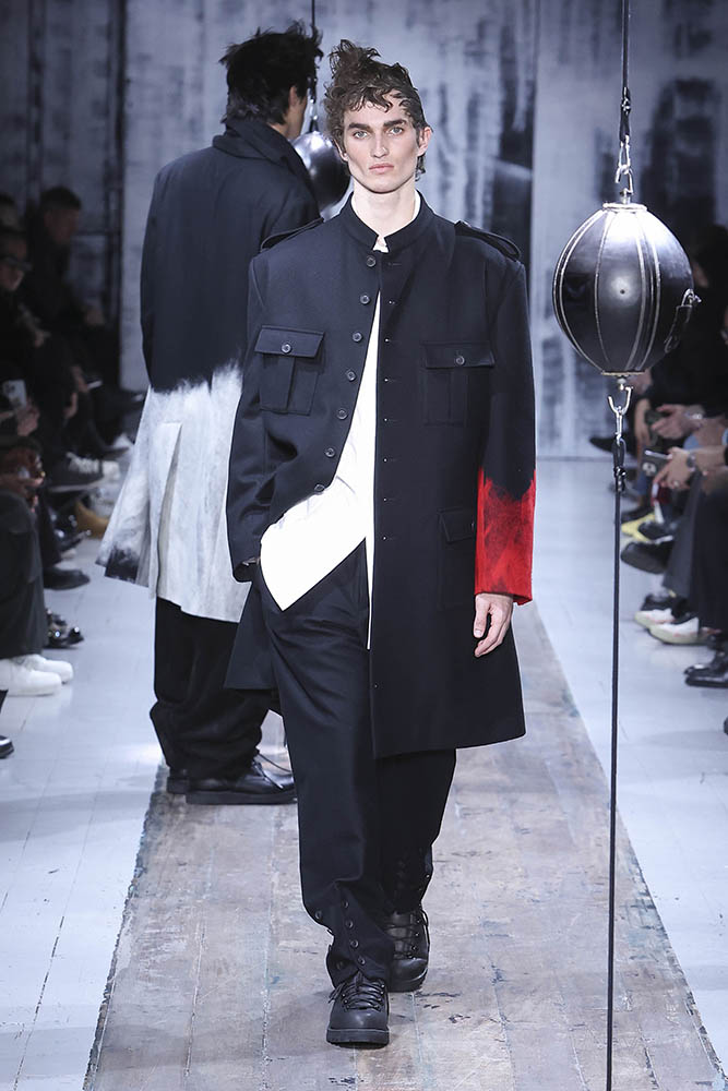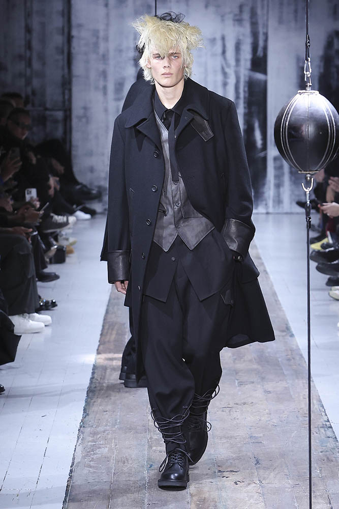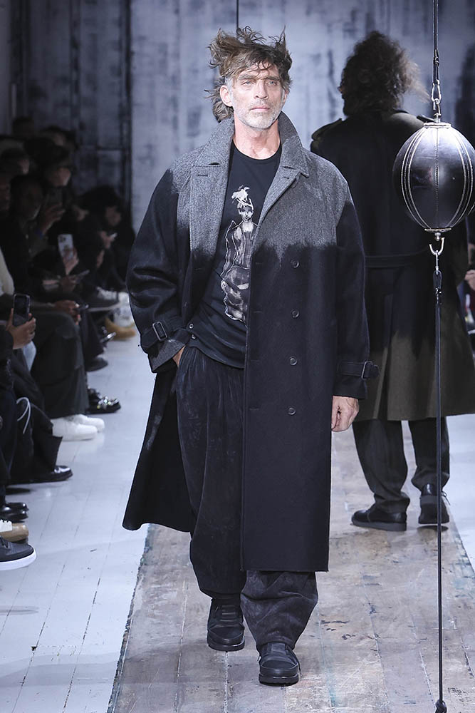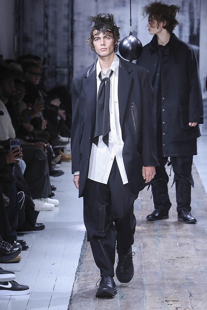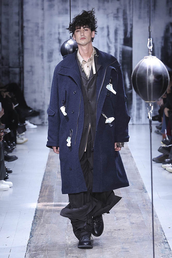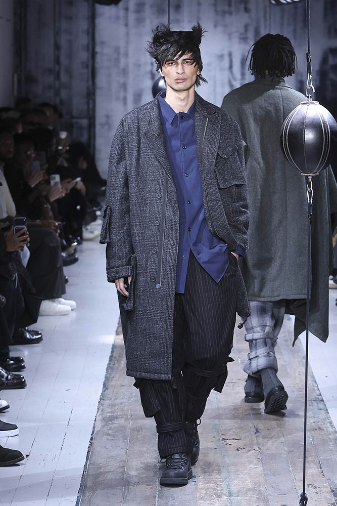ヨウジヤマモト プールオム(YOHJI YAMAMOTO POUR HOMME)は、ランウェイにボクシング用トレーニングバッグを設置。”戦う男”のイメージを印象づけました。