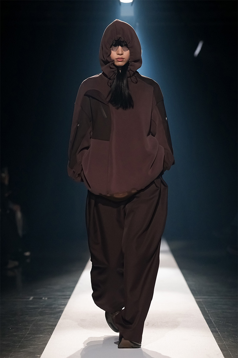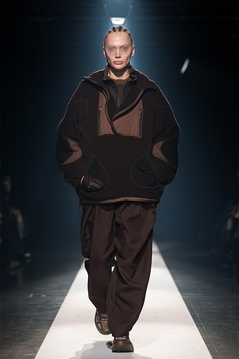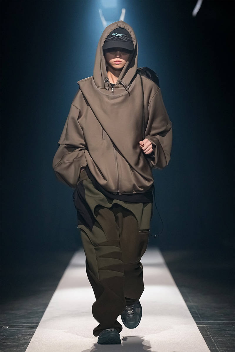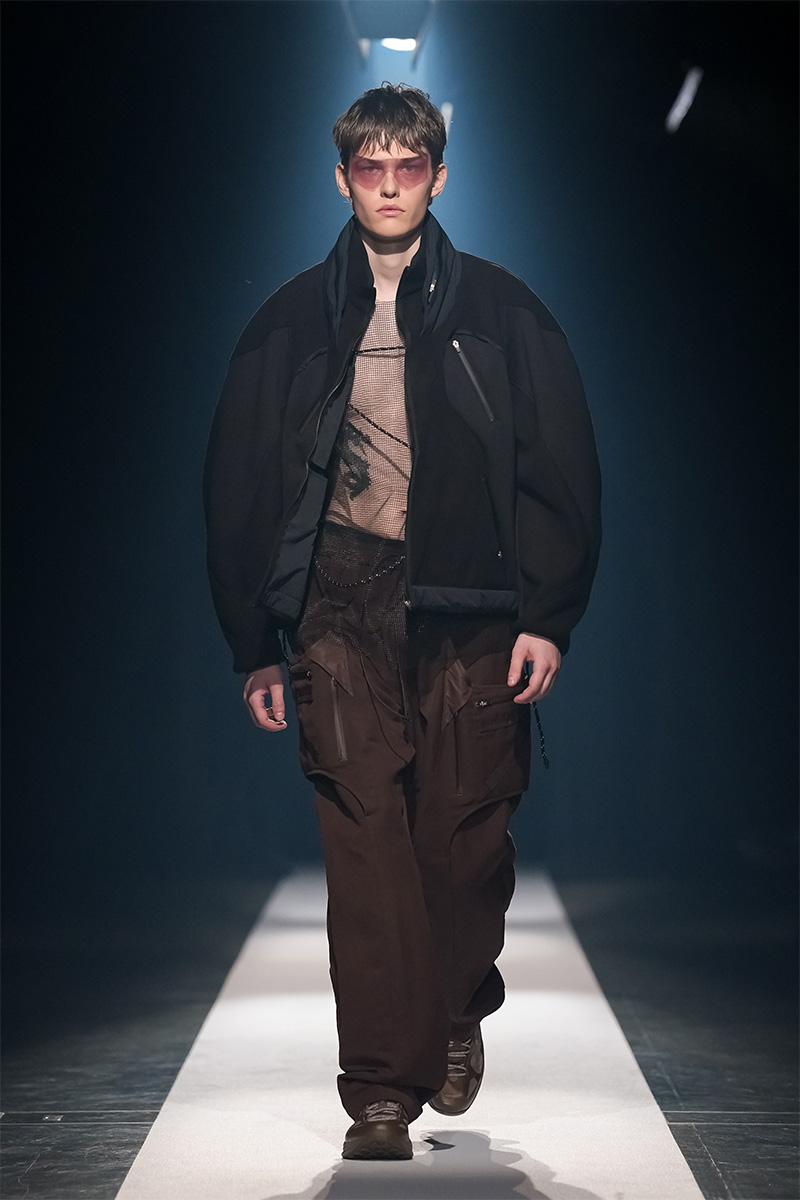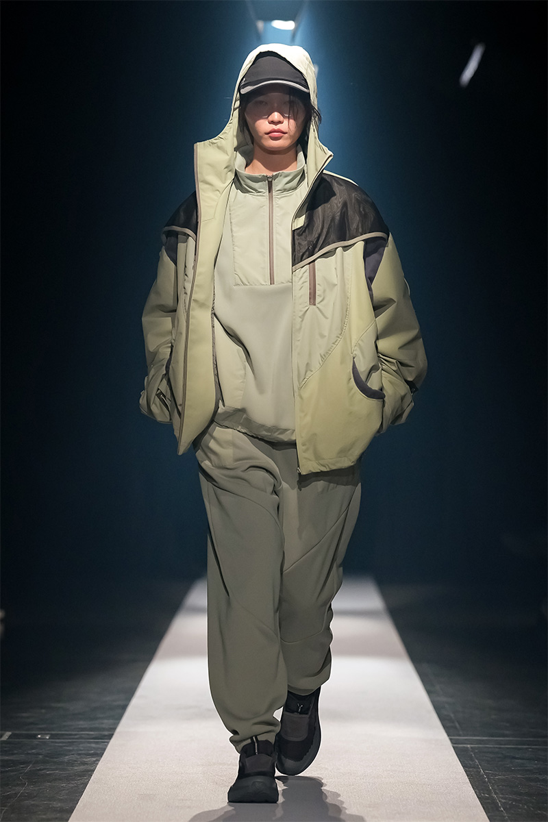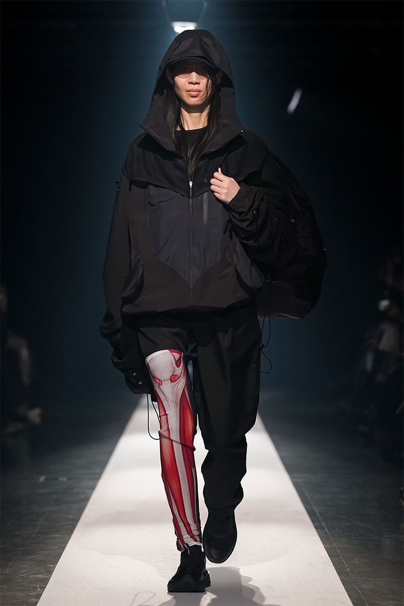特徴的だったのは、曲線を描く切り替え。身体をなぞるように流れるラインが、素材や色を分断していく。だが、その線は有機的ではない。メッシュ、ナイロン、起毛素材が切り替わることで、人体の構造線として機能しているように見えた。
