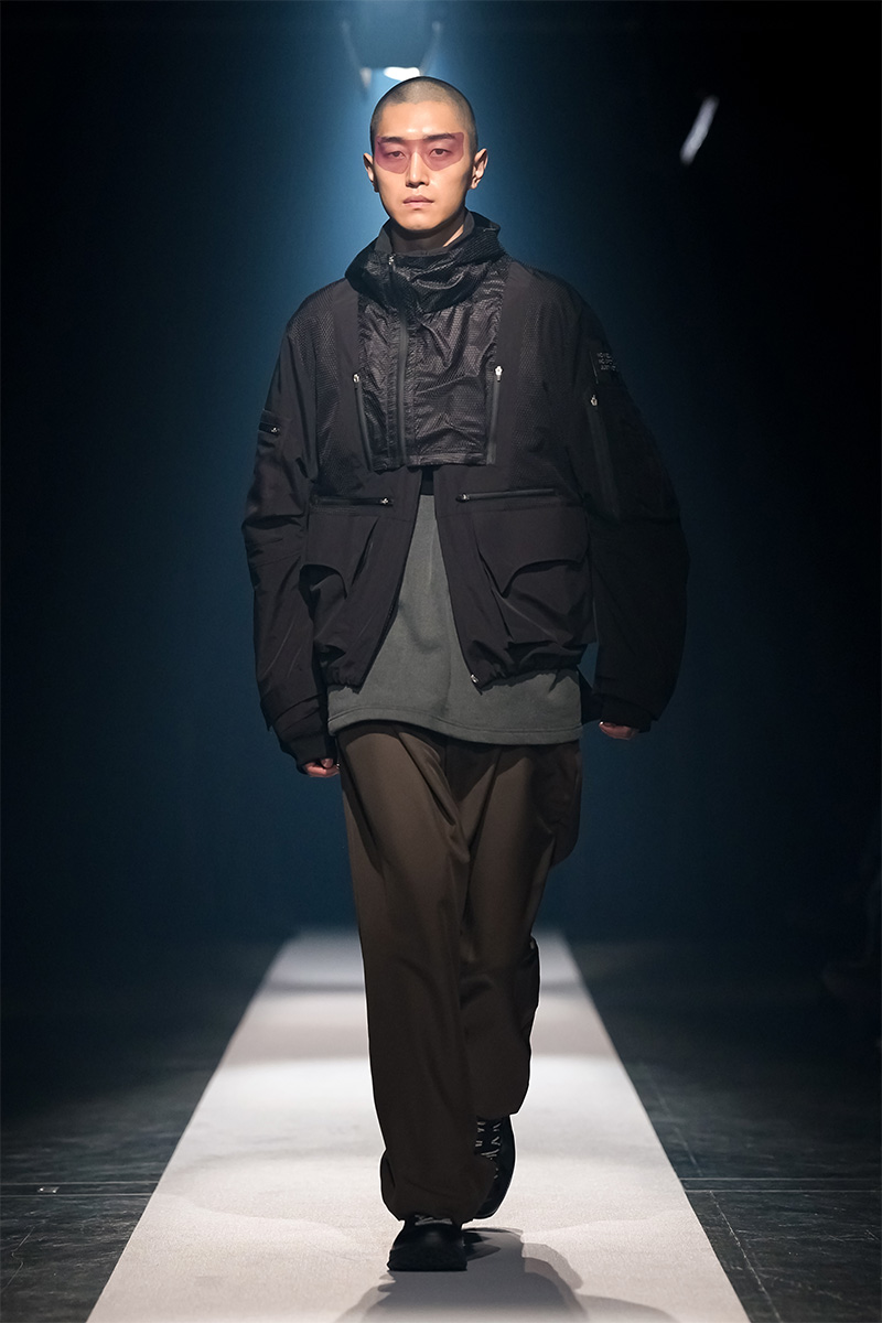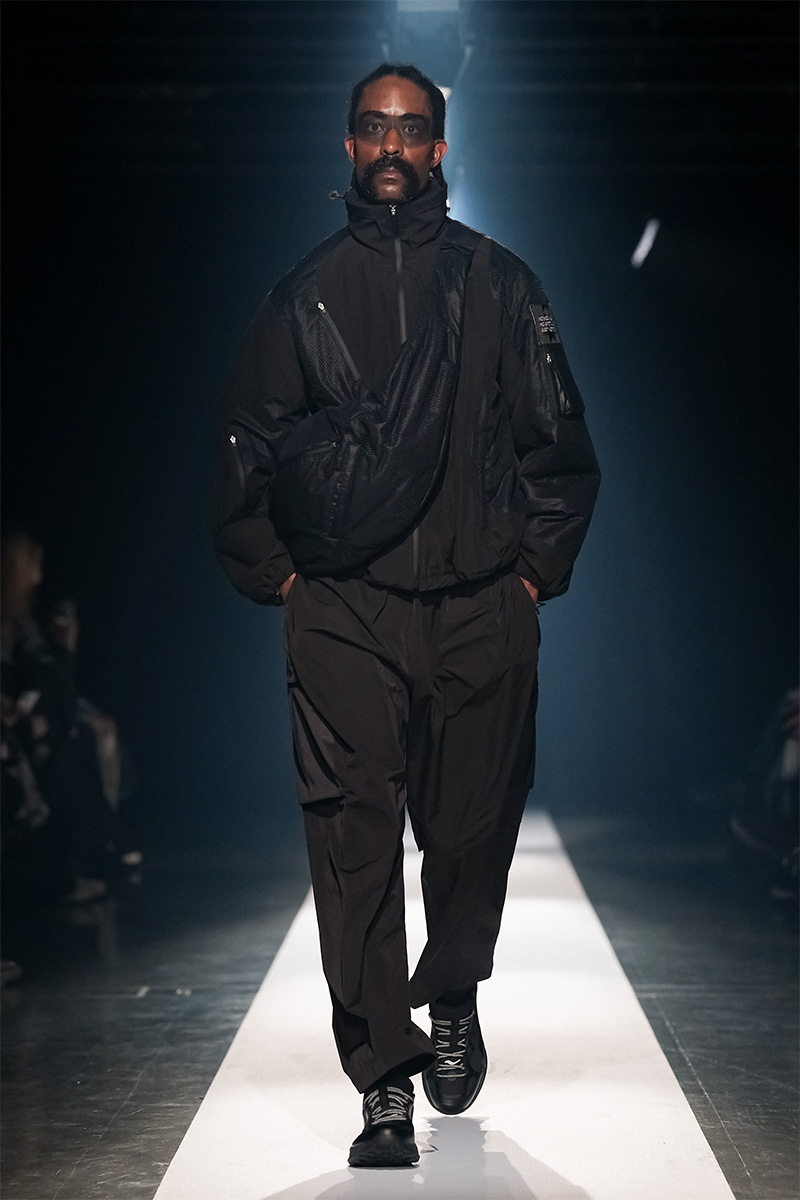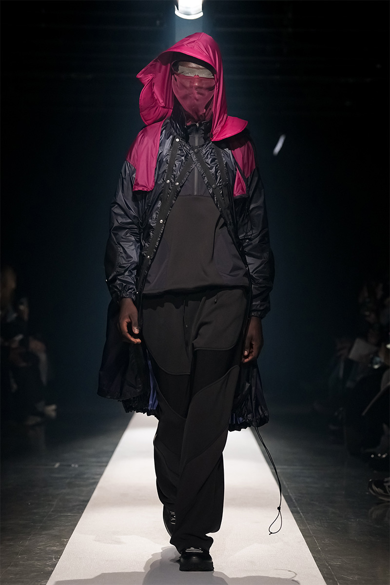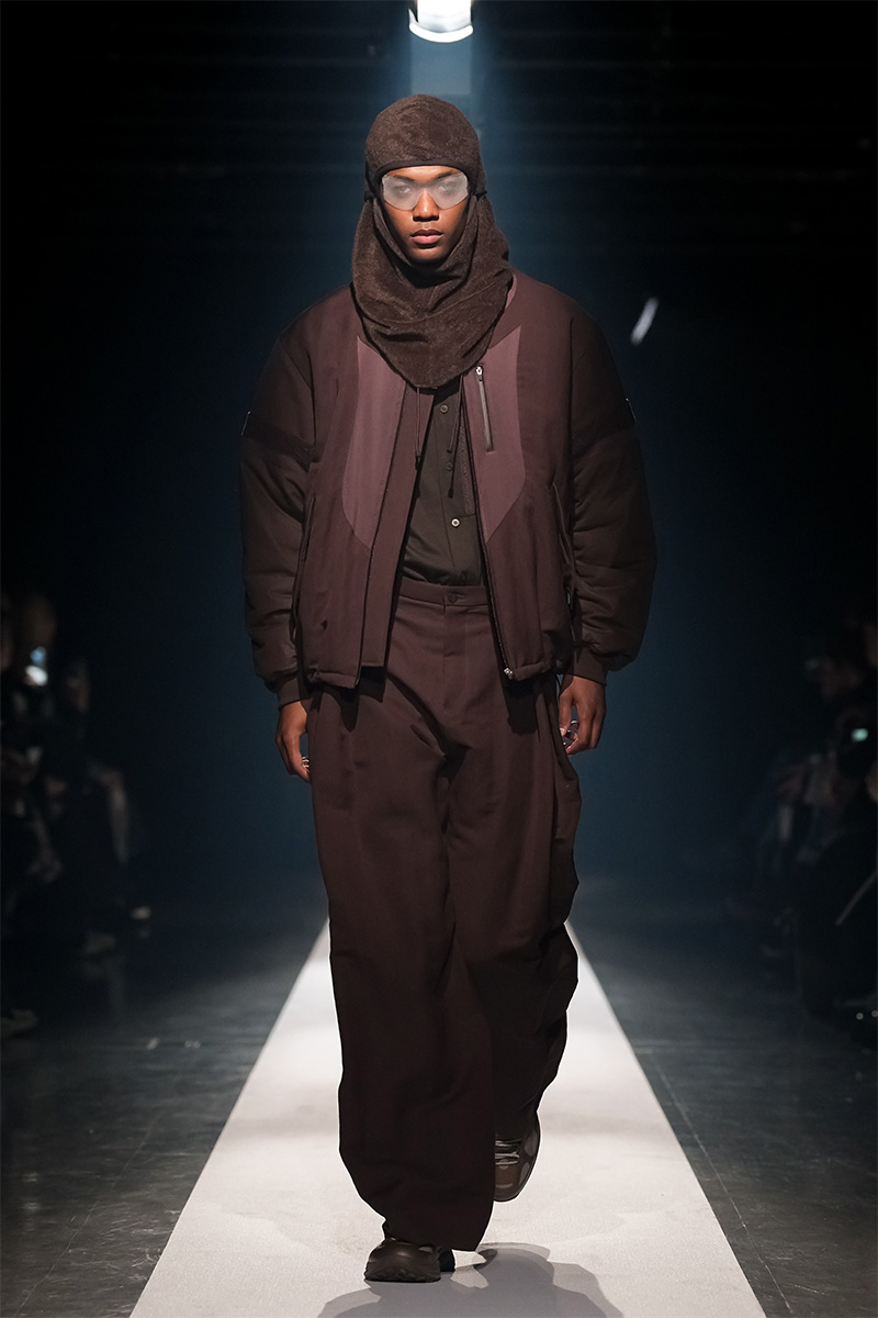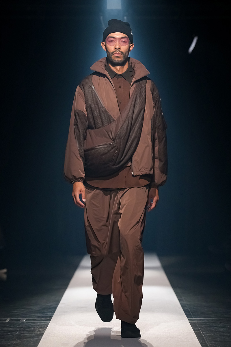 特徴的だったのは、曲線を描く切り替え。身体をなぞるように流れるラインが、素材や色を分断していく。だが、その線は有機的ではない。メッシュ、ナイロン、起毛素材が切り替わることで、人体の構造線として機能しているように見えた。