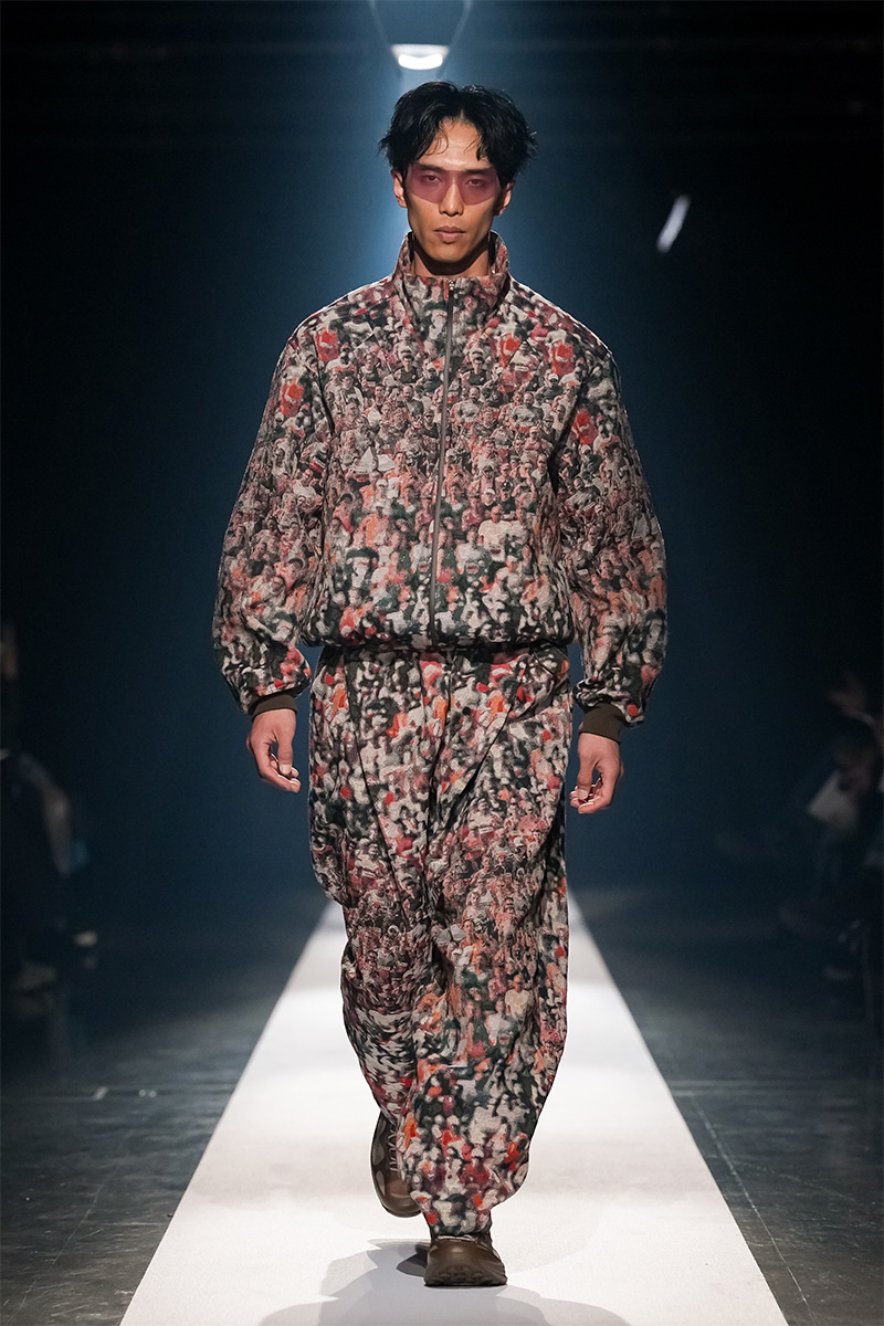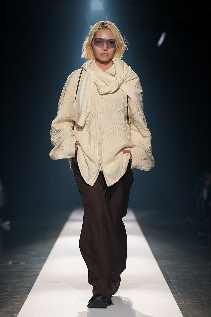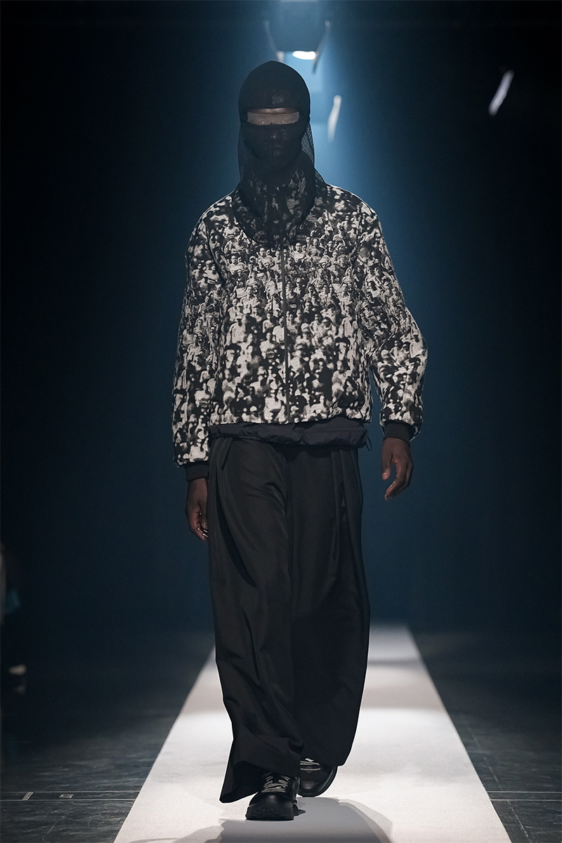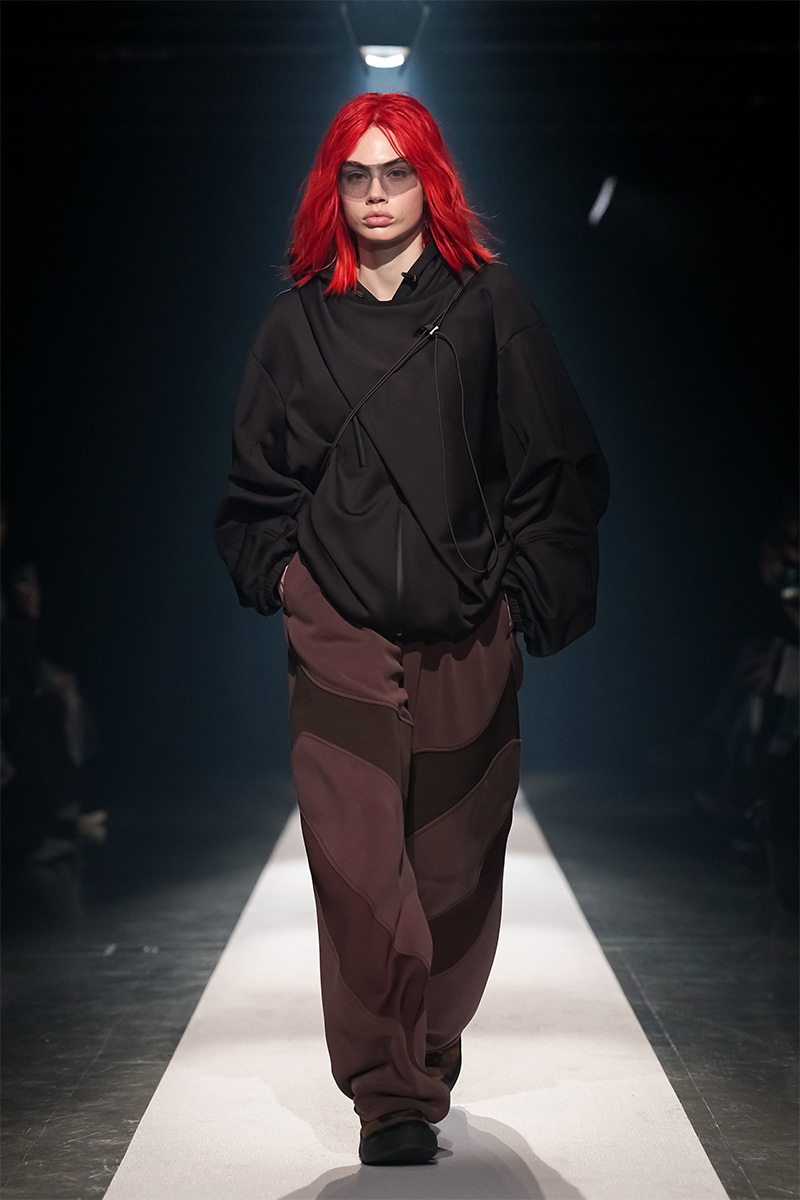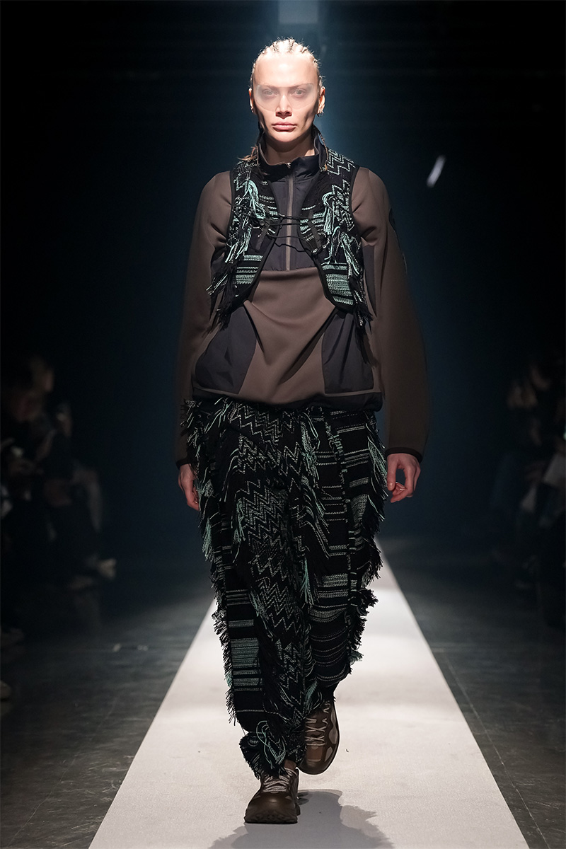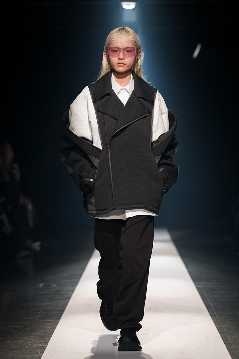 特徴的だったのは、曲線を描く切り替え。身体をなぞるように流れるラインが、素材や色を分断していく。だが、その線は有機的ではない。メッシュ、ナイロン、起毛素材が切り替わることで、人体の構造線として機能しているように見えた。