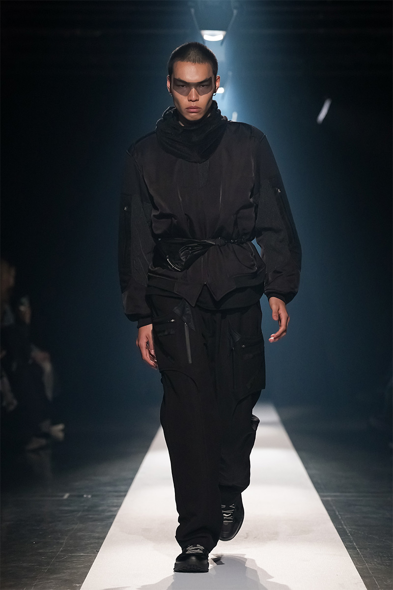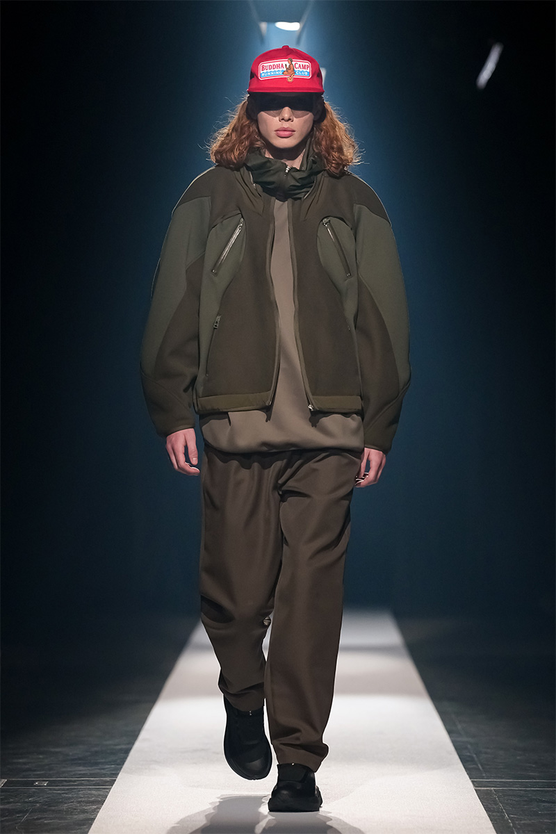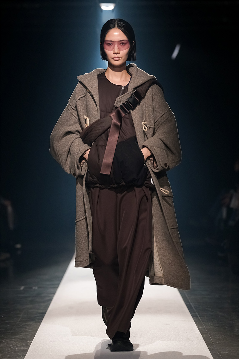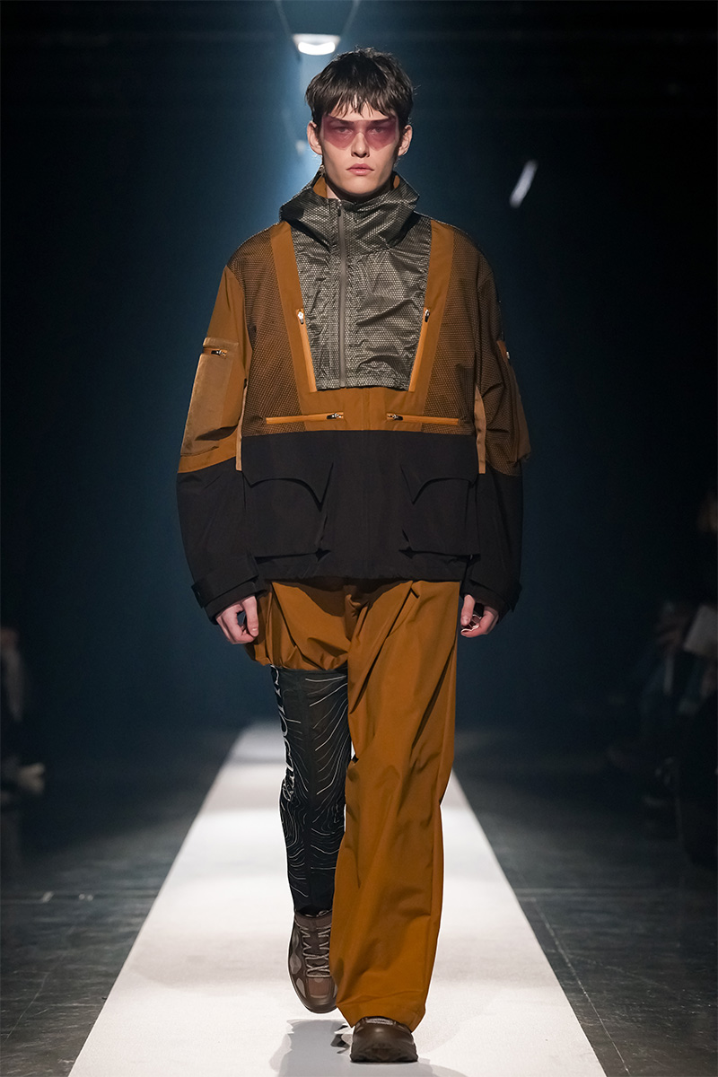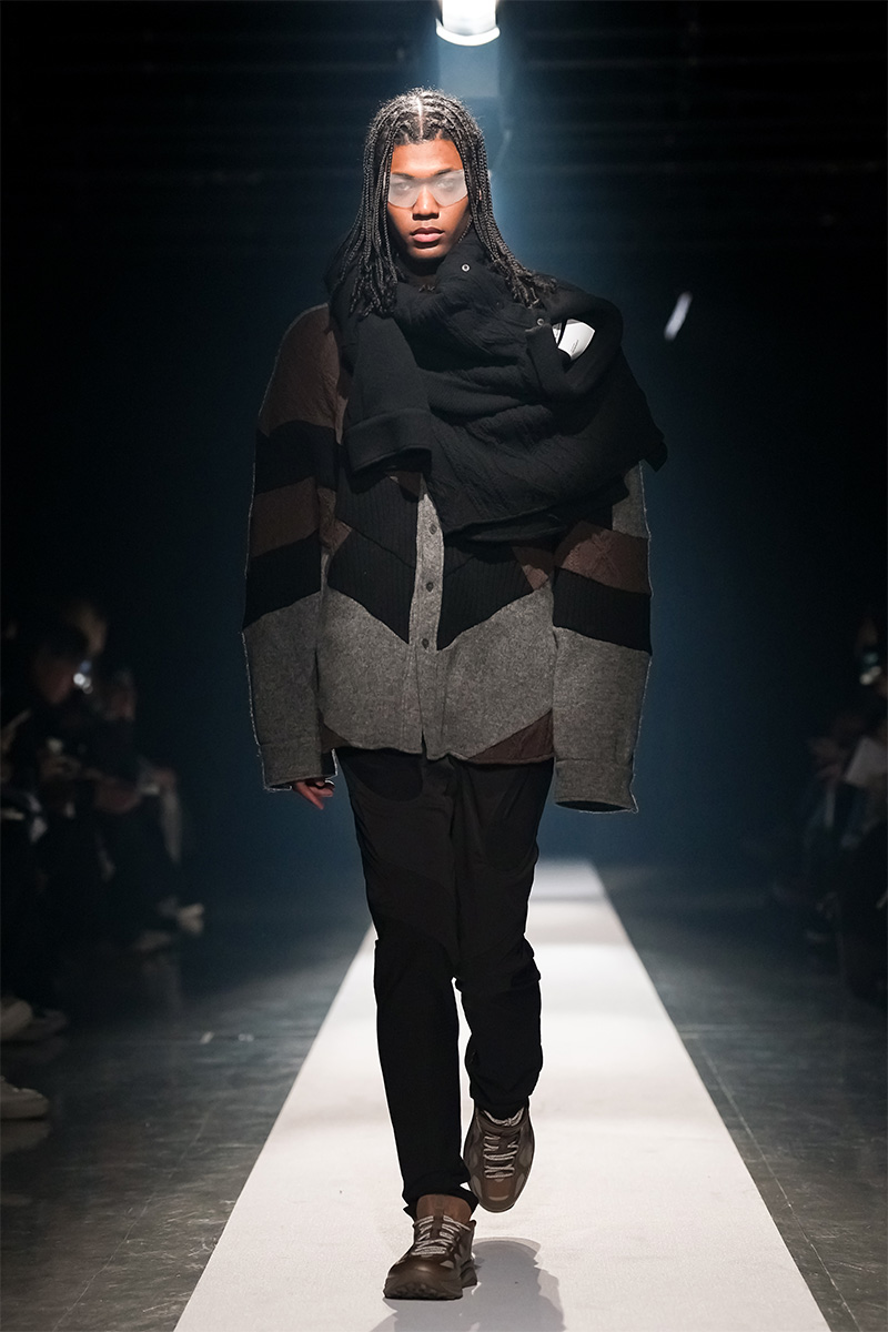 特徴的だったのは、曲線を描く切り替え。身体をなぞるように流れるラインが、素材や色を分断していく。だが、その線は有機的ではない。メッシュ、ナイロン、起毛素材が切り替わることで、人体の構造線として機能しているように見えた。