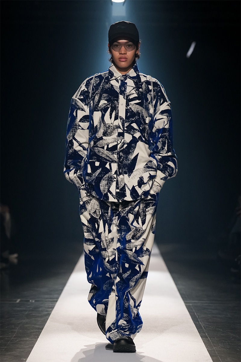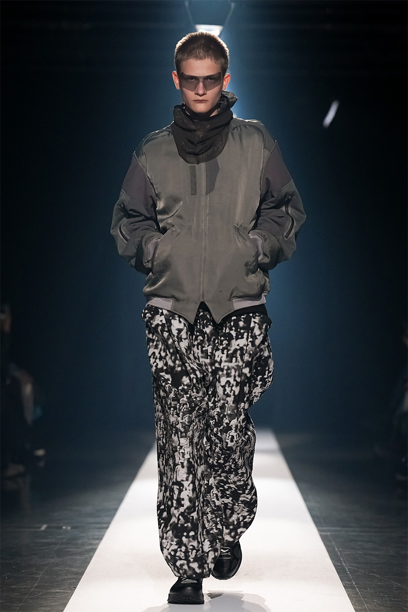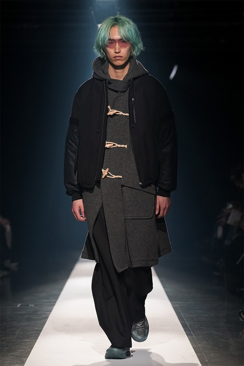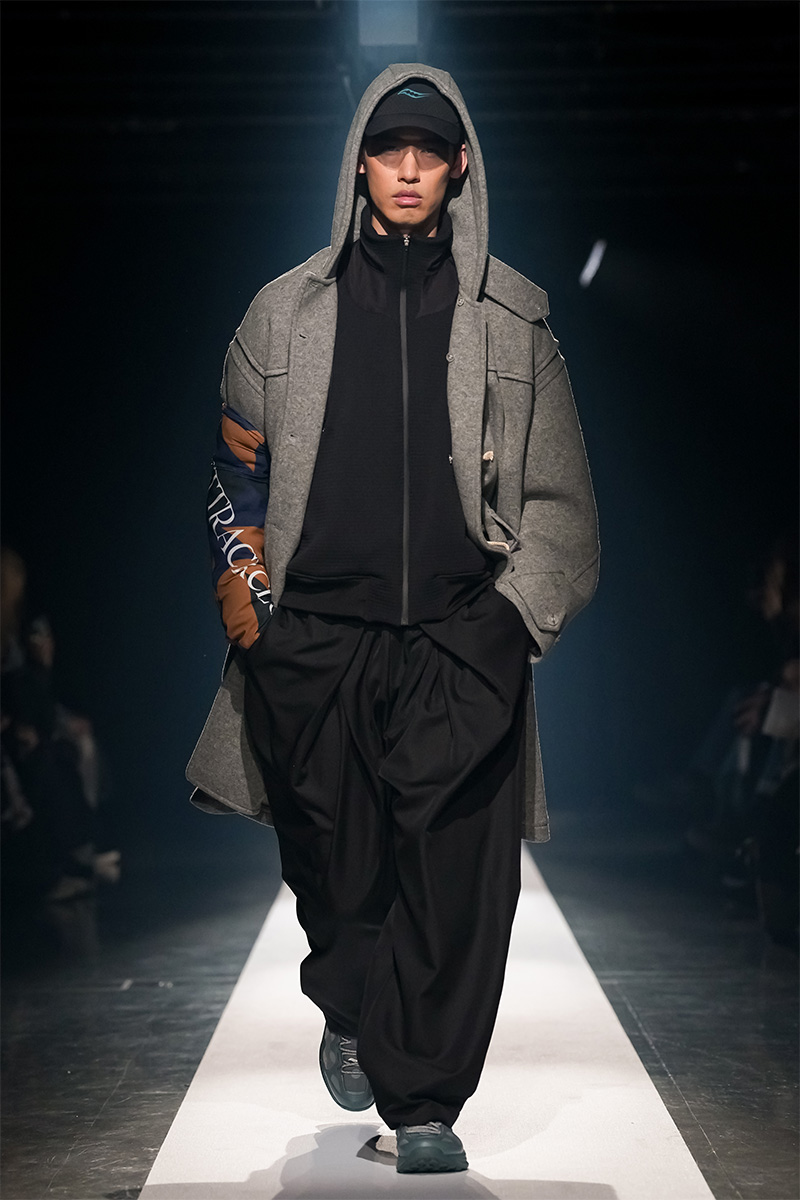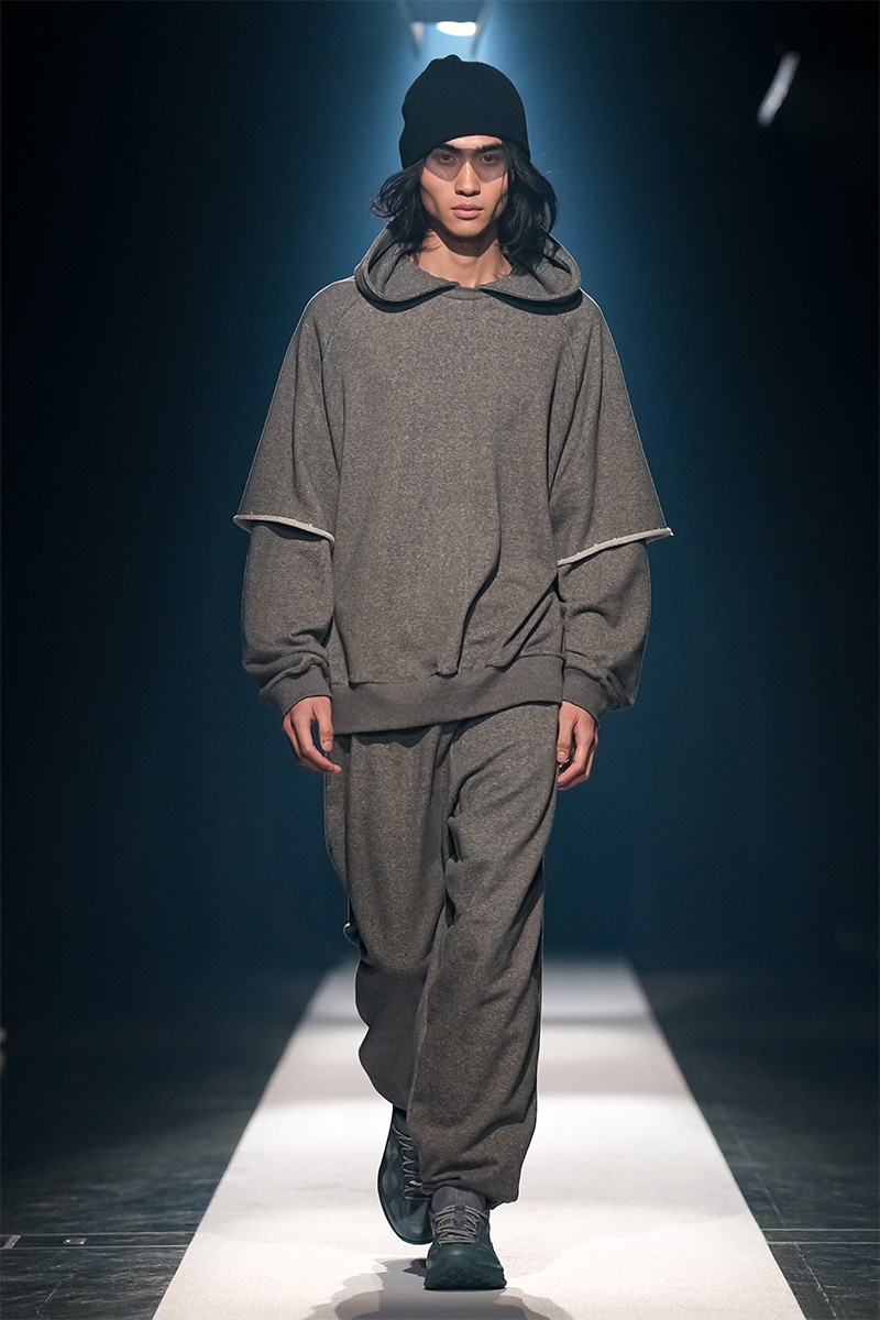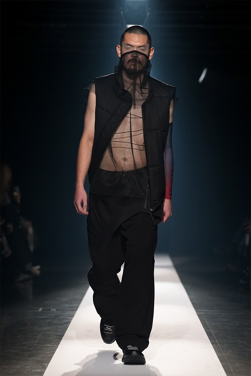 特徴的だったのは、曲線を描く切り替え。身体をなぞるように流れるラインが、素材や色を分断していく。だが、その線は有機的ではない。メッシュ、ナイロン、起毛素材が切り替わることで、人体の構造線として機能しているように見えた。