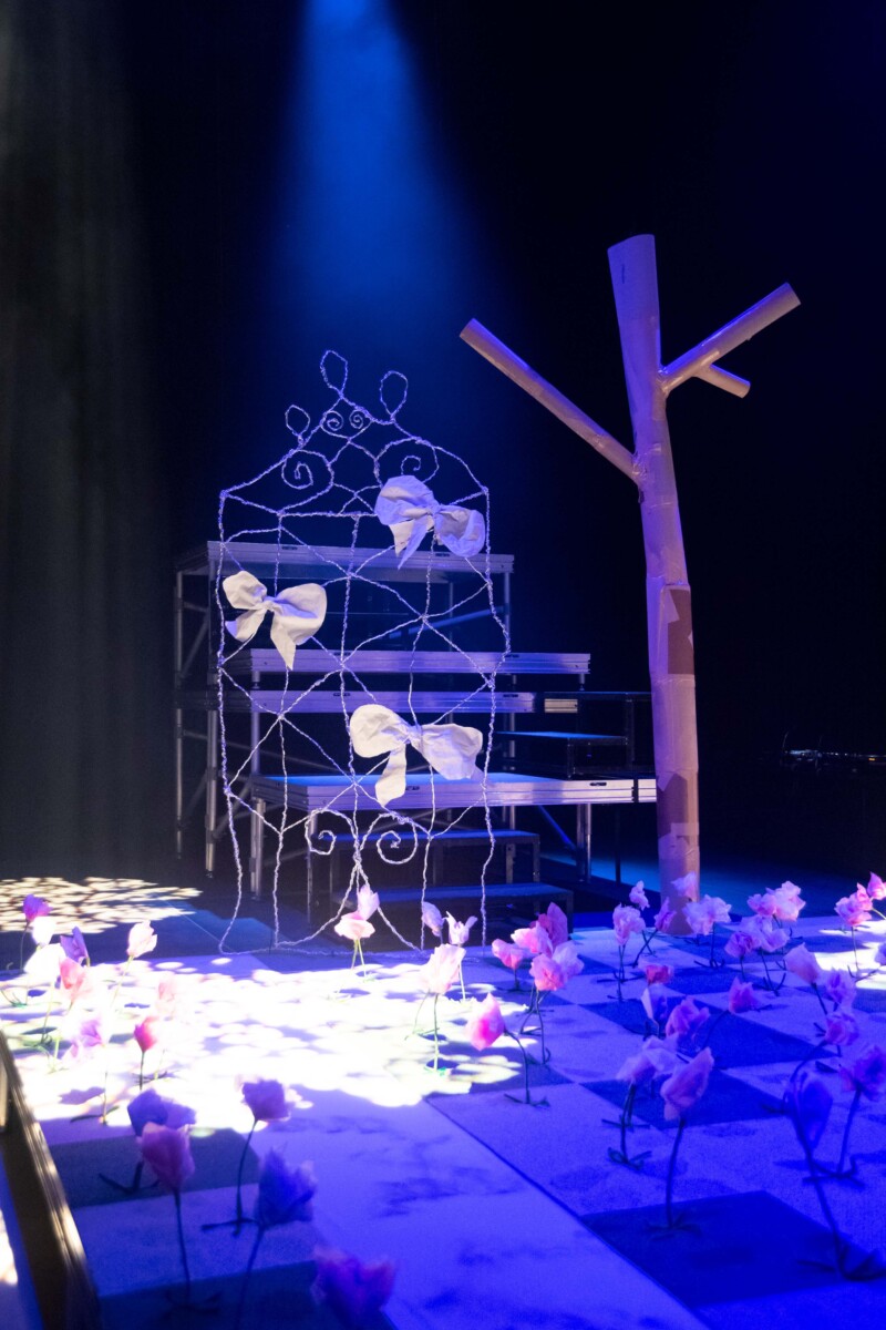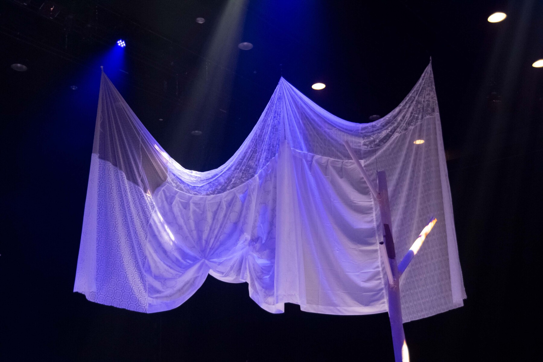 ステージ上に飾られたカーテンは、小林さんがパッチワークで制作をしたもの。