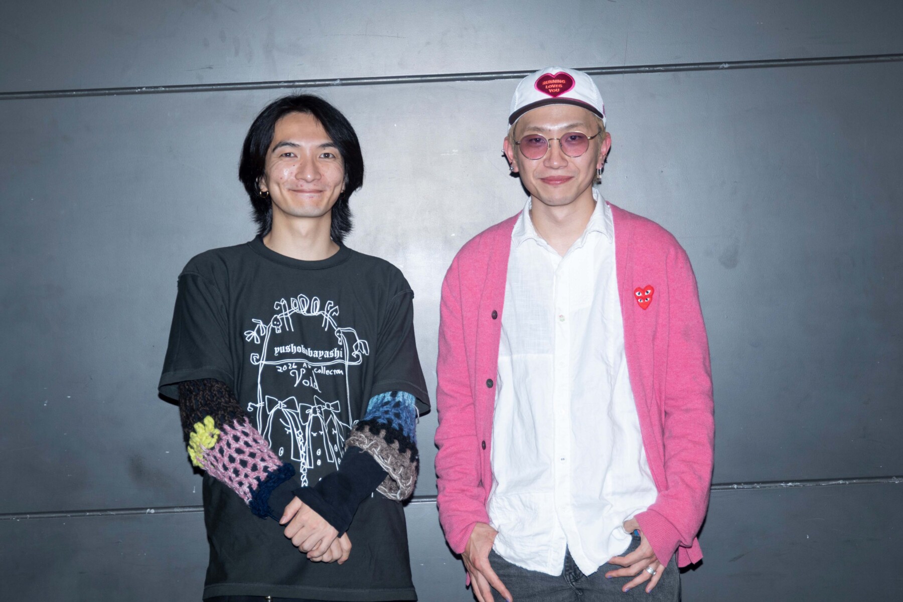 立命館大学の先輩・後輩という出会いから約7年という長い関係性を持つ、デザイナーの小林裕翔さん(写真右)と演出家の岡本昌也さん(写真左)。過去14シーズンとなるユウショウコバヤシのショーの演出を全て手掛けてきた岡本さん。また岡本さんの舞台では、数々の衣装を小林さんが担当してきた。今回は、独立した場所で続けてきたショーから、公式スケジュールへの参加という、ユウショウコバヤシにとっての一つの節目となった。その大切なショーの終了直後のお二人にお話を伺った。
