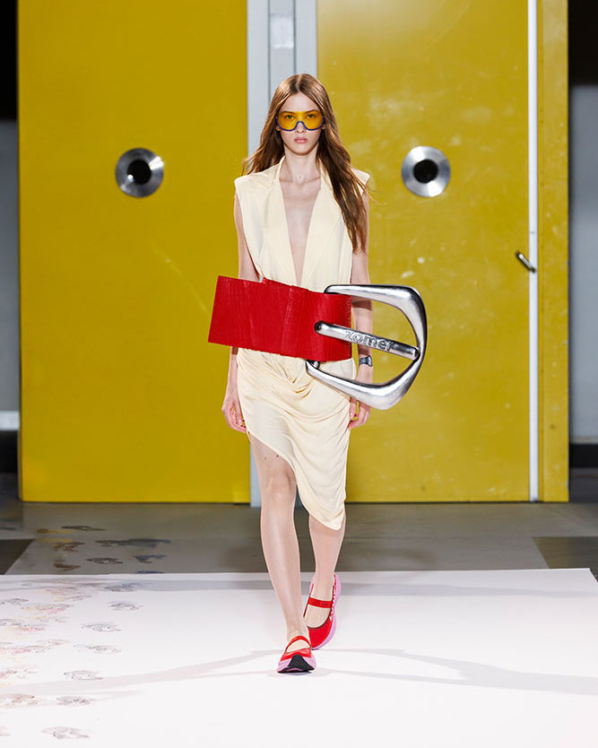デザイナーのダニアルとスタイリストのイムルが手がけるゾマー(ZOMER)は、今シーズンもユーモア全開です。披露されたコレクションでは、プロポーションの遊びをふんだんに取り入れ、超ビッグスケールのアクセサリーが登場。